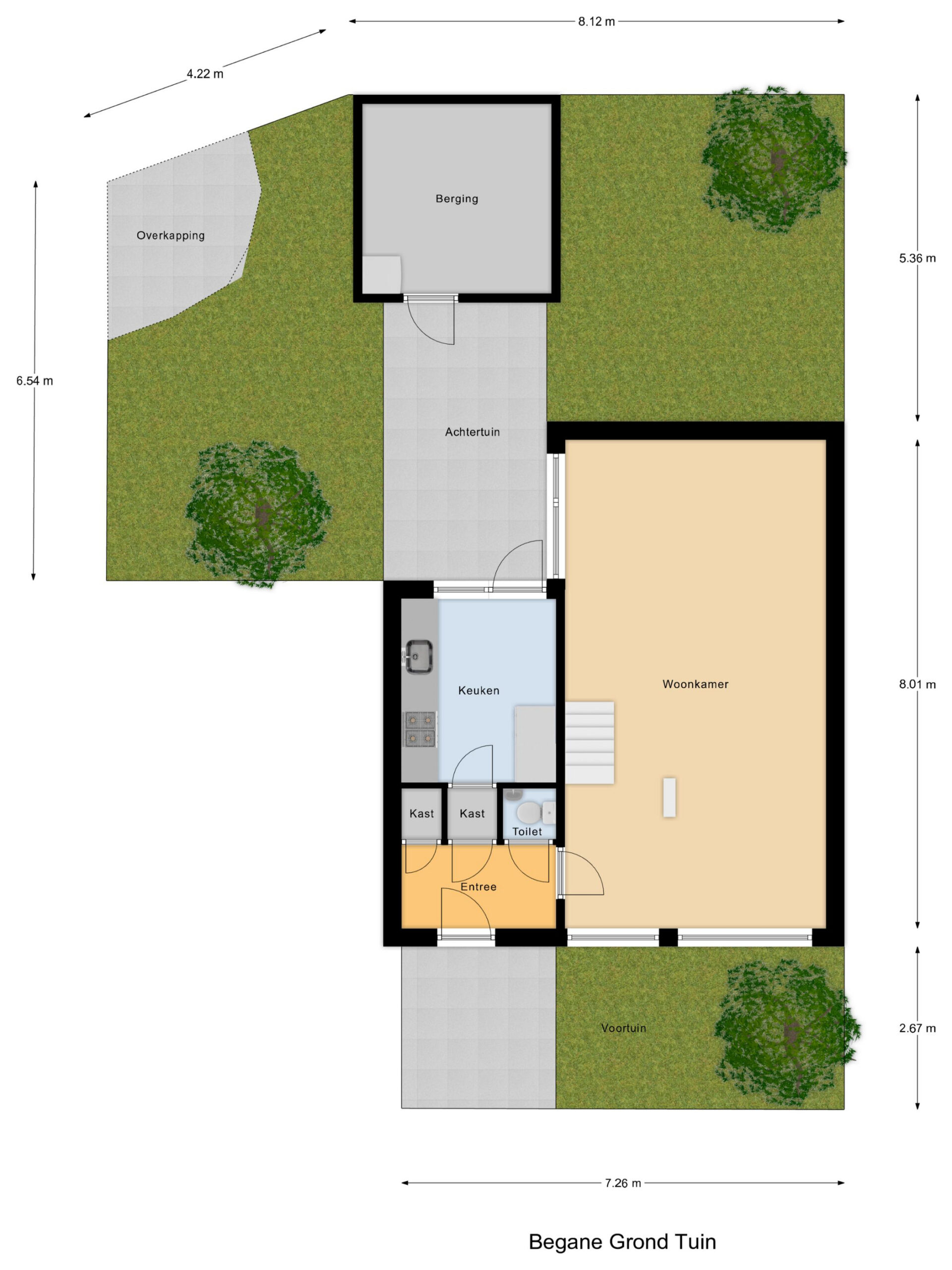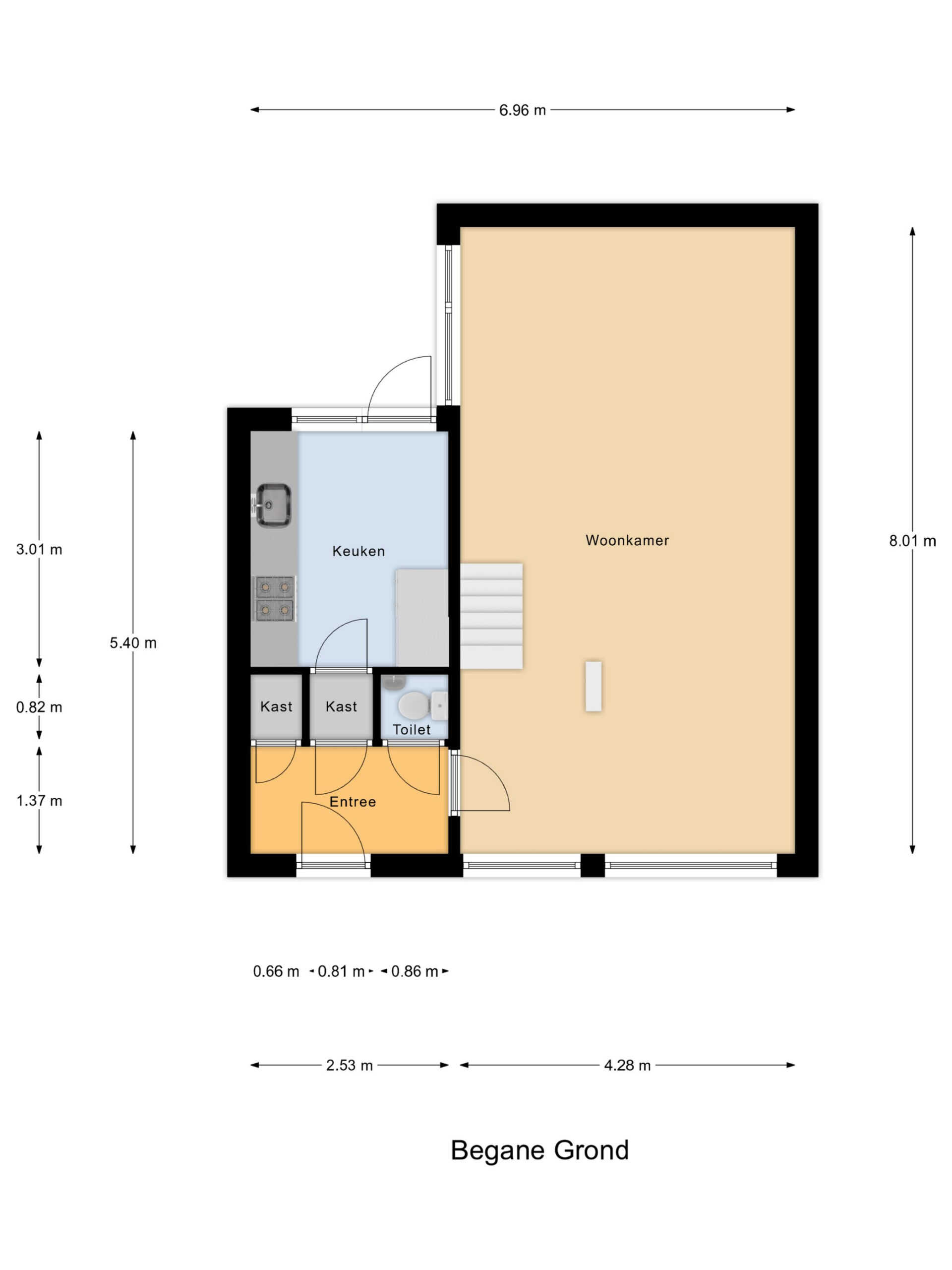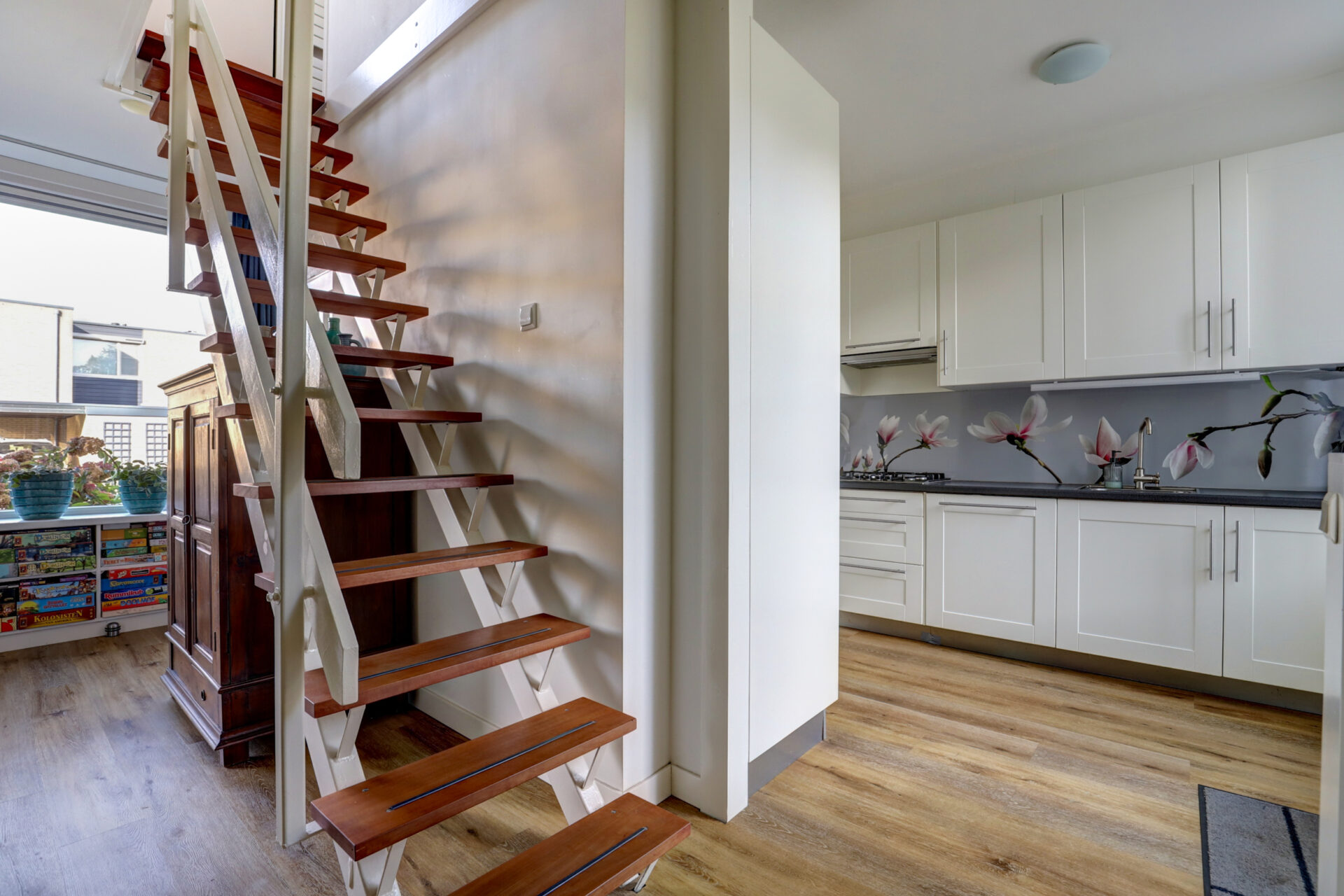 Begane grond: Entree, hal, bergkast en toiletruimte. Speelse lichte woonkamer met grote raampartijen voorzien van een click PVC-vloer en een open trap naar de 1e verdieping. Tuindeur naar terras en achtertuin. Half-open keuken met diverse inbouwapparatuur.