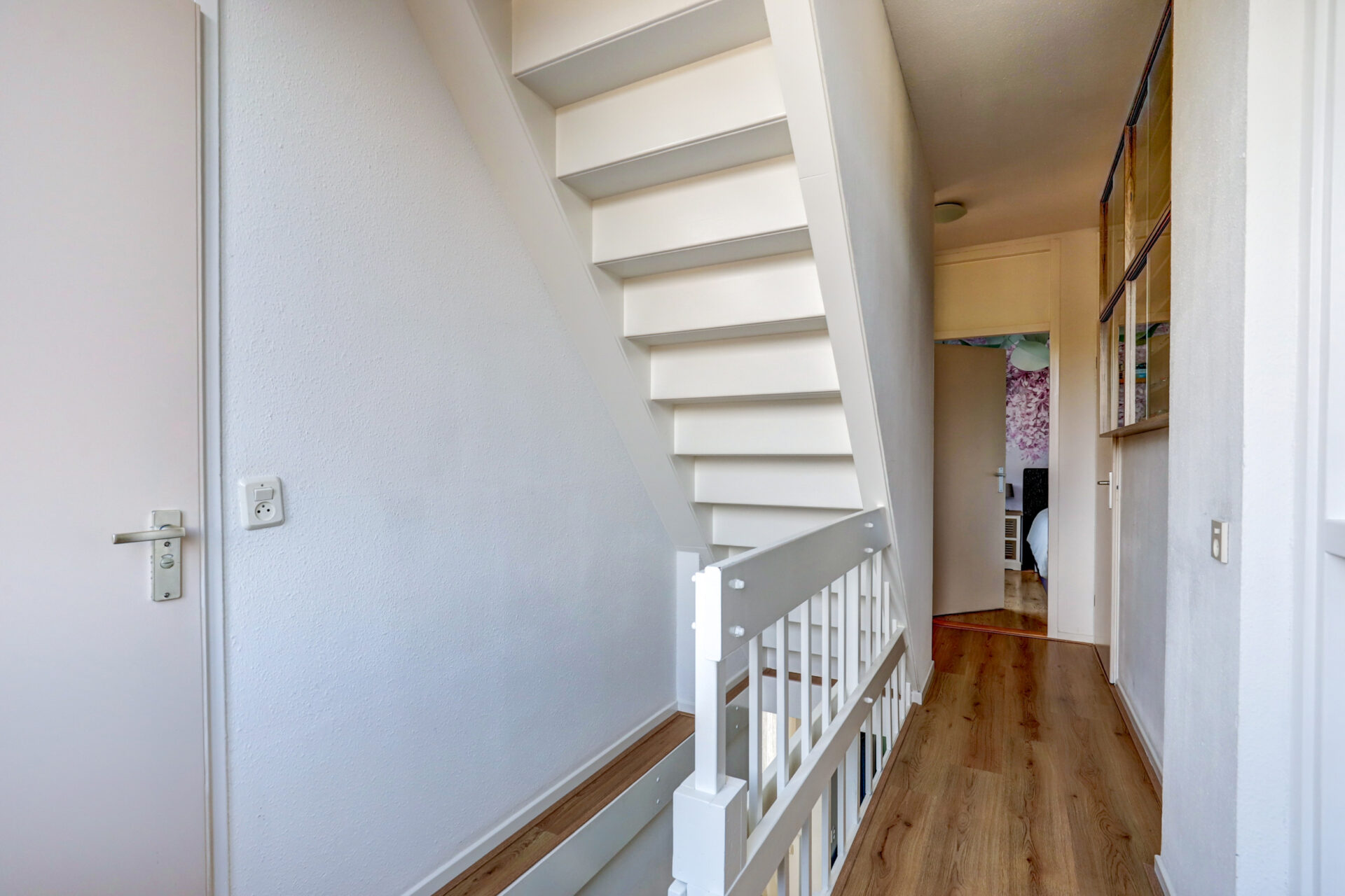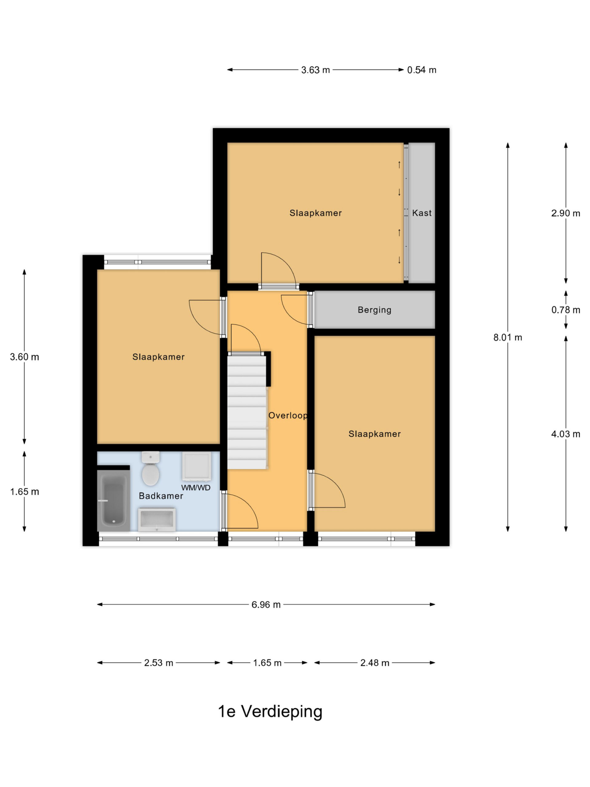 1e verdieping: Overloop met inloopkast en 3 prima slaapkamers waarvan de ouderslaapkamer is voorzien van een vaste kastenwand. Geheel betegelde badkamer met bad/douche combinatie, wastafelmeubel, 2e toilet en aansluiting voor de wasmachine.