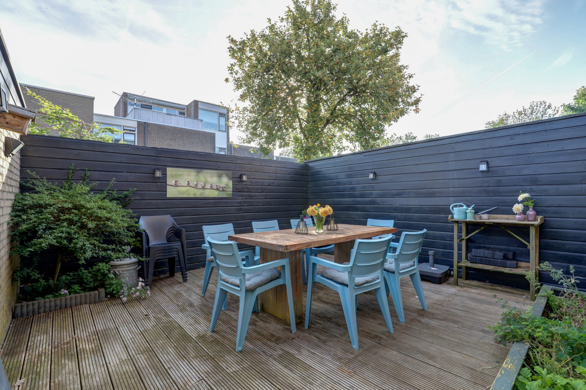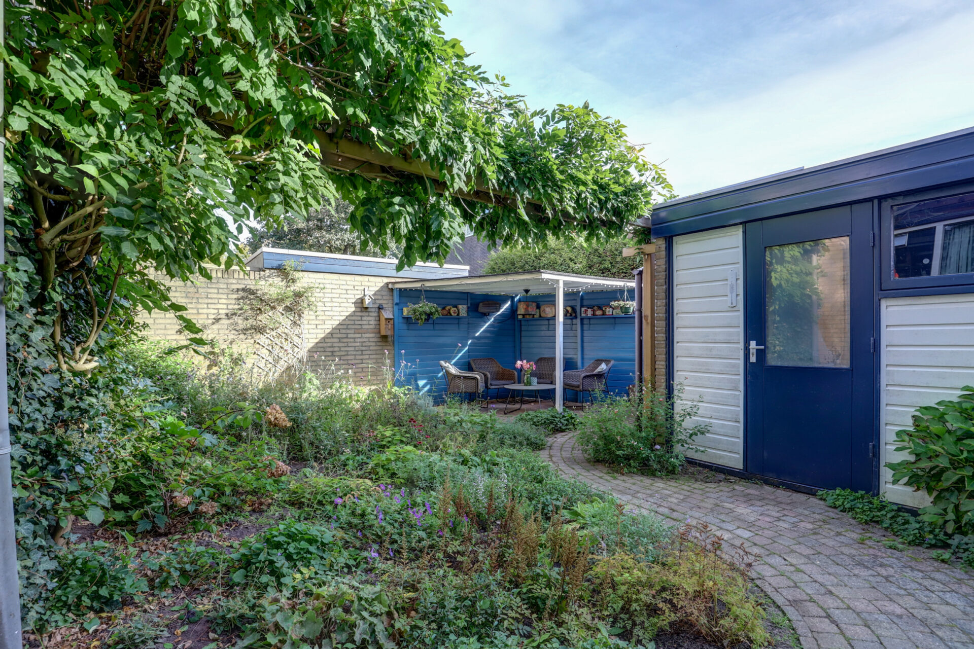 Verzorgde achtertuin met stenen berging en achterom. tuin is besloten wat zorgt voor de nodige privacy.