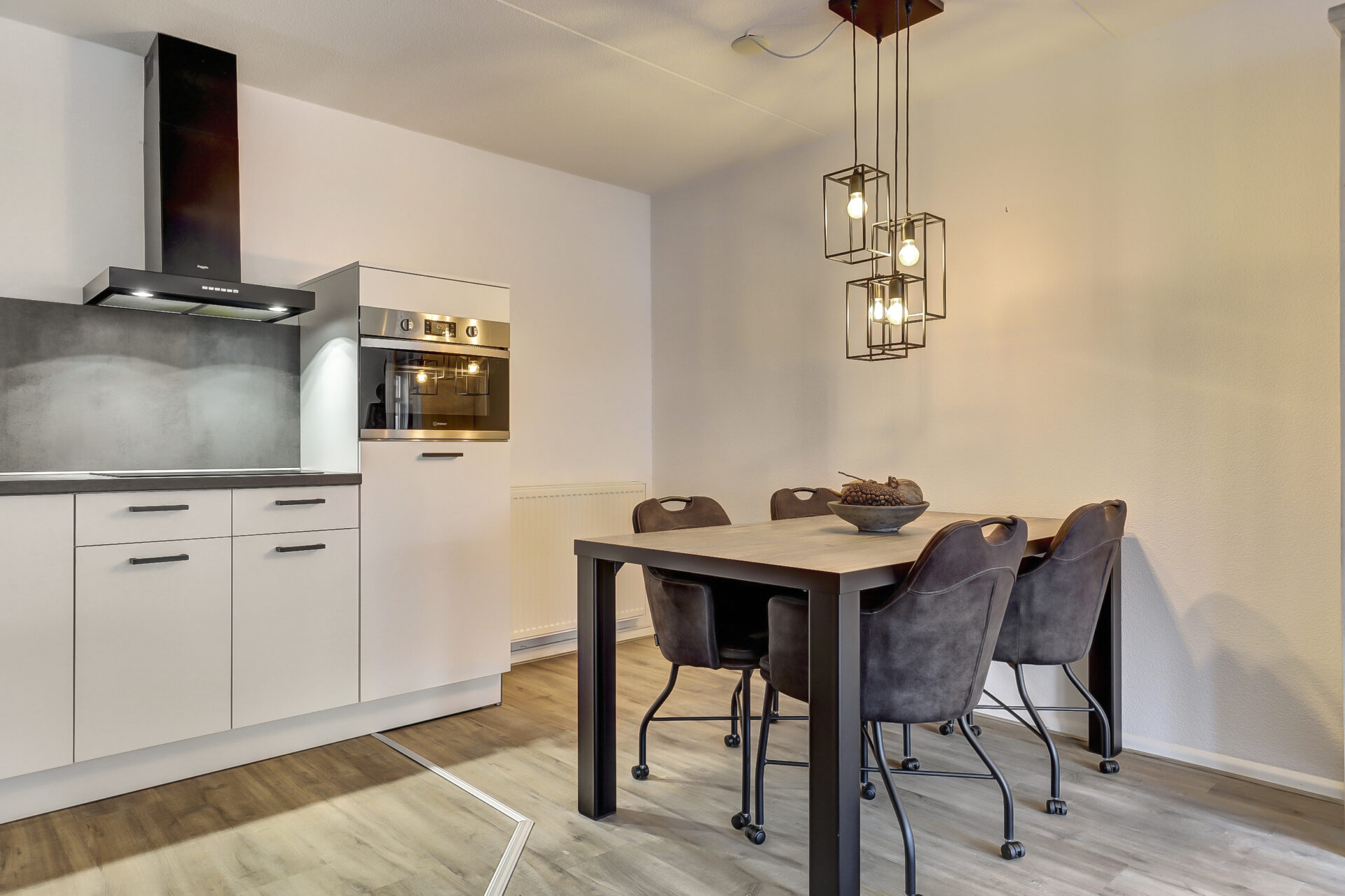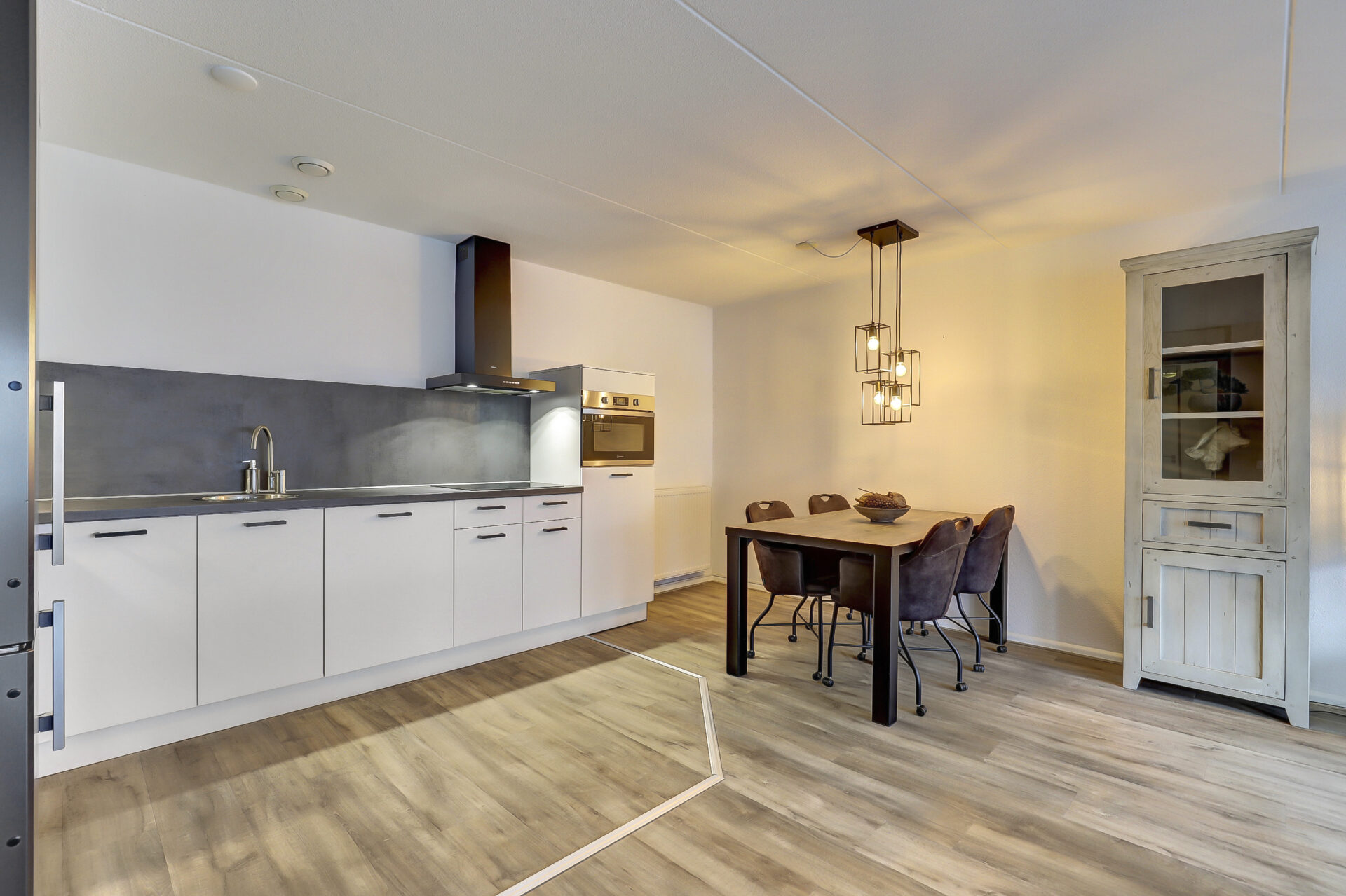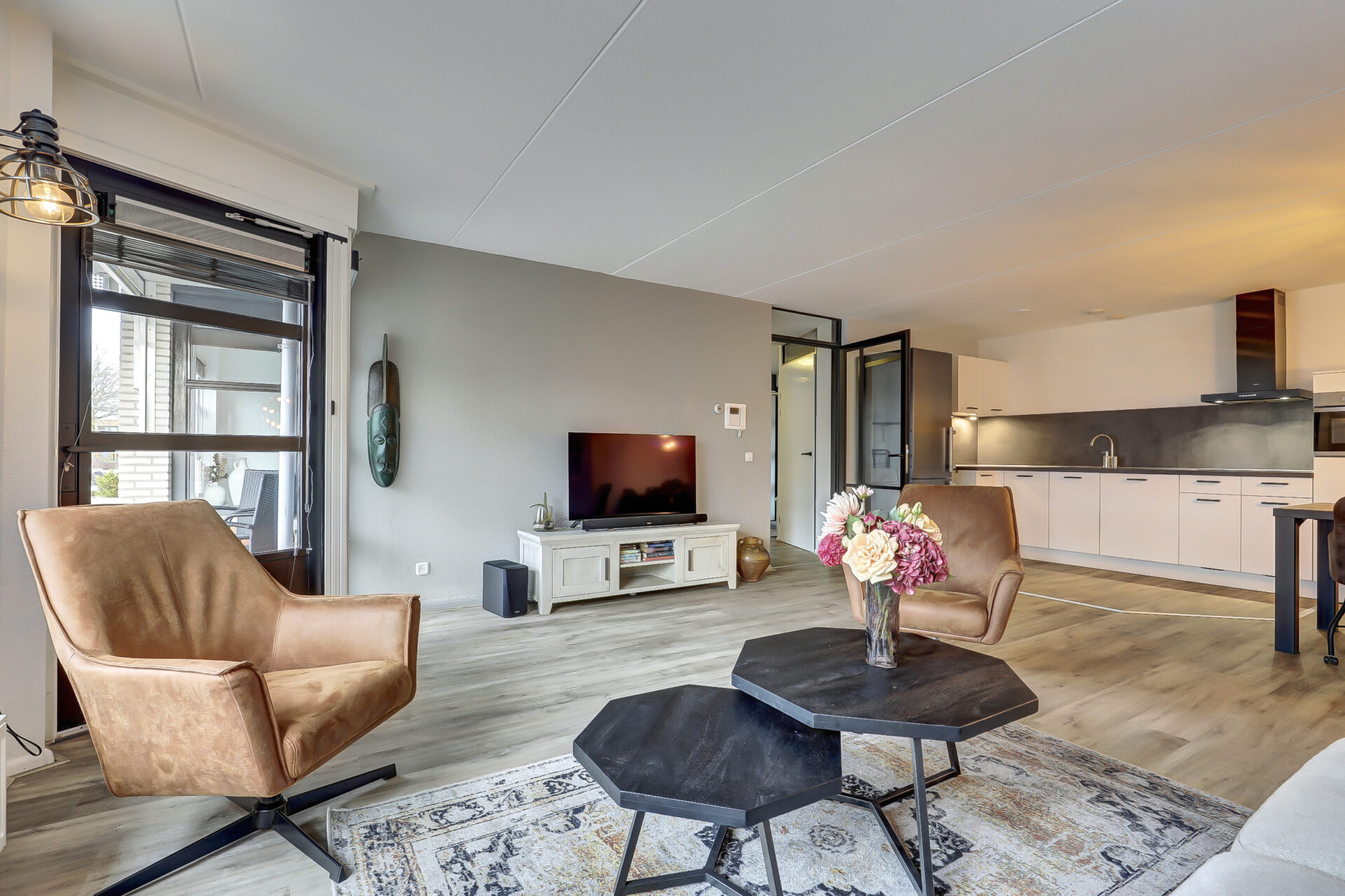 Lichte woonkamer met mooie toegang tot het deels overdekte balkon gelegen op het zuidwesten met elektrische zonnescherm. Moderne open keuken in een L-opstelling en voorzien van diverse inbouwapparatuur.