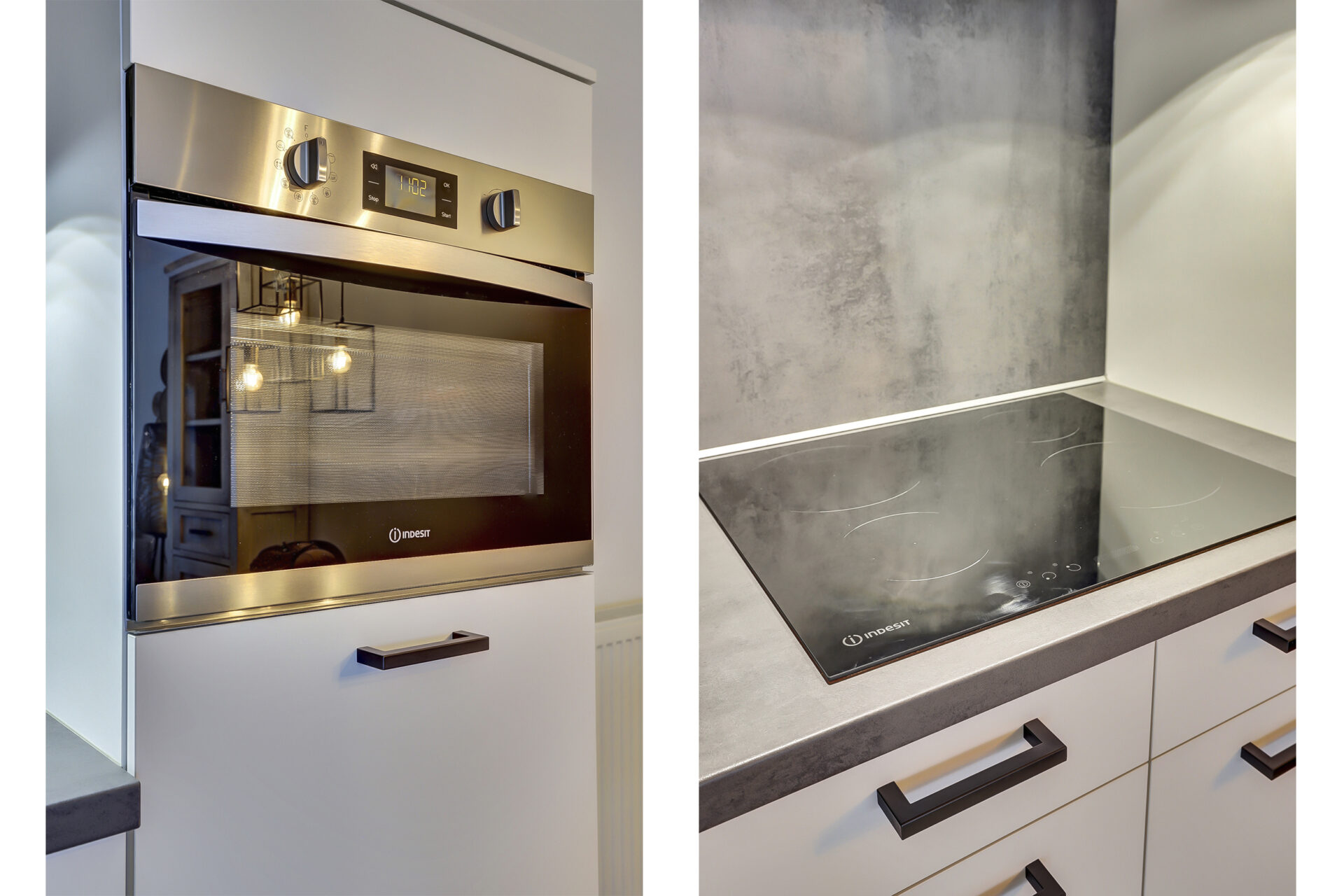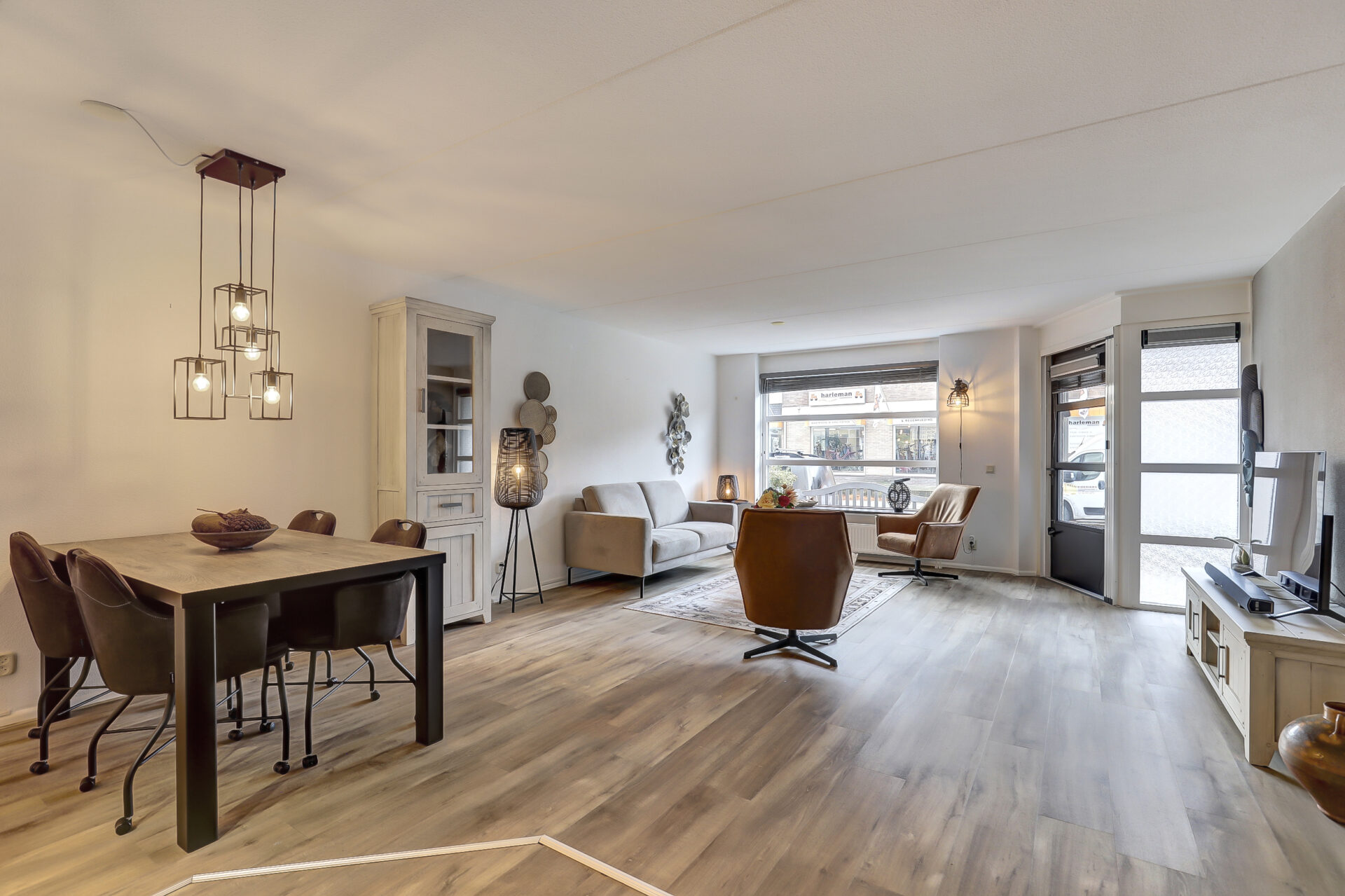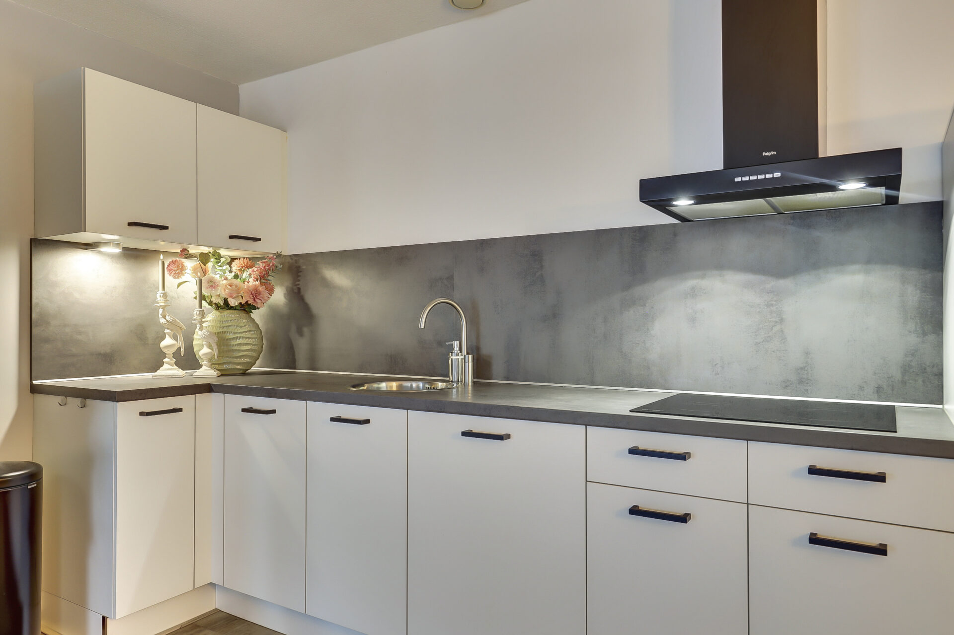 Lichte woonkamer met mooie toegang tot het deels overdekte balkon gelegen op het zuidwesten met elektrische zonnescherm. Moderne open keuken in een L-opstelling en voorzien van diverse inbouwapparatuur.