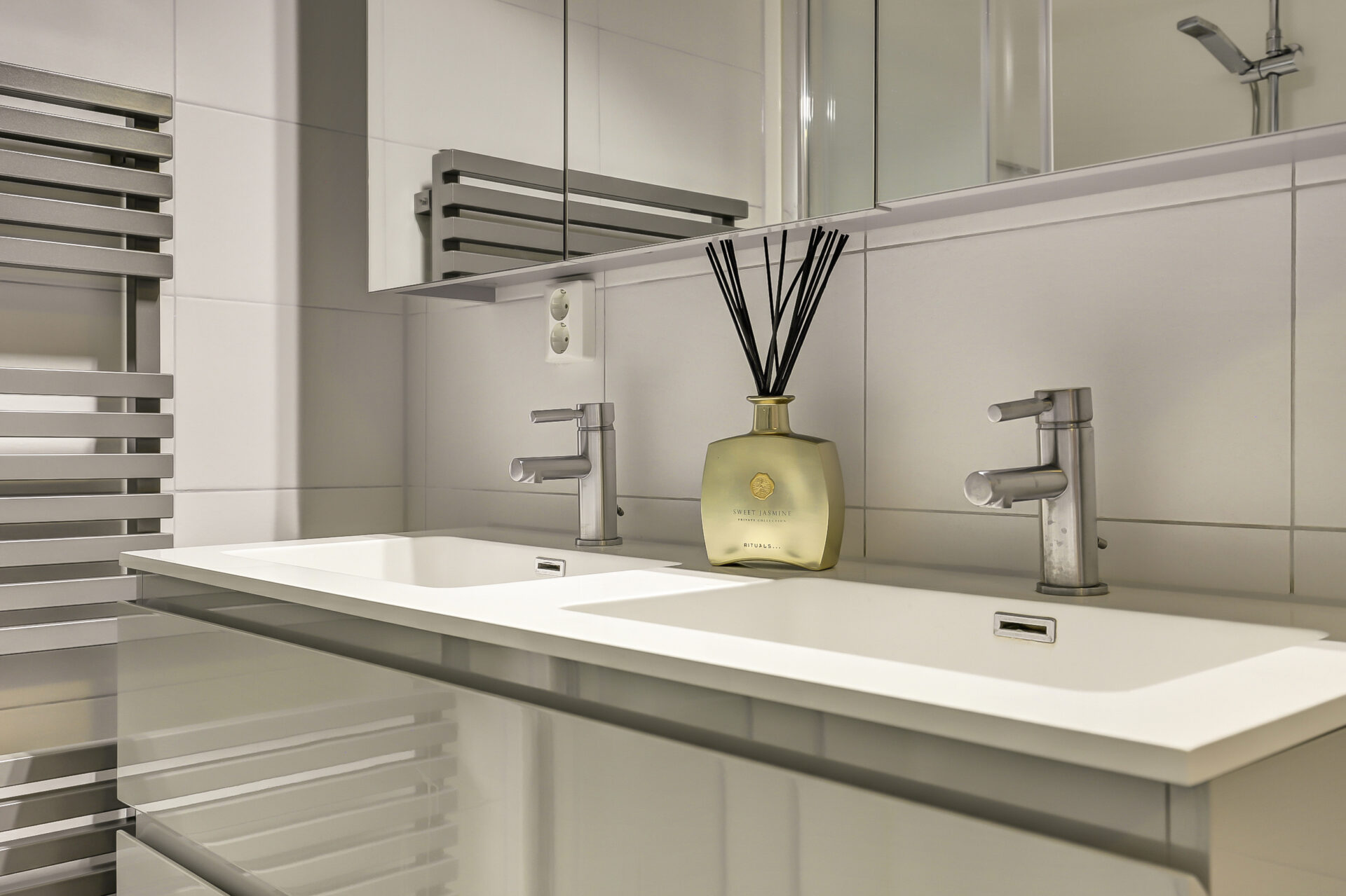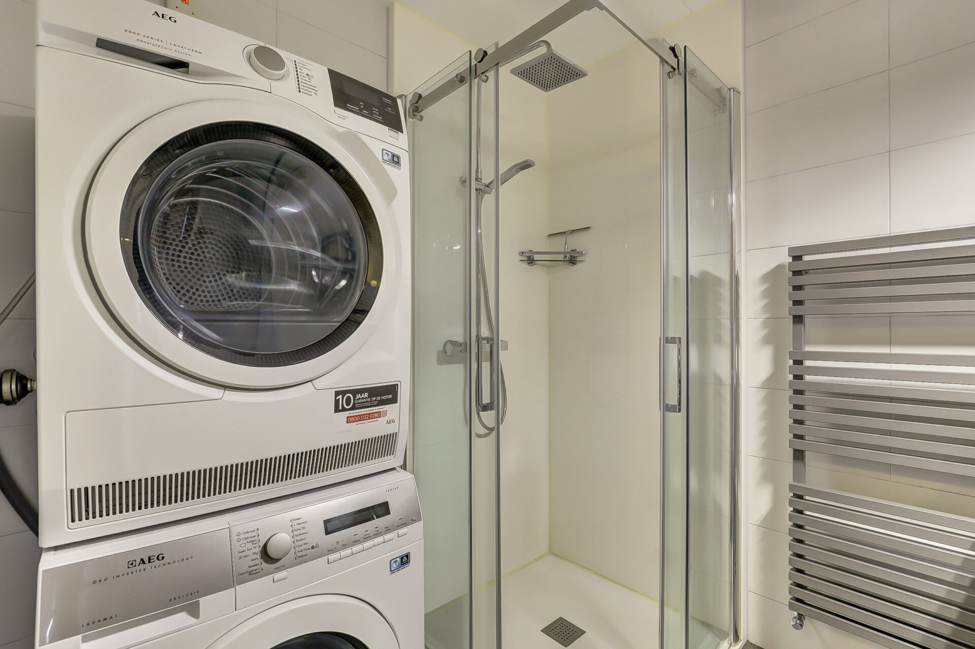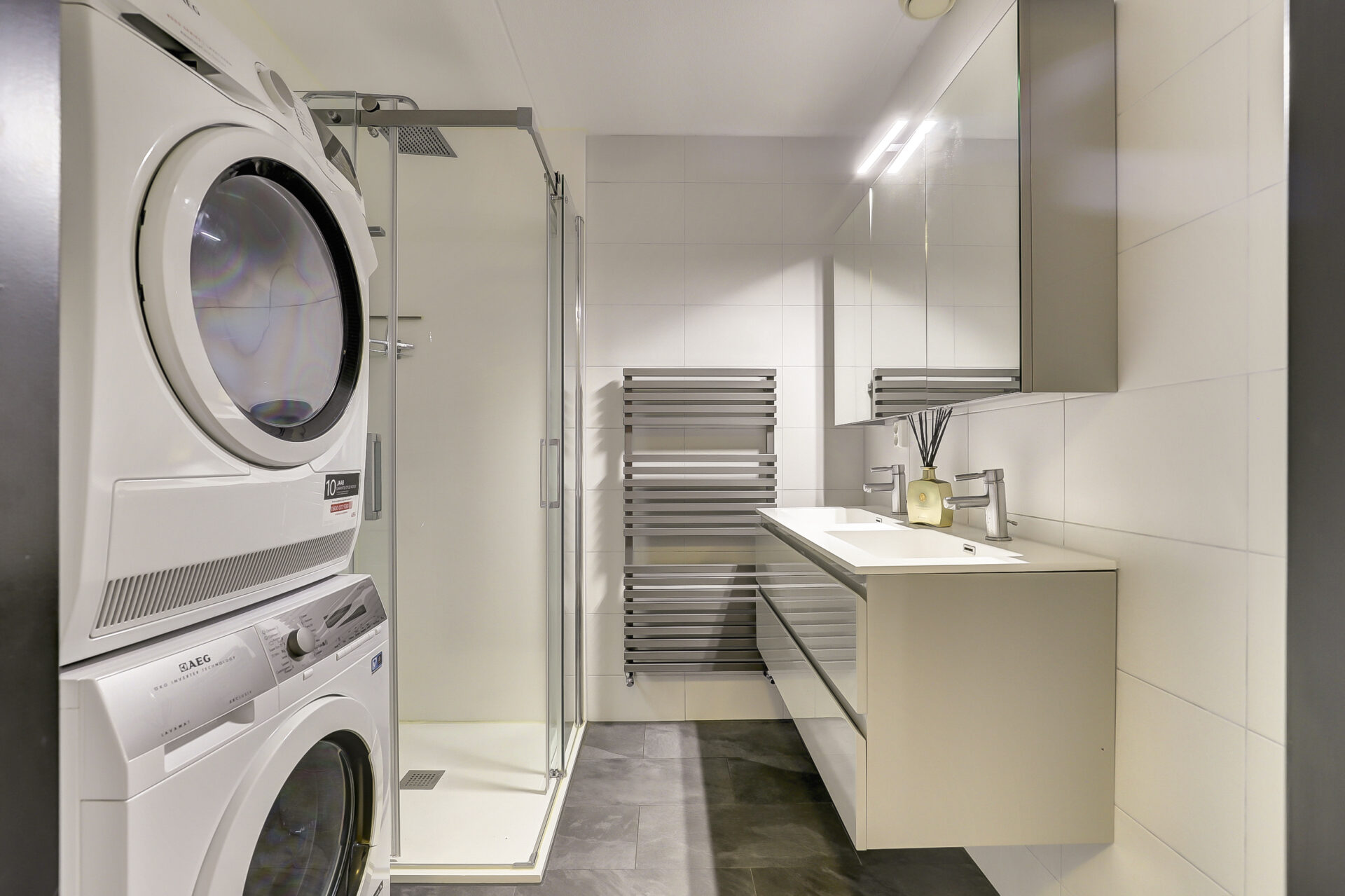 Totaal 2 slaapkamers, respectievelijk 13 m2 en 7 m2 groot en een badkamer met een inloopdouche, wastafelmeubel, designradiator en aansluitingen voor de wasmachine en droger.