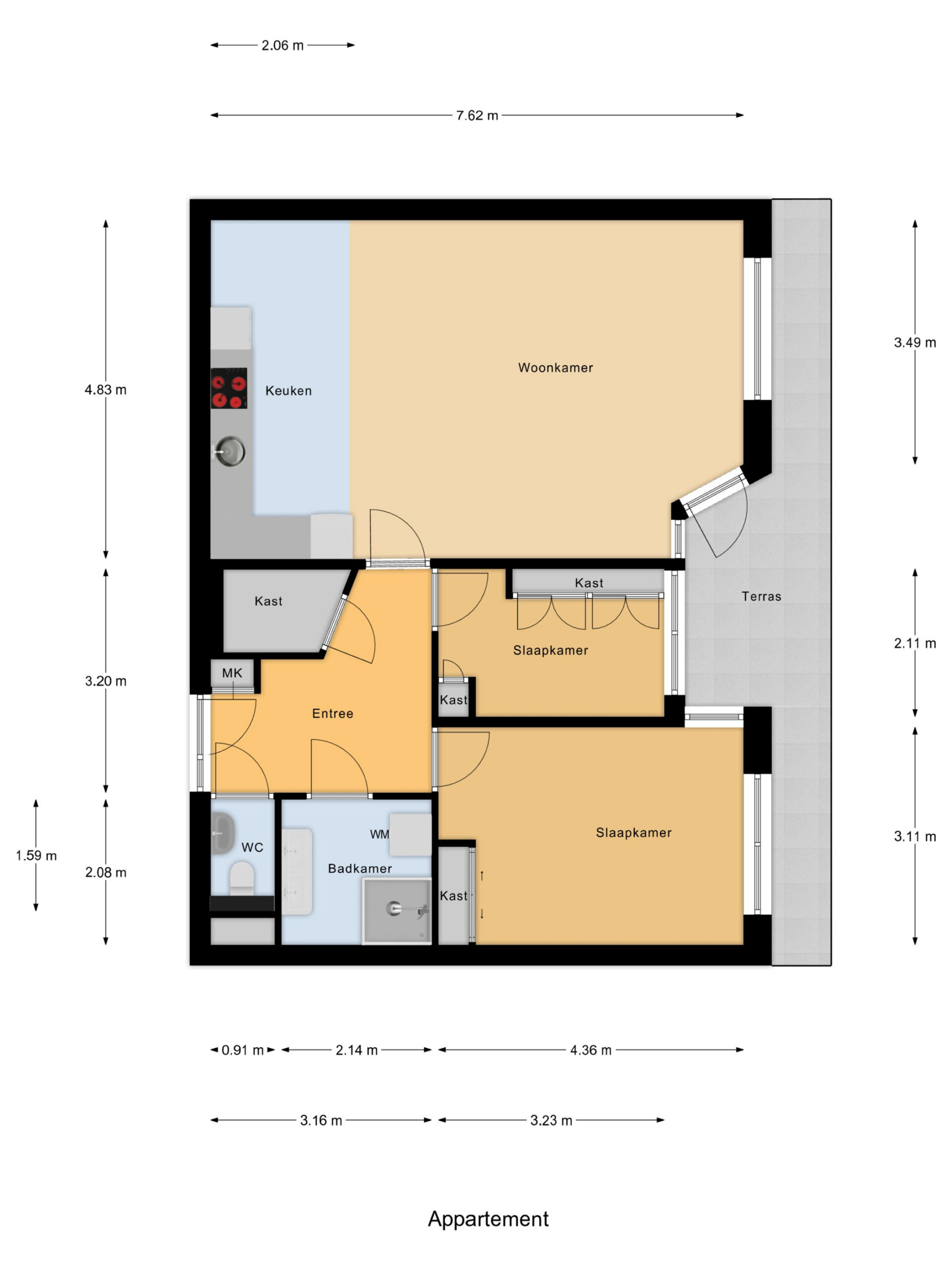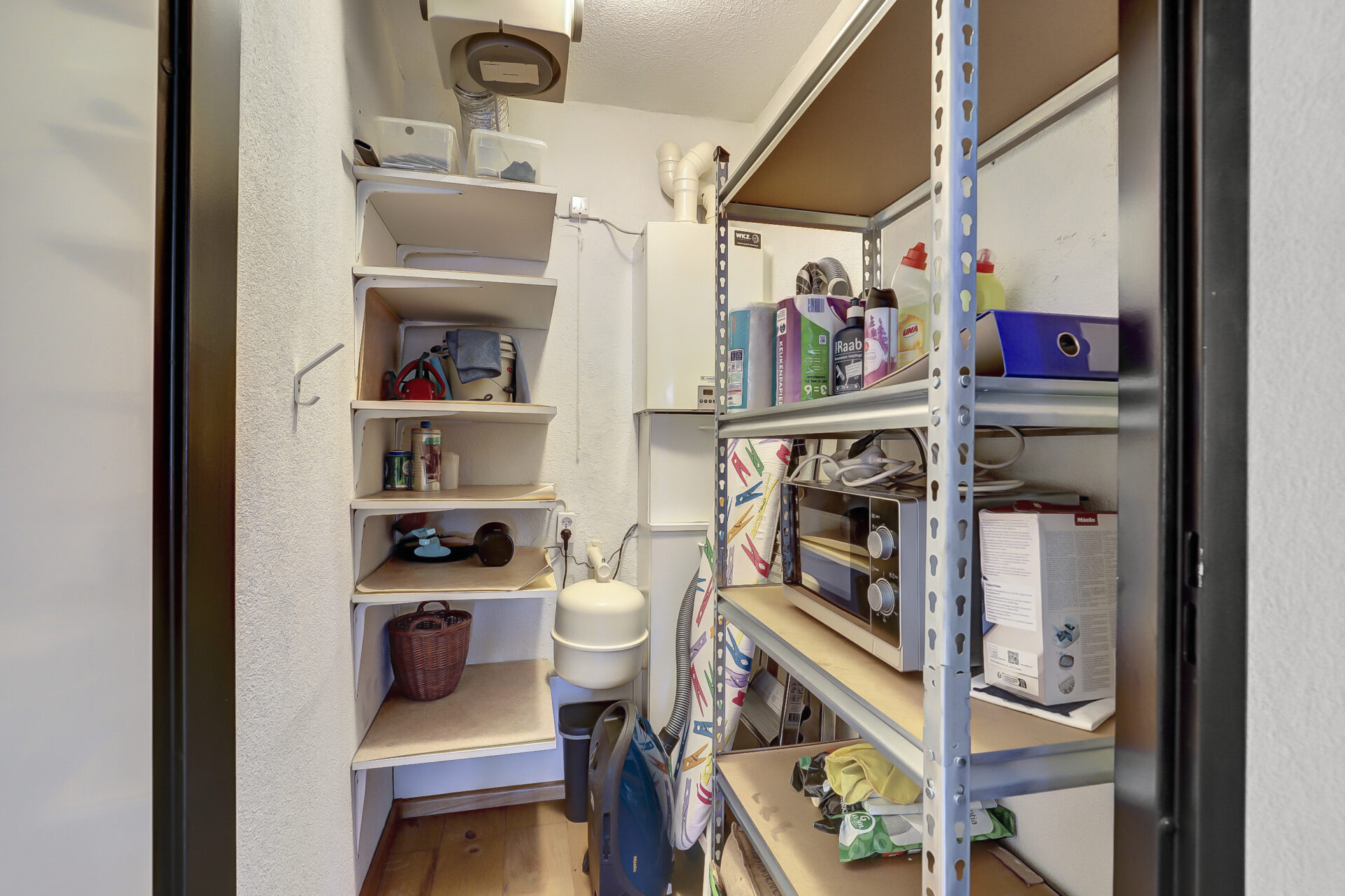 Indeling appartement: ruime entree (inpandig en overdekt), hal, toilet met fonteintje, meterkast met glasvezel aansluiting, keurige inpandige berging met opstelplaats voor de CV-combiketel en mechanische ventilatie.