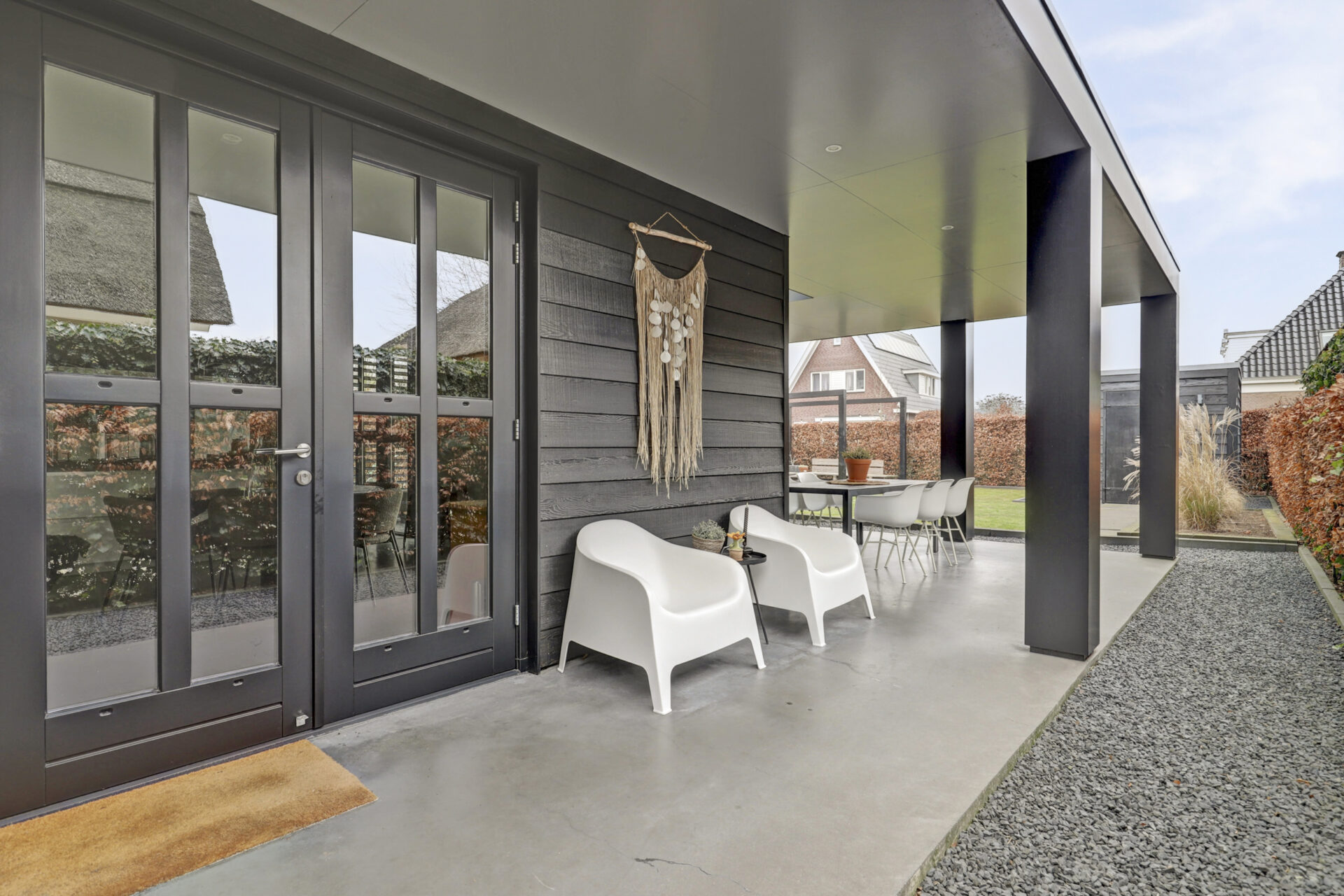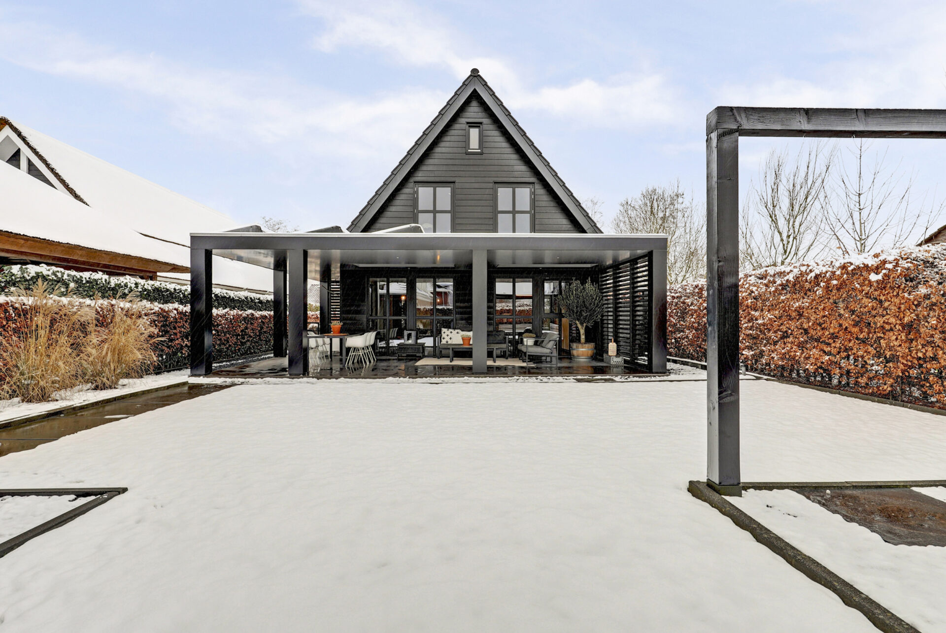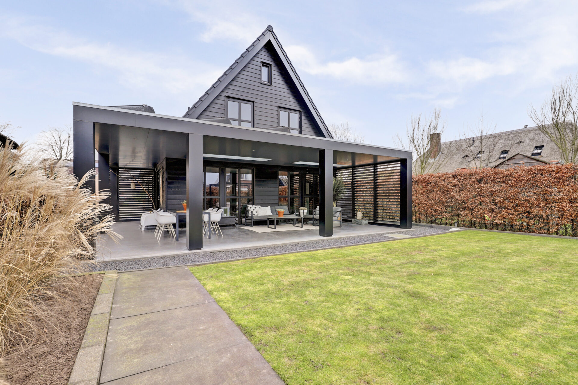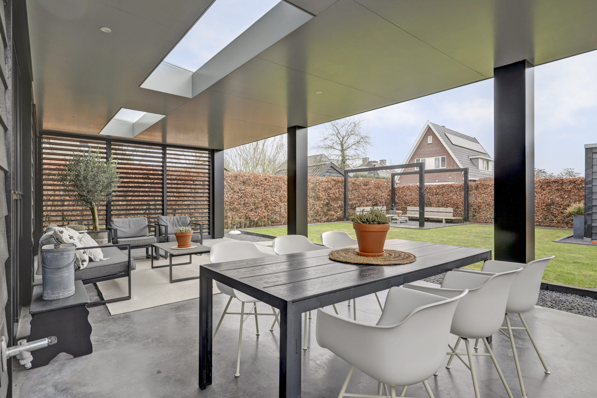 Aan de achterzijde bevindt zich een royale terrasoverkapping die naadloos aansluit op de woning en een verlengstuk vormt van de woonkeuken. Hier is het in alle seizoenen heerlijk vertoeven — van lange zomeravonden tot knusse winterdagen. Deze woning is volledig instap klaar en biedt een exclusieve woonbeleving voor wie waarde hecht aan kwaliteit, comfort en uitstraling.