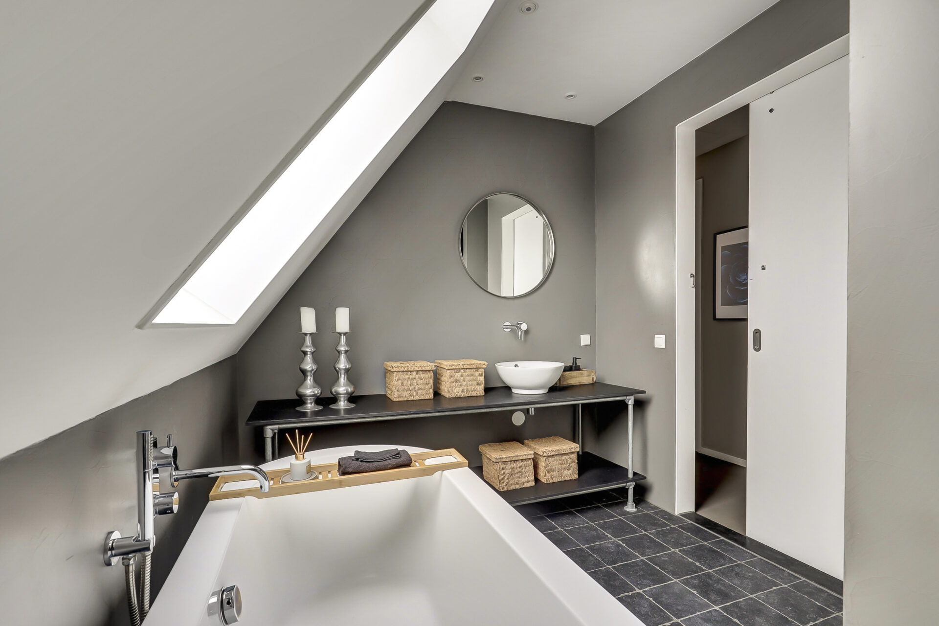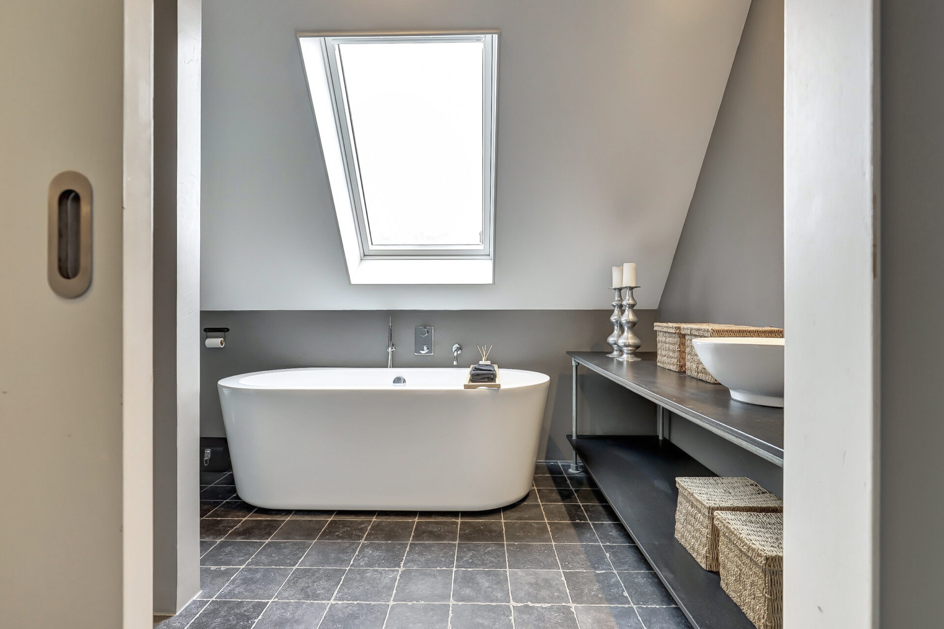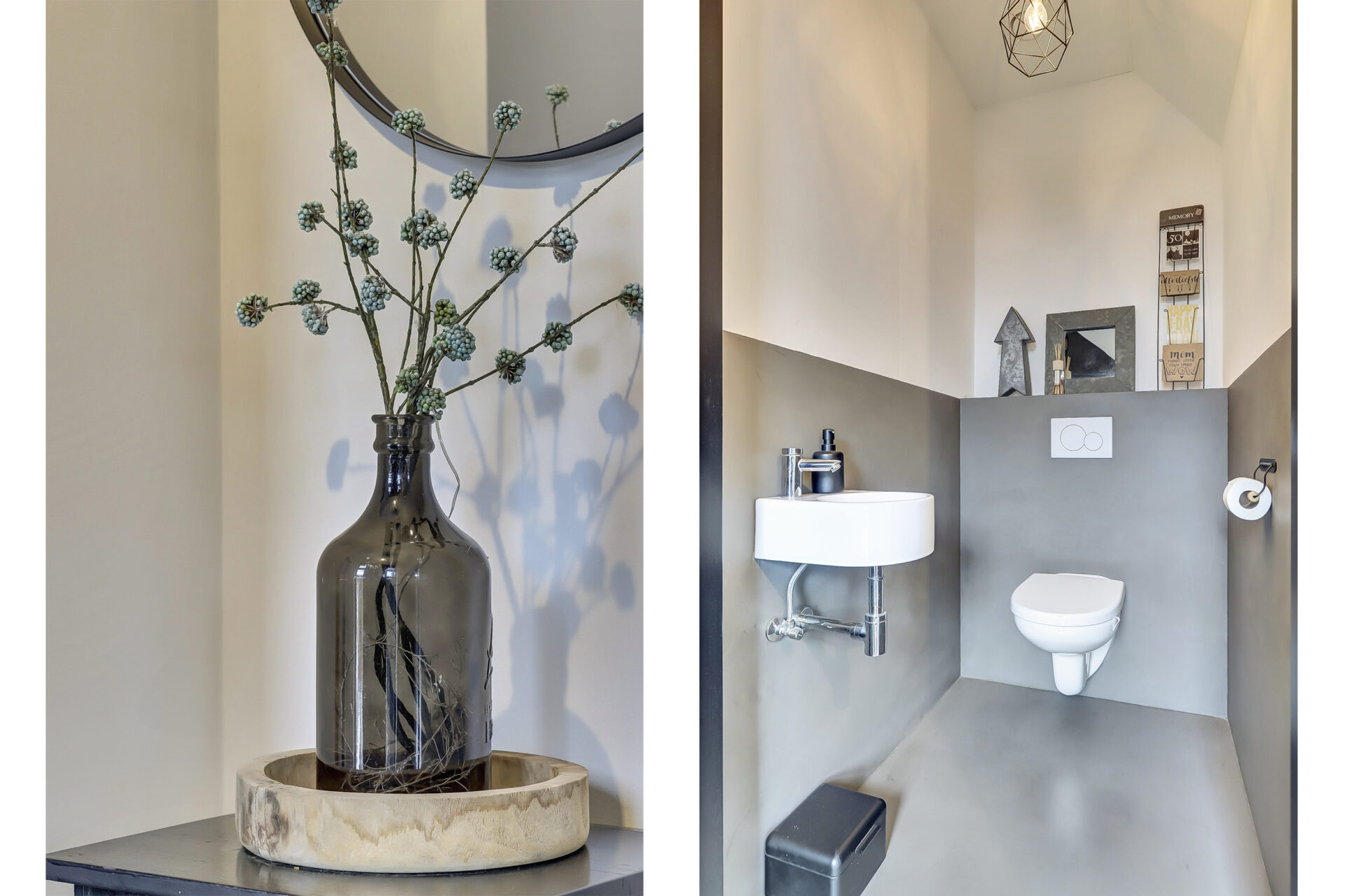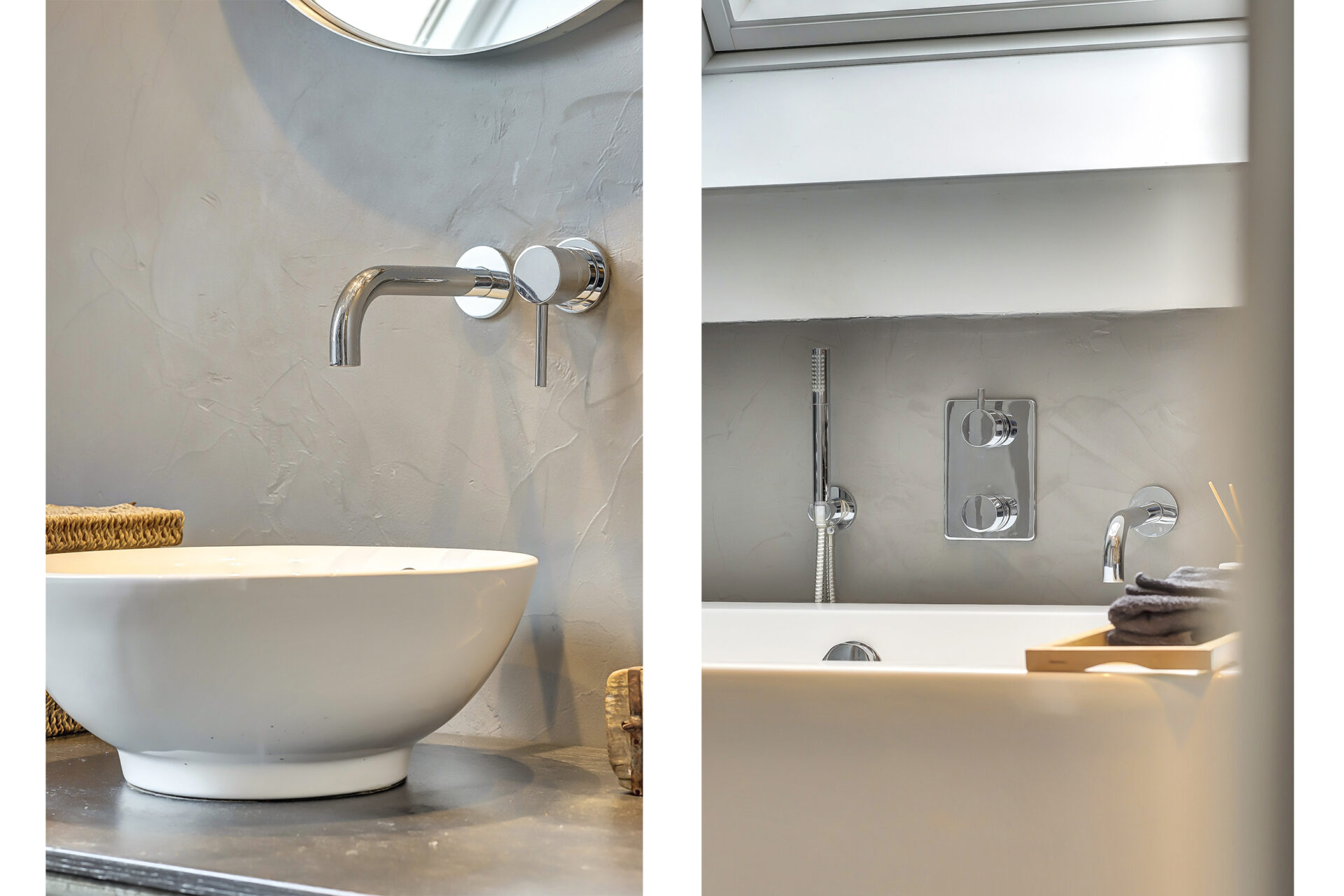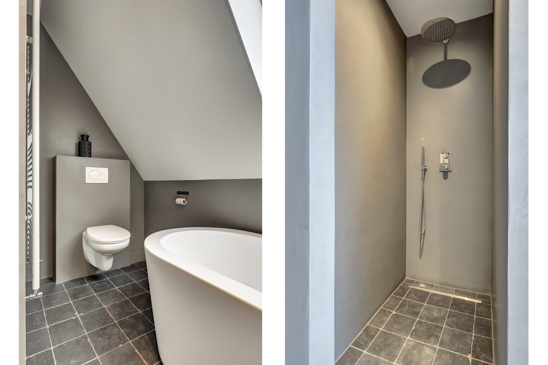 Luxe badkamer met beton ciré wandafwerking en voorzien van een ruime inloopdouche, separaat vrijstaand ligbad, 2e toilet en wastafelmeubel. Verder is er vloerverwarming aanwezig en inbouwspots in het plafond.