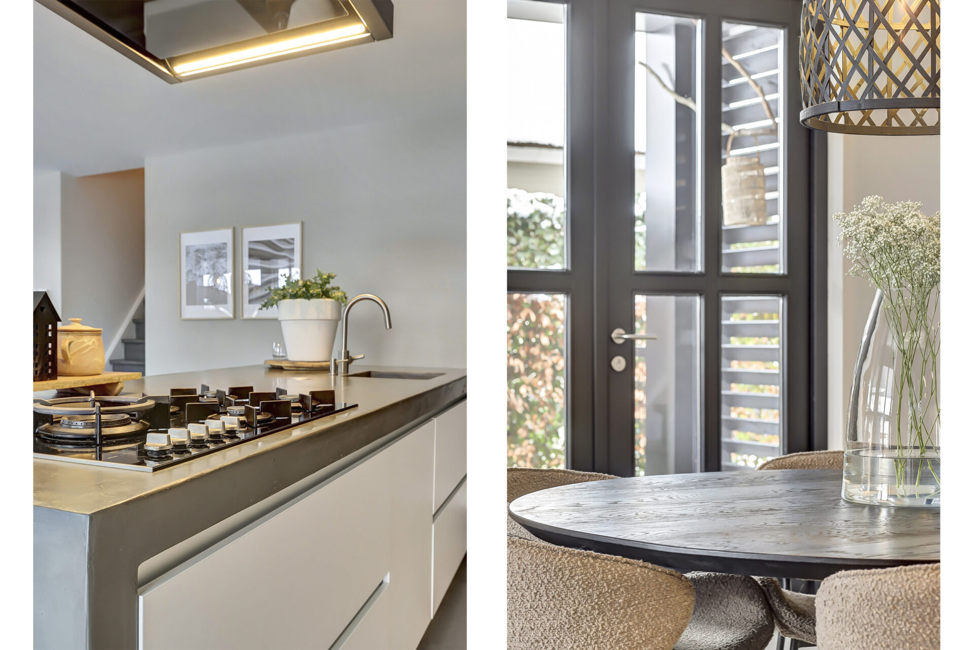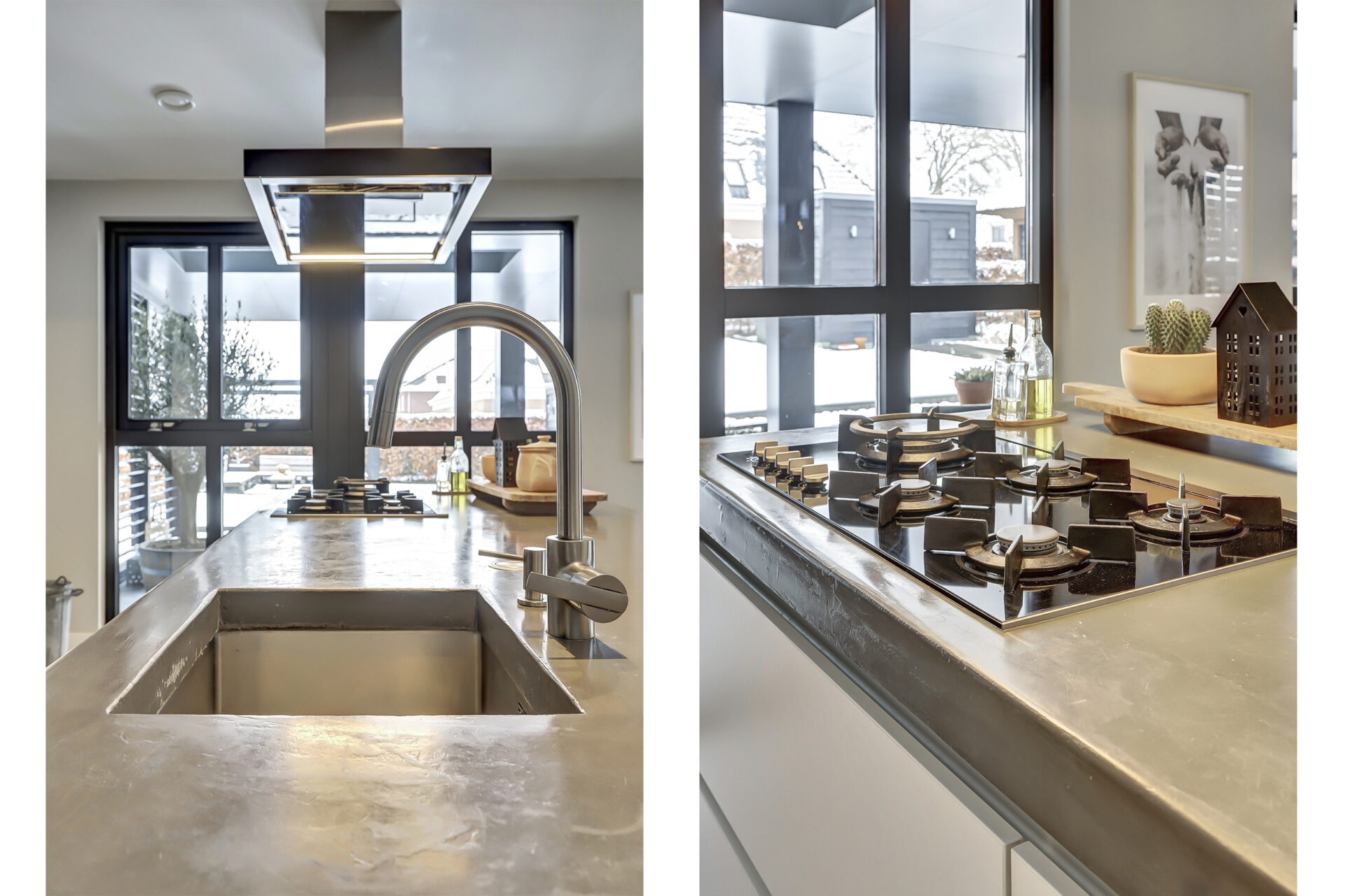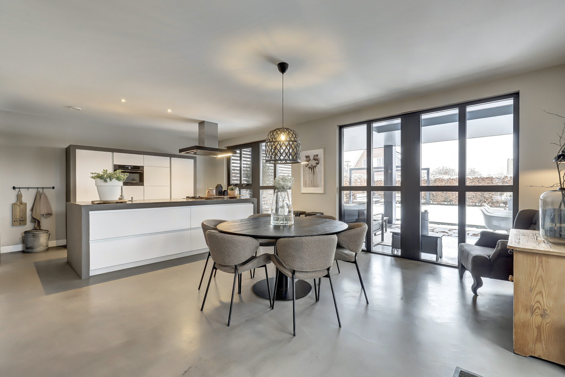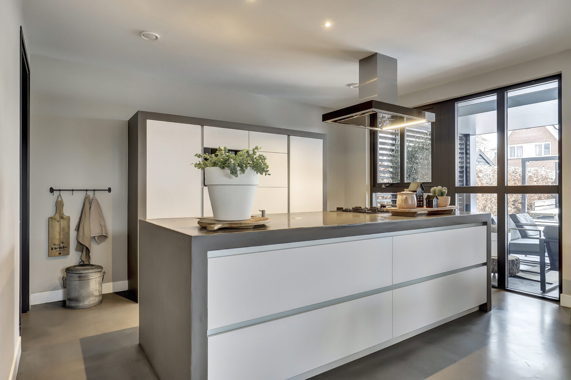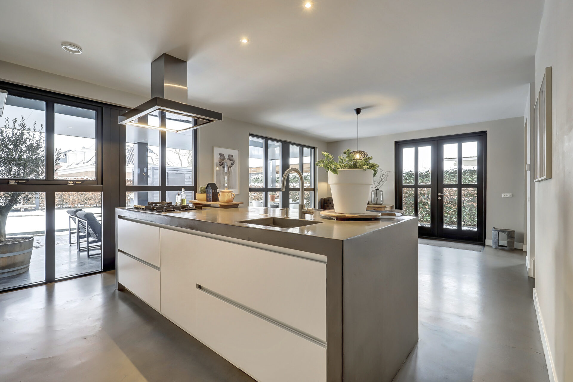 Ruime woonkeuken met kookeiland voorzien van een mooi betonlook werkblad. Het geheel is voorzien van alle gemakken en uitgevoerd in lichte kleurstelling. In combinatie met de gietvloer zorgt dit voor een fraaie industriële look maar straalt het ook rust en ruimte uit. Vanuit de keuken heb je mooi zicht op de tuin en de overdekte veranda aan die deels doorloopt aan de zijkant van de woning. Met de tuindeuren open wordt de veranda een geheel met de woning.