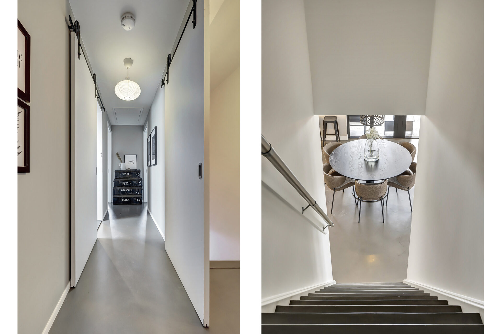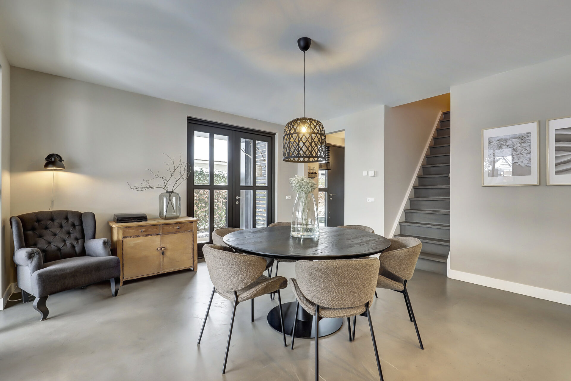 Begane grond: Zij-entree, lichte hal, praktische schuifdeur met glas wat een mooie doorkijk geeft vanuit de woonkamer naar de woonkeuken en visa versa. Aan de voorzijde een royale zitkamer voorzien van vloerverwarming met beton ciré vloer. Deze vloerafwerking loopt naadloos door over de gehele begane grond.