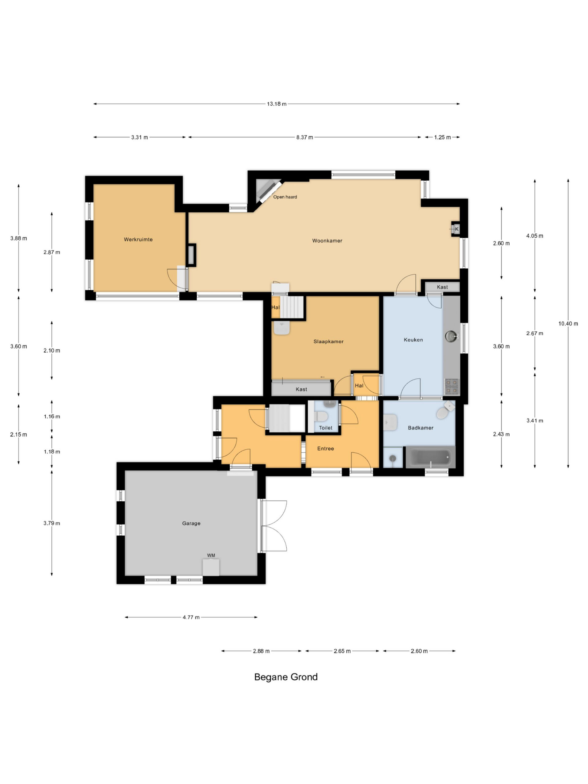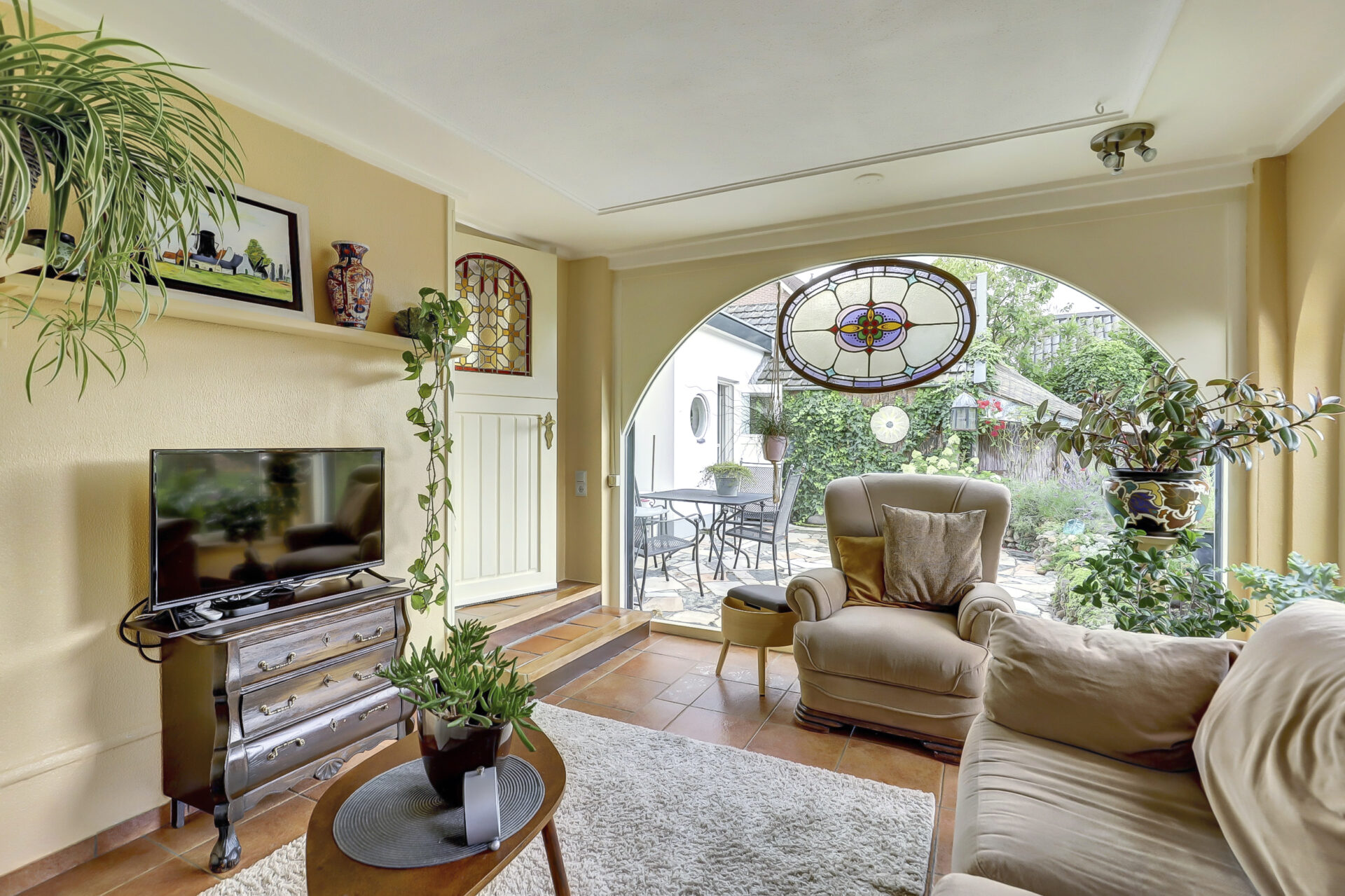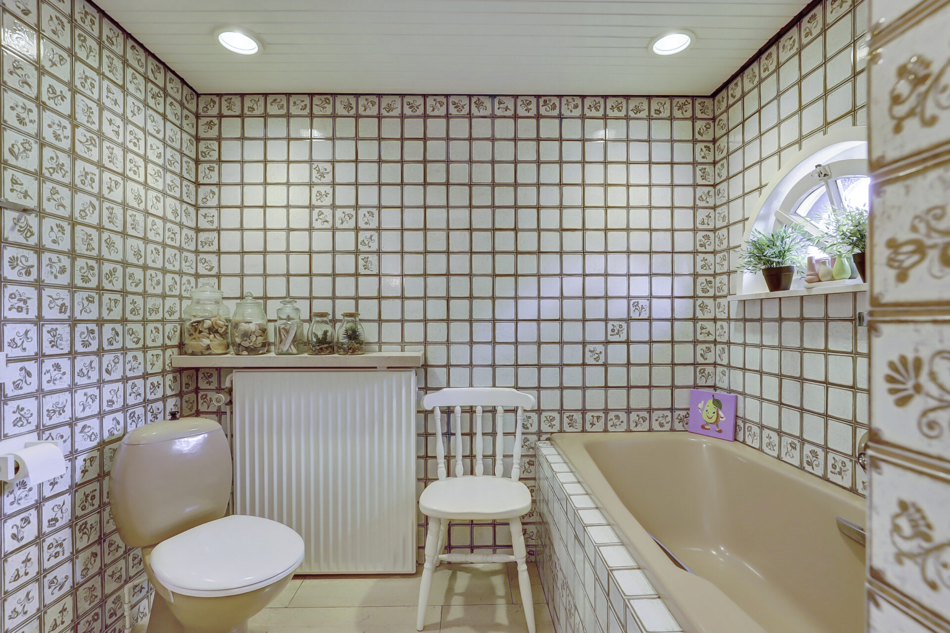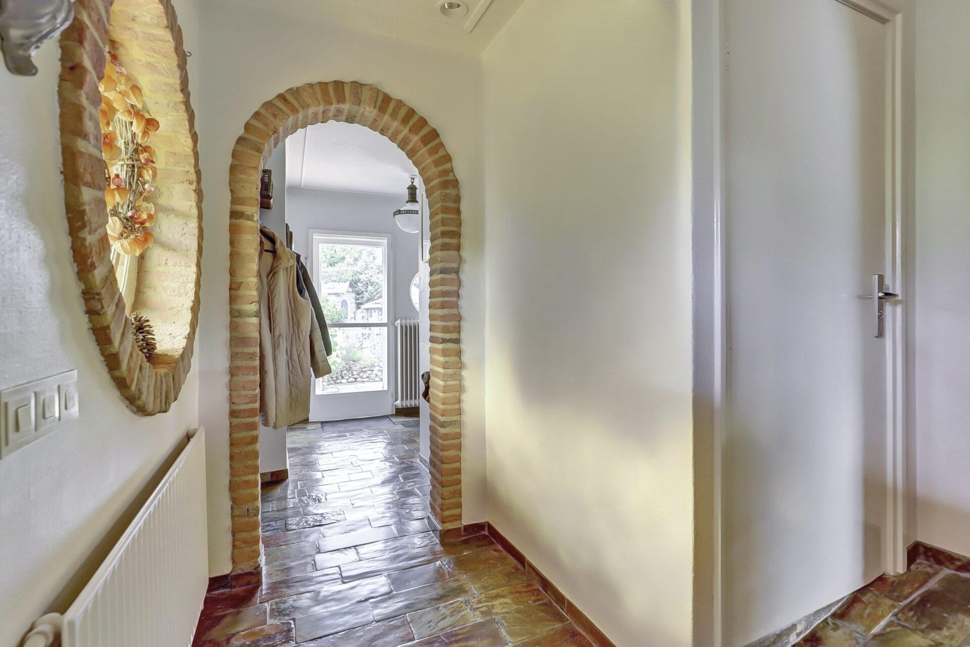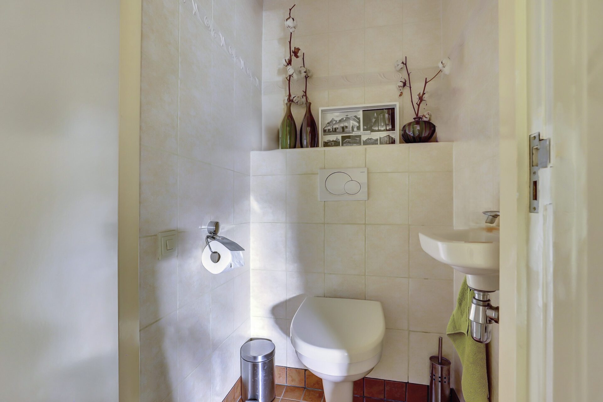 Entree/hal met toiletruimte, toegang tot de garage en de tuin. Sfeervolle woonkamer met veel lichtinval, tuingerichte werkkamer (of bijvoorbeeld als slaapkamer of televisiekamer te gebruiken). Dichte keuken, vanuit een portaal toegang tot de kelder, slaapkamer met vaste kastruimte en badkamer met ligbad, douchehoek, wastafel en toilet.