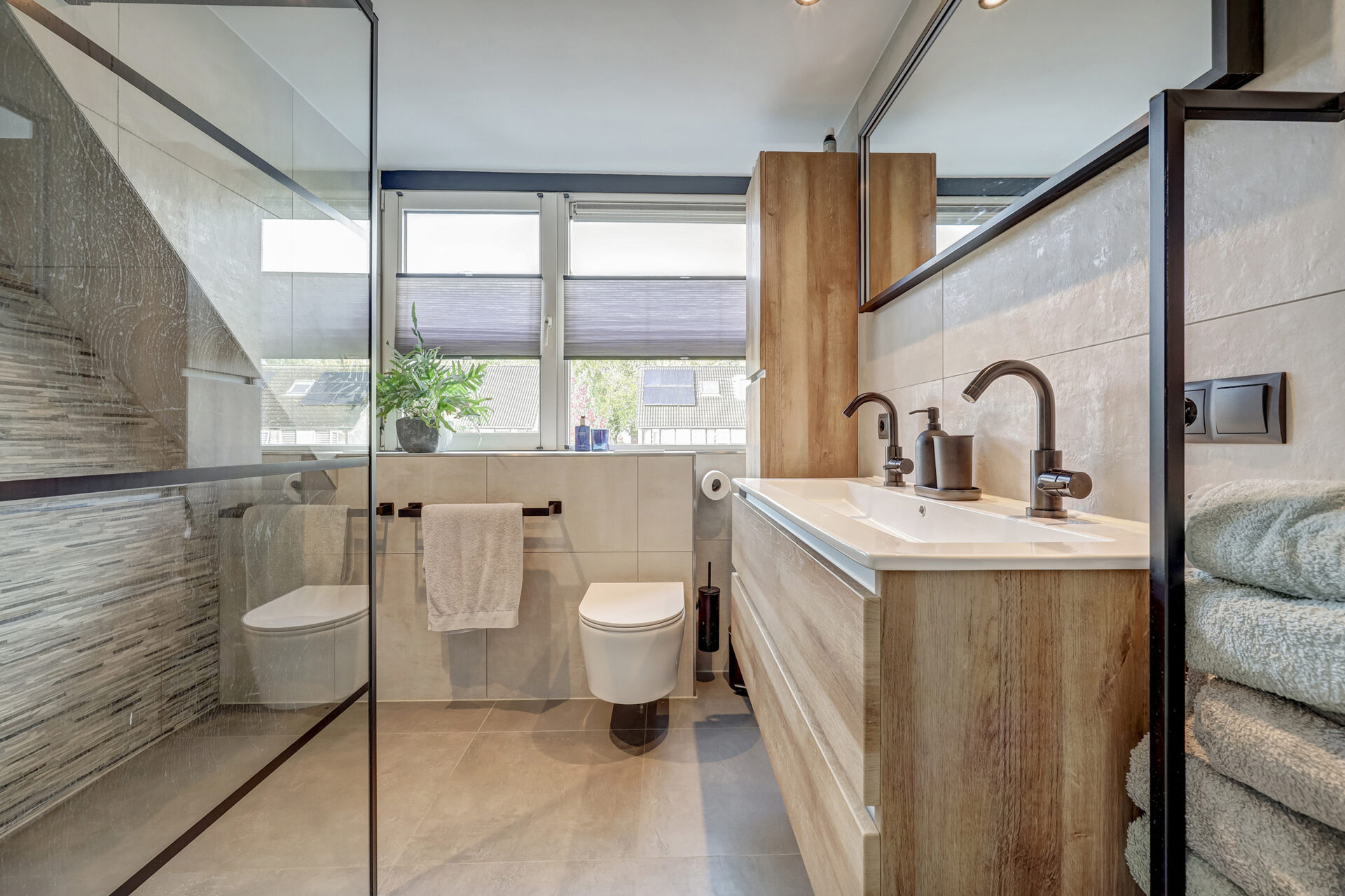 De badkamer is voorzien van een inloopdouche, wastafelmeubel met dubbele spoelbak en 2e toilet. In 2022 is de badkamer volledig vernieuwd en heeft een moderne, frisse uitstraling.