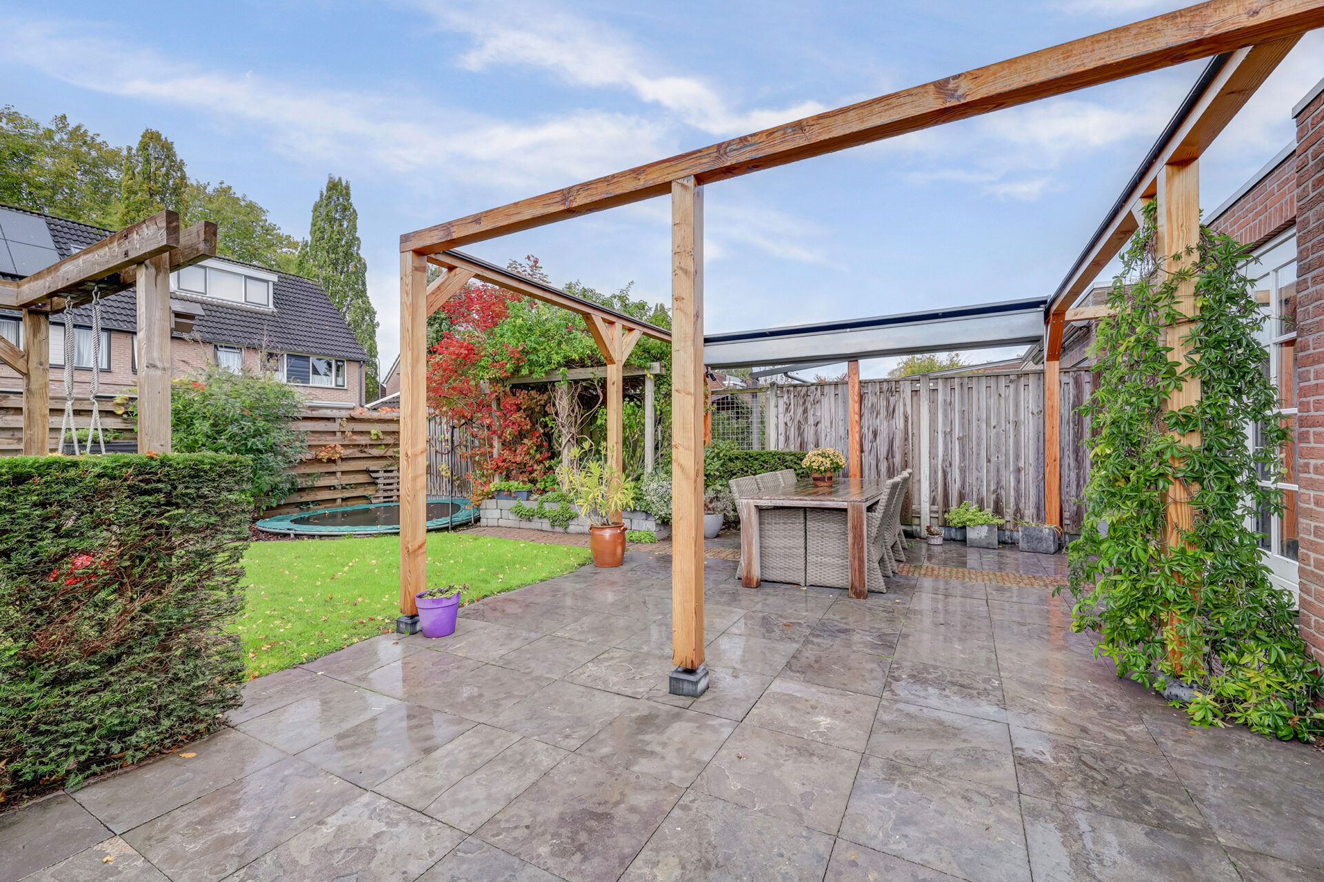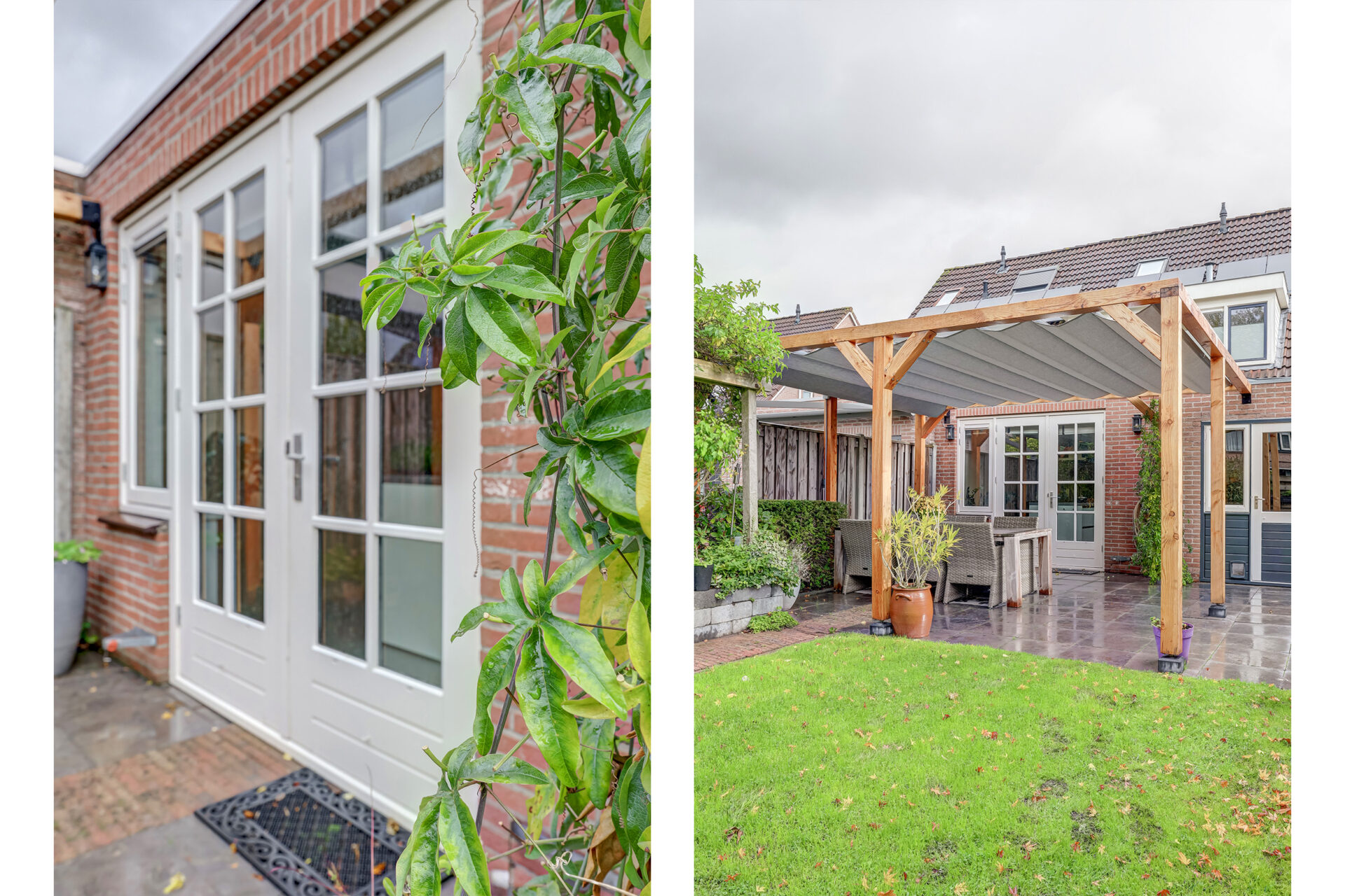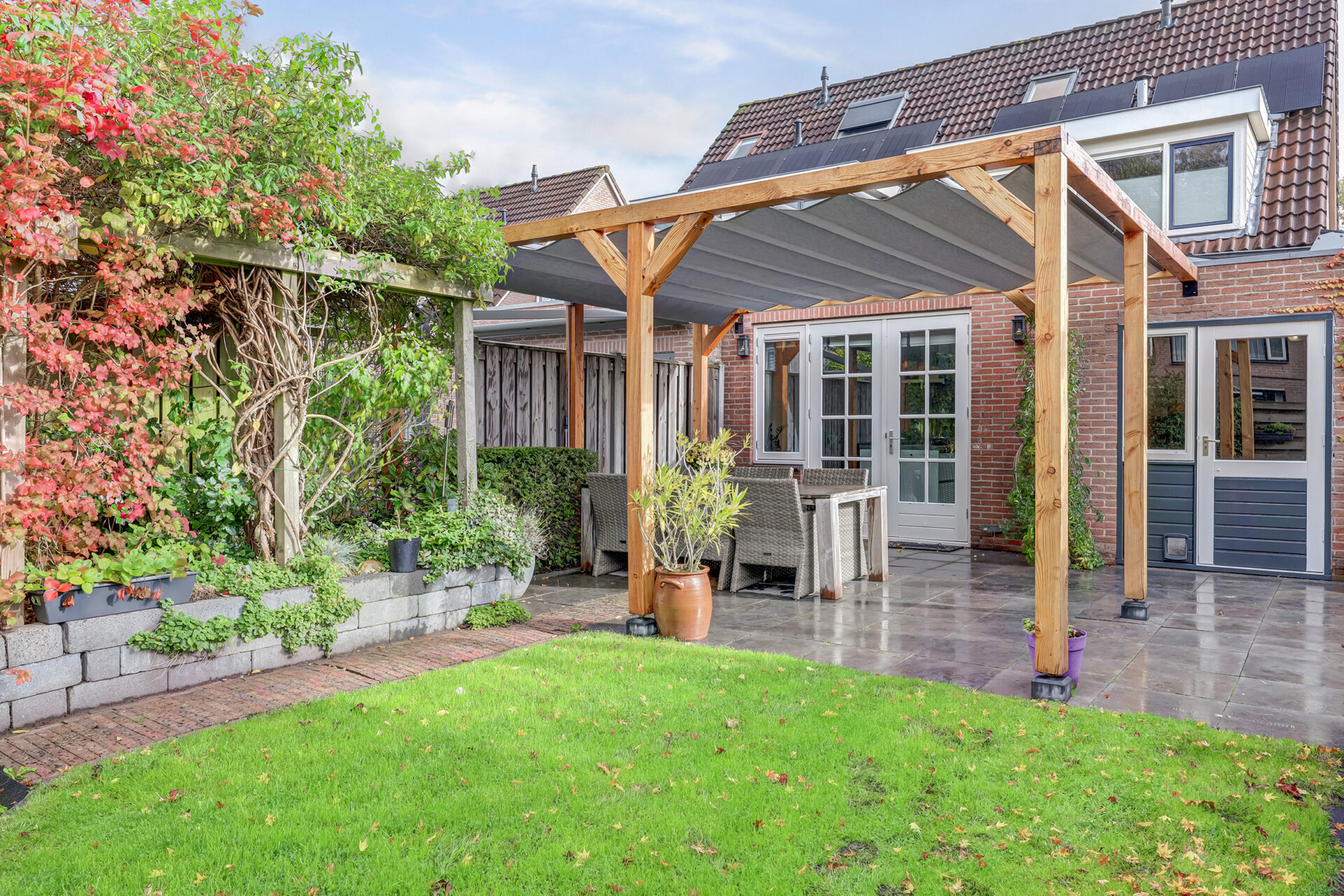 Buiten vind je een fraaie tuin met een pergola rondom het centrale terras. Deze is voorzien van een uitklapbaar schaduwdoek op een railsysteem (aanleg 2023), zodat je tijdens warme zomers heerlijk in de schaduw kunt zitten en kunt genieten van lange avonden buiten.