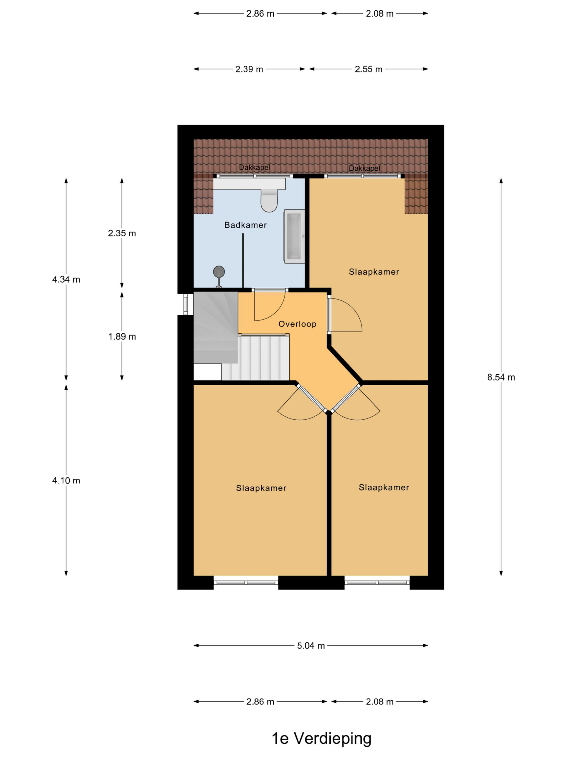 Overloop met aangrenzend drie slaapkamers. Een dakkapel aan de achterzijde zorgt voor extra licht en ruimte in 1 van de slaapkamers en de badkamer.