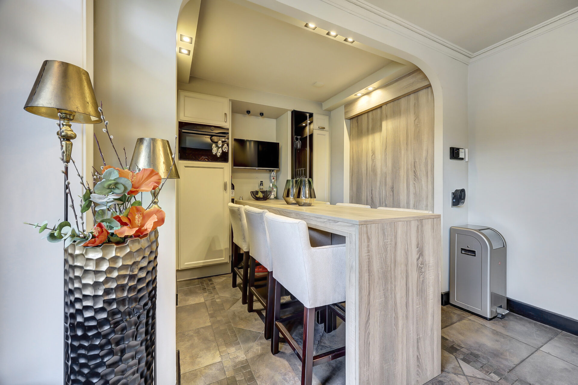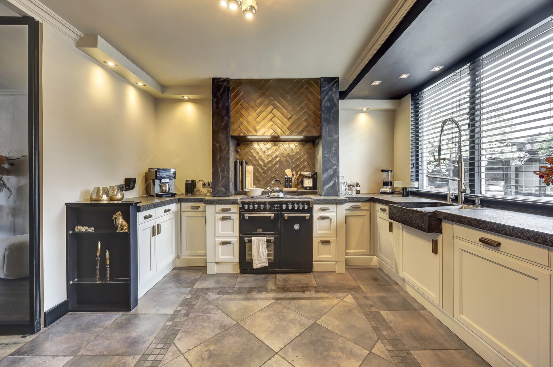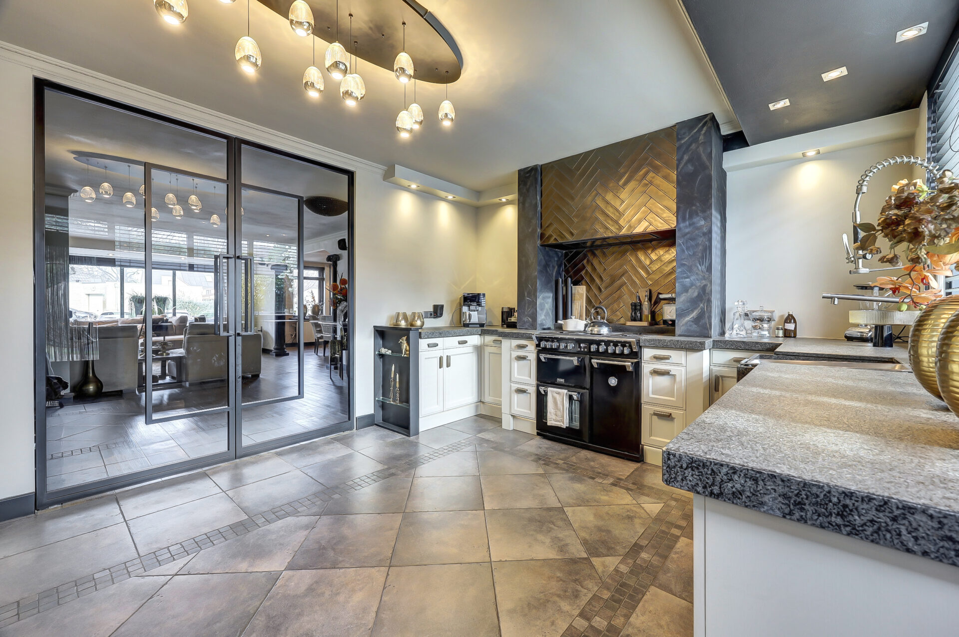 Dankzij de uitbouw aan zowel de voor- als achterzijde is een bijzonder royale living ontstaan met een fijne, open woonkeuken. De indeling is doordacht en praktisch: een werkkamer met uitzicht op de tuin, ideaal voor thuiswerken, en een woonkeuken die via stijlvolle suite-deuren is gescheiden van de woonkamer.