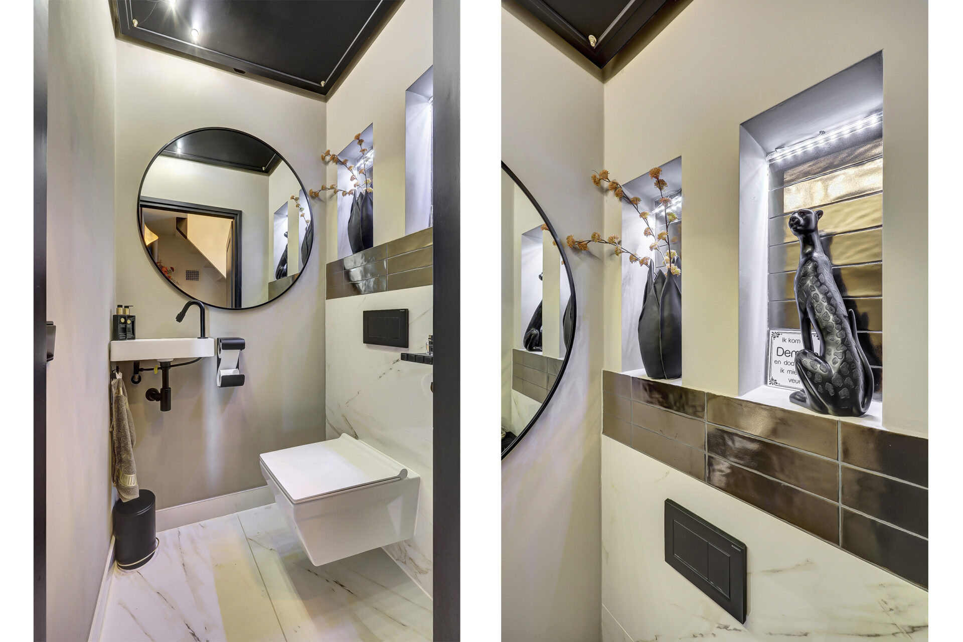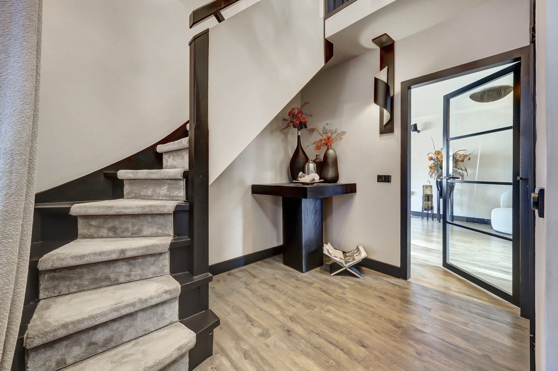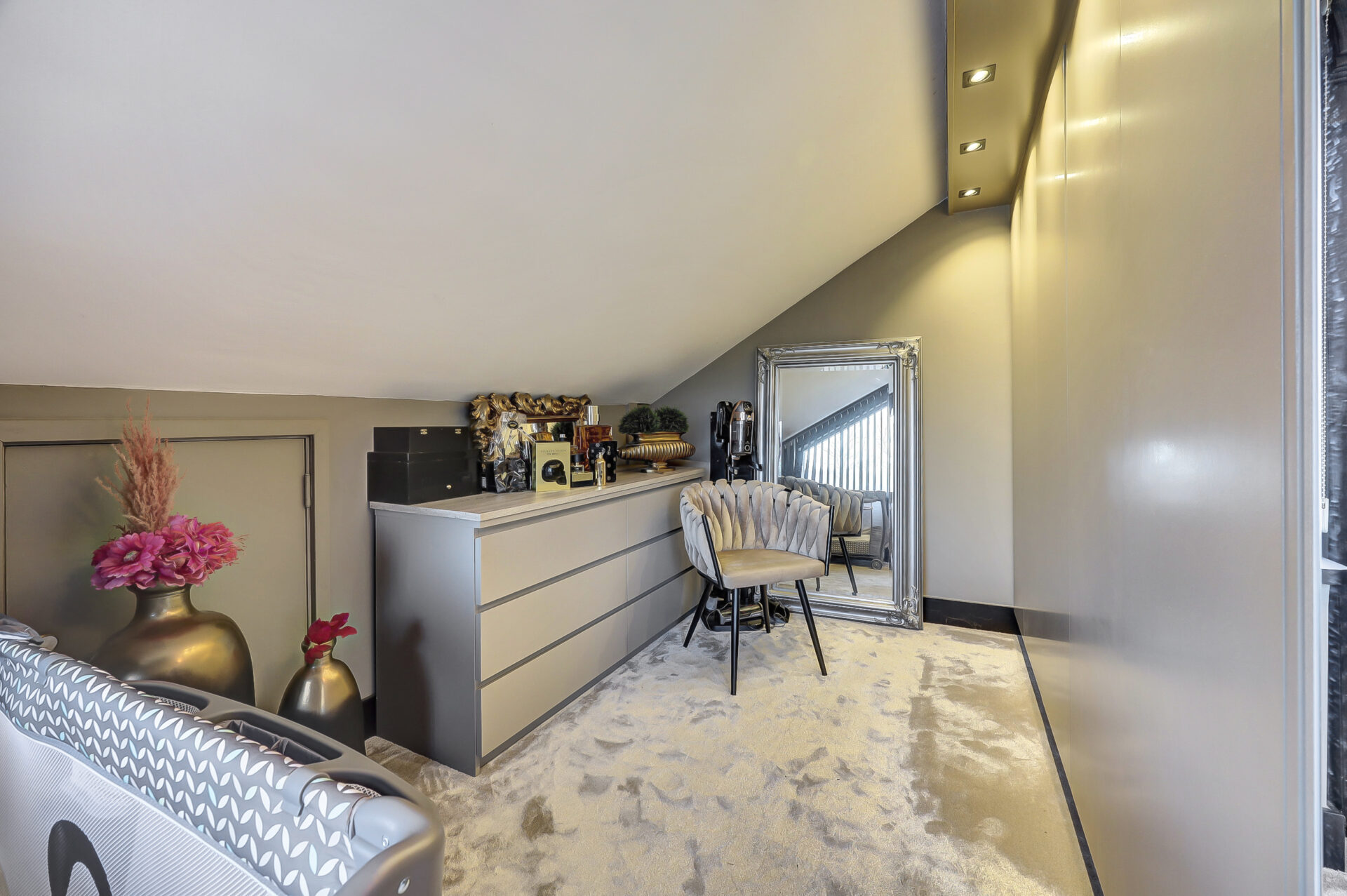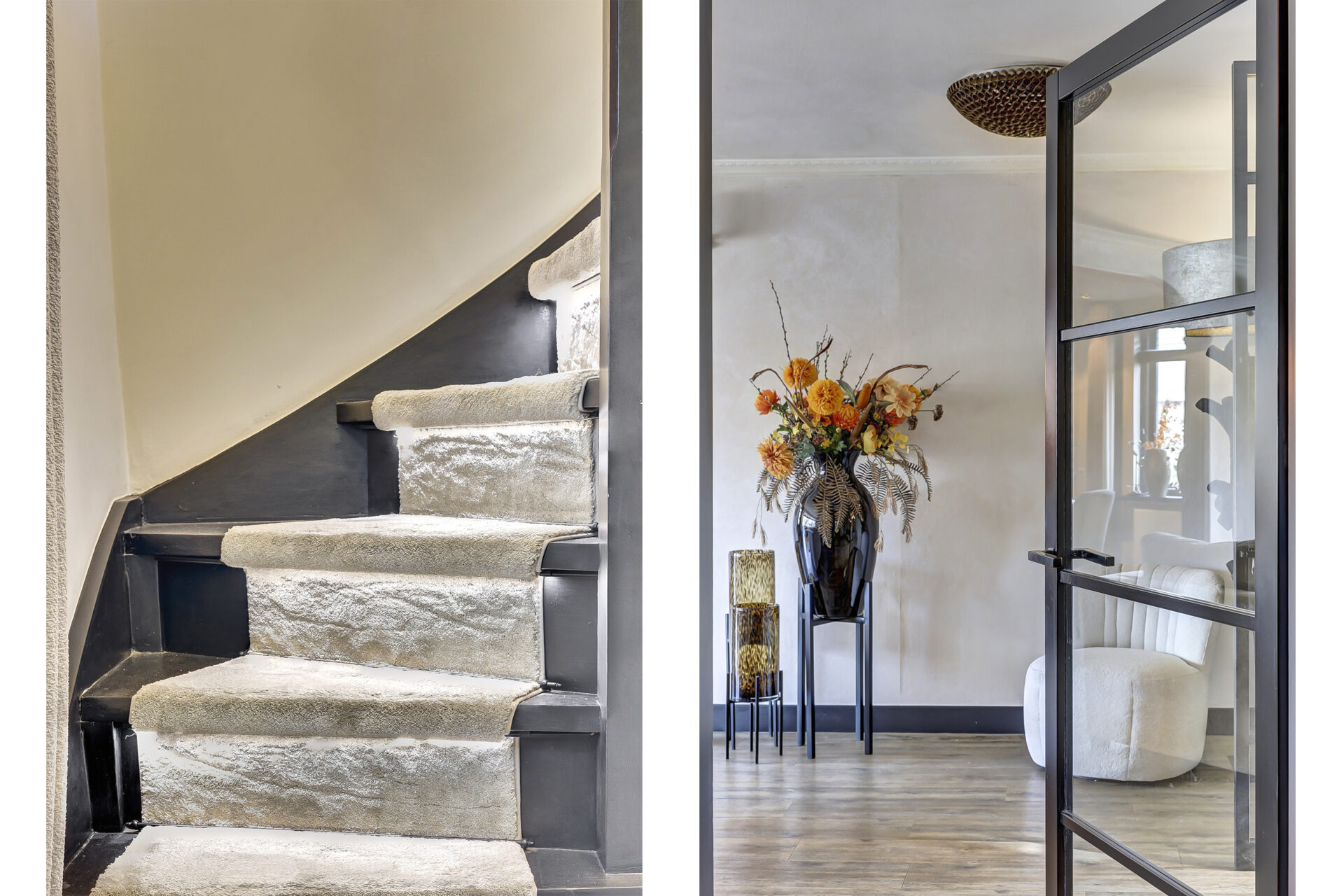 Dankzij de uitbouw aan zowel de voor- als achterzijde is een bijzonder royale living ontstaan met een fijne, open woonkeuken. De indeling is doordacht en praktisch: een werkkamer met uitzicht op de tuin, ideaal voor thuiswerken, en een woonkeuken die via stijlvolle suite-deuren is gescheiden van de woonkamer.