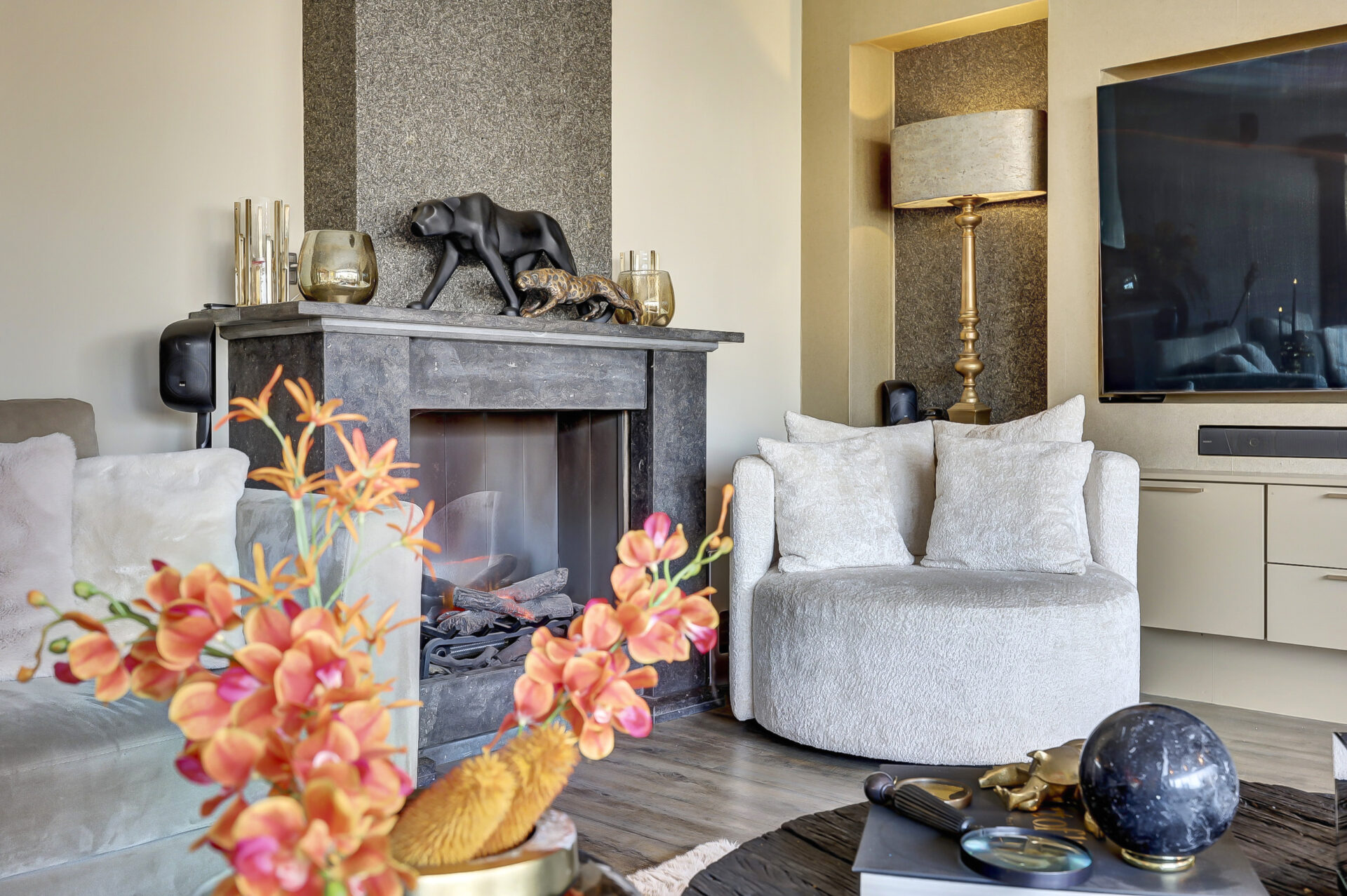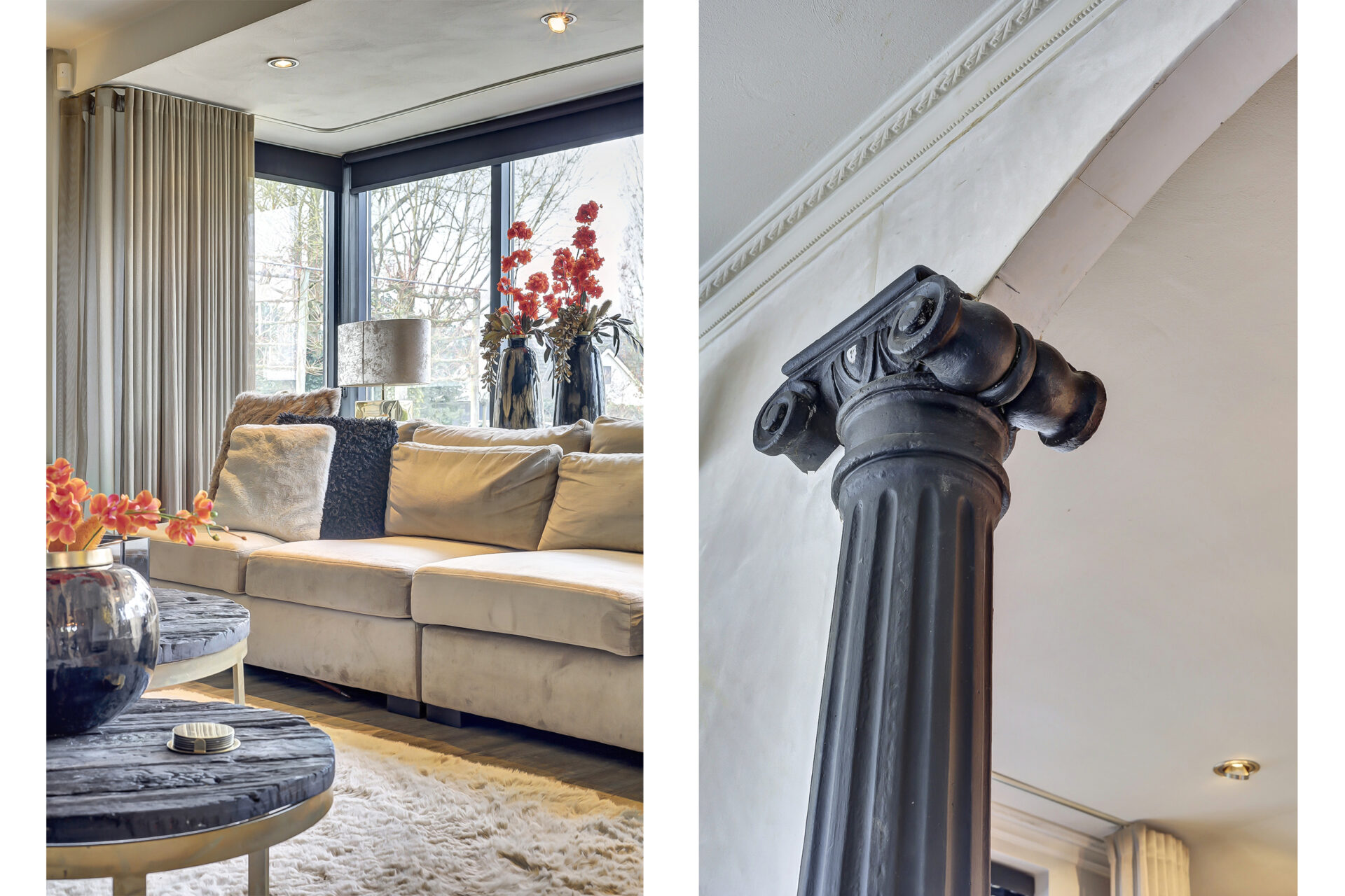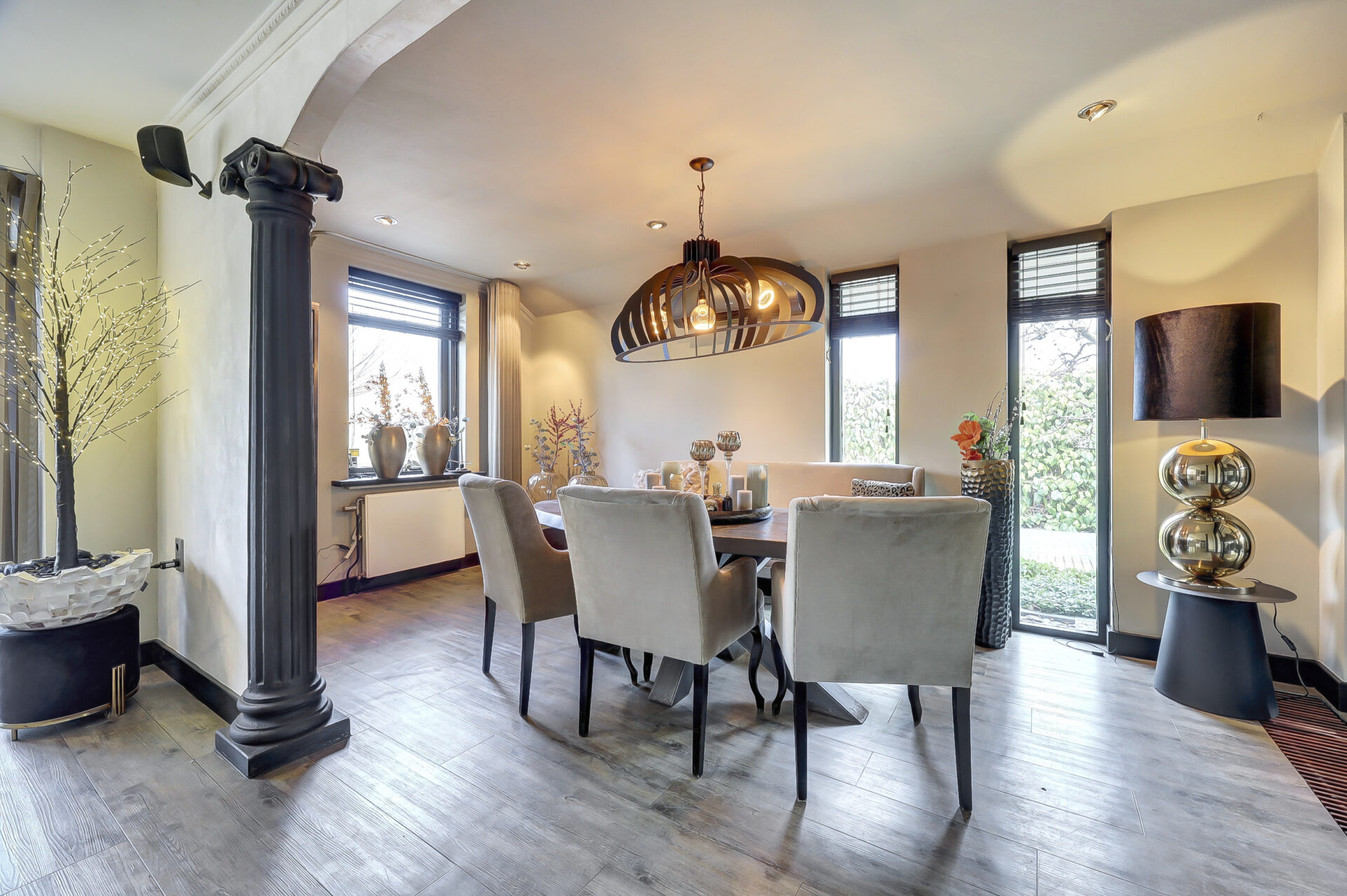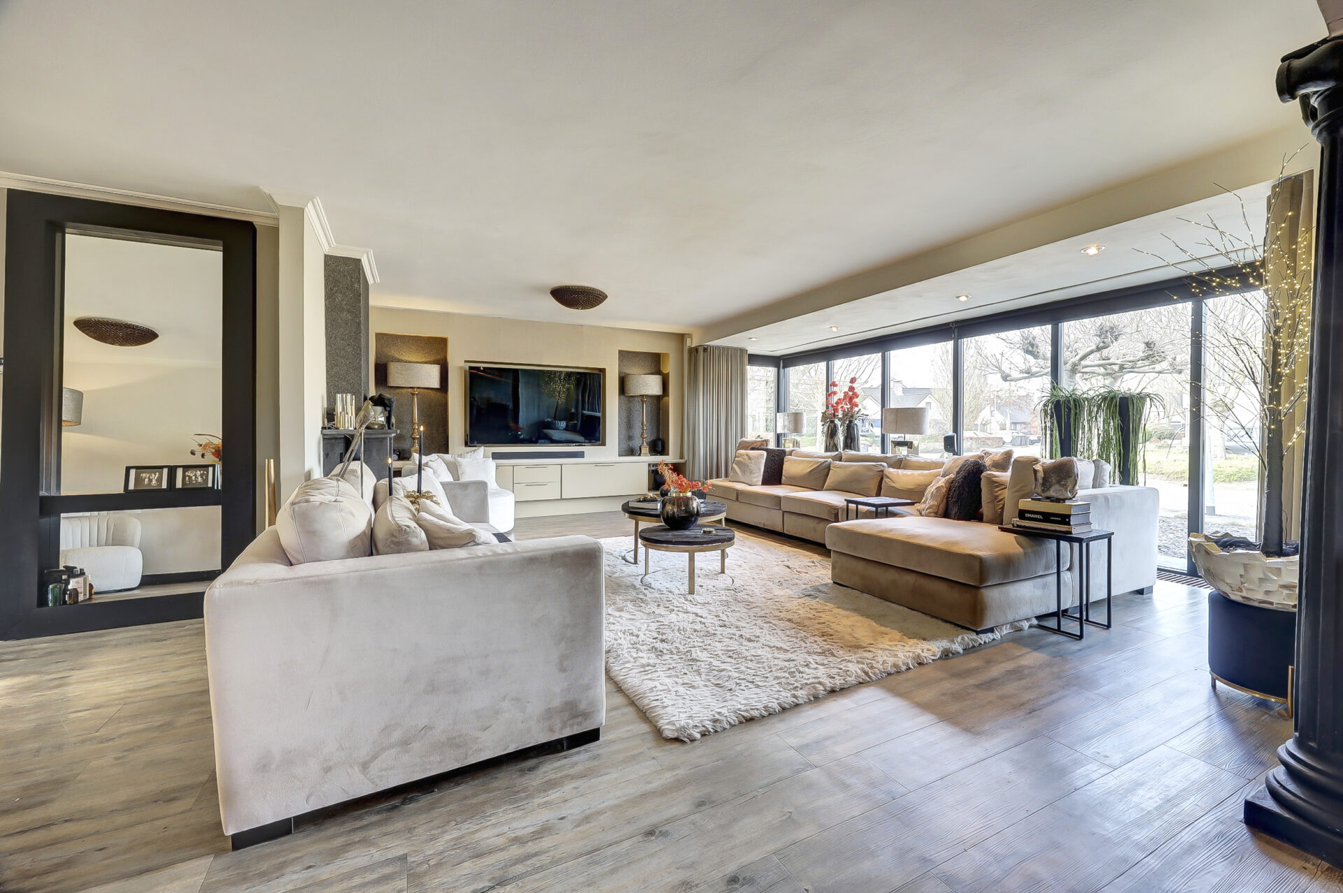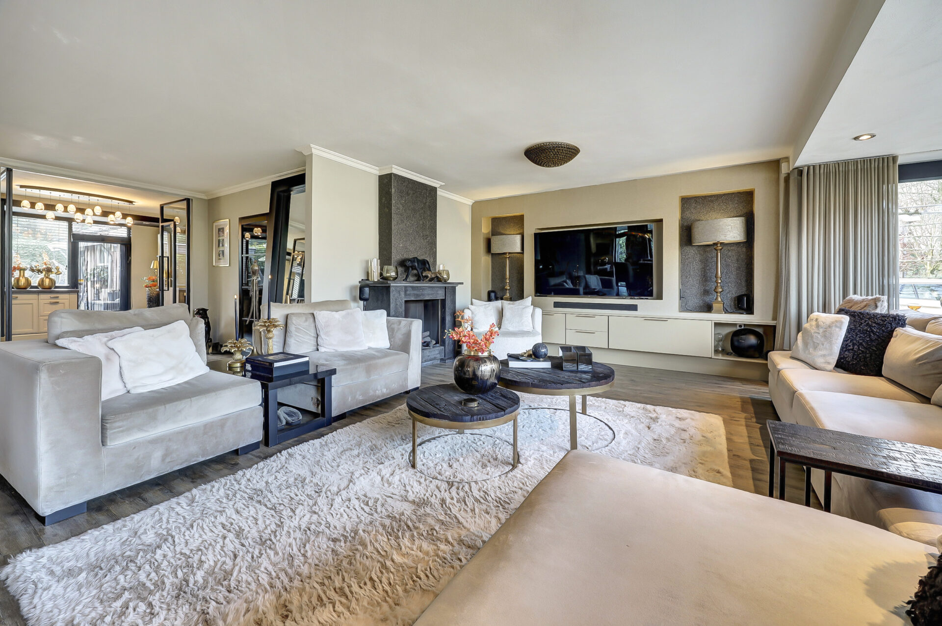 De ruime zitkamer (circa 75 m²) met brede erker en grote raampartijen biedt volop lichtinval en is voorzien van vloerverwarming. Aan de zijkant bevindt zich de sfeervolle eetkamer, perfect voor lange diners en gezellige avonden.