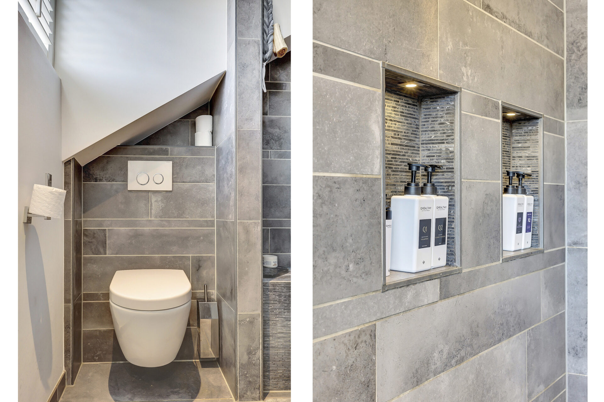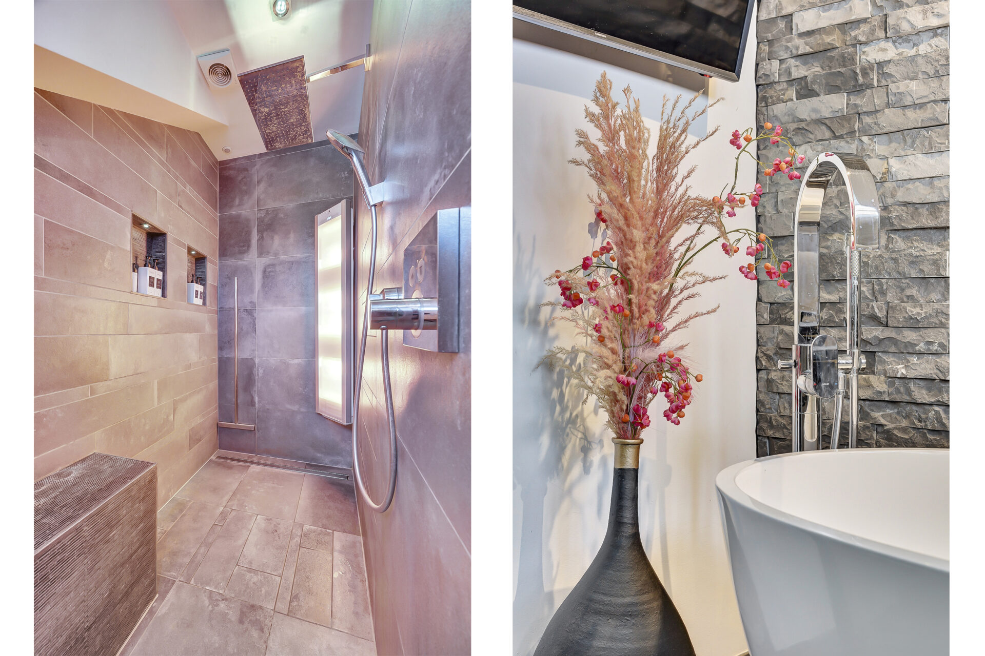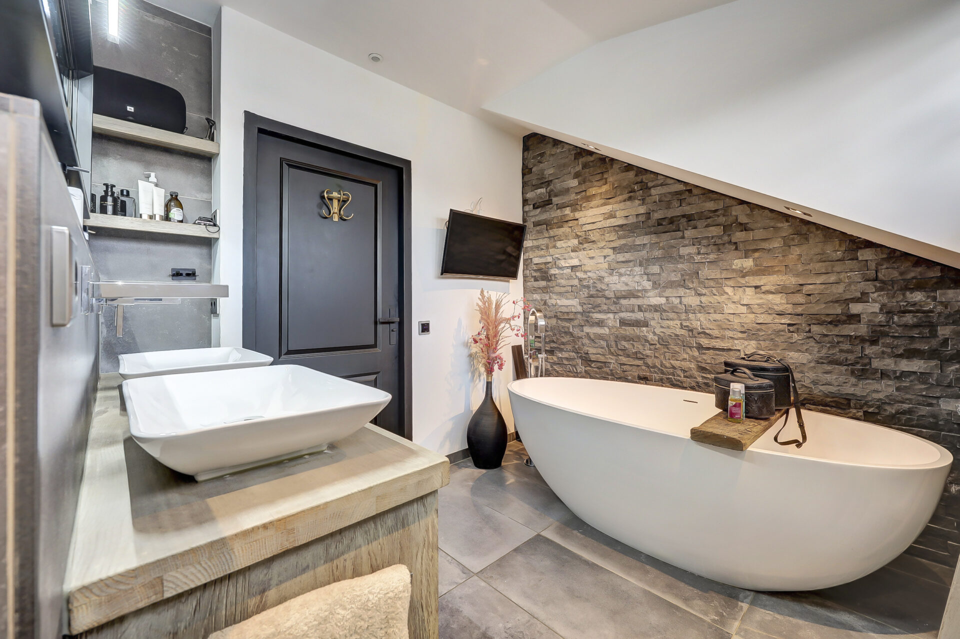 De luxe, gemoderniseerde badkamer met dakkapel is een echte wellnessruimte en voorzien van een vrijstaand ligbad, royale inloopdouche, wandcloset en een wastafelmeubel met dubbele wastafel en grote spiegel.