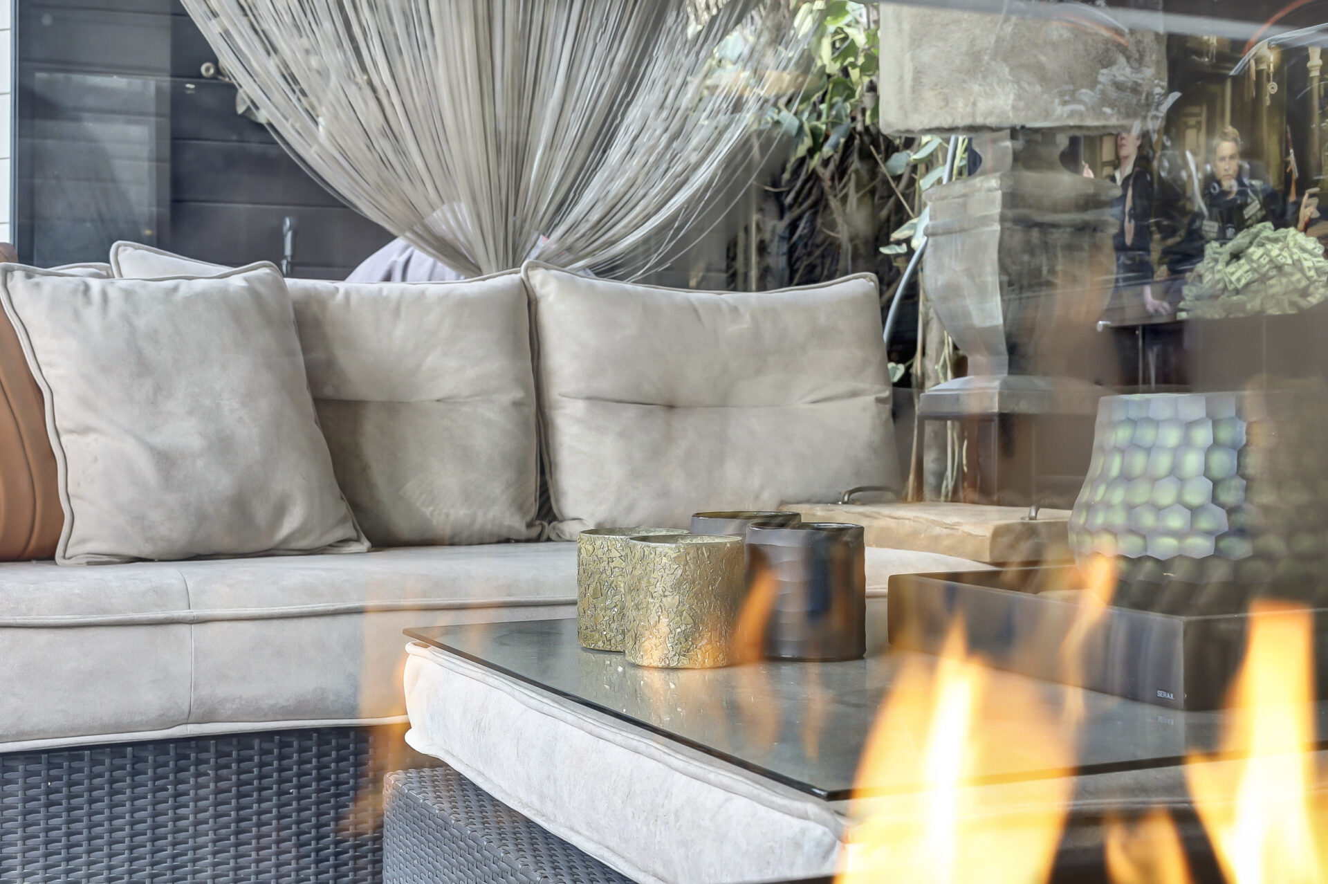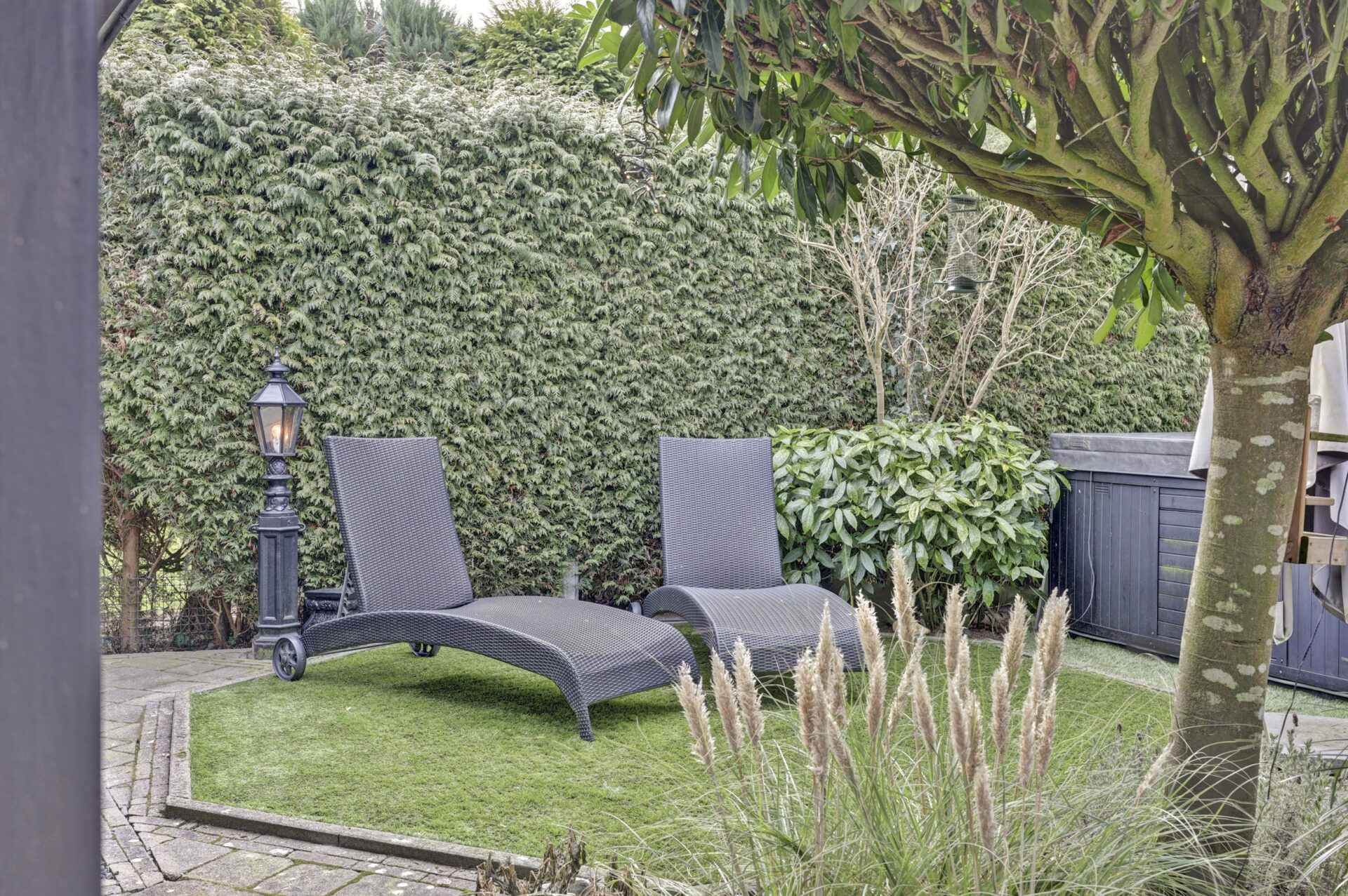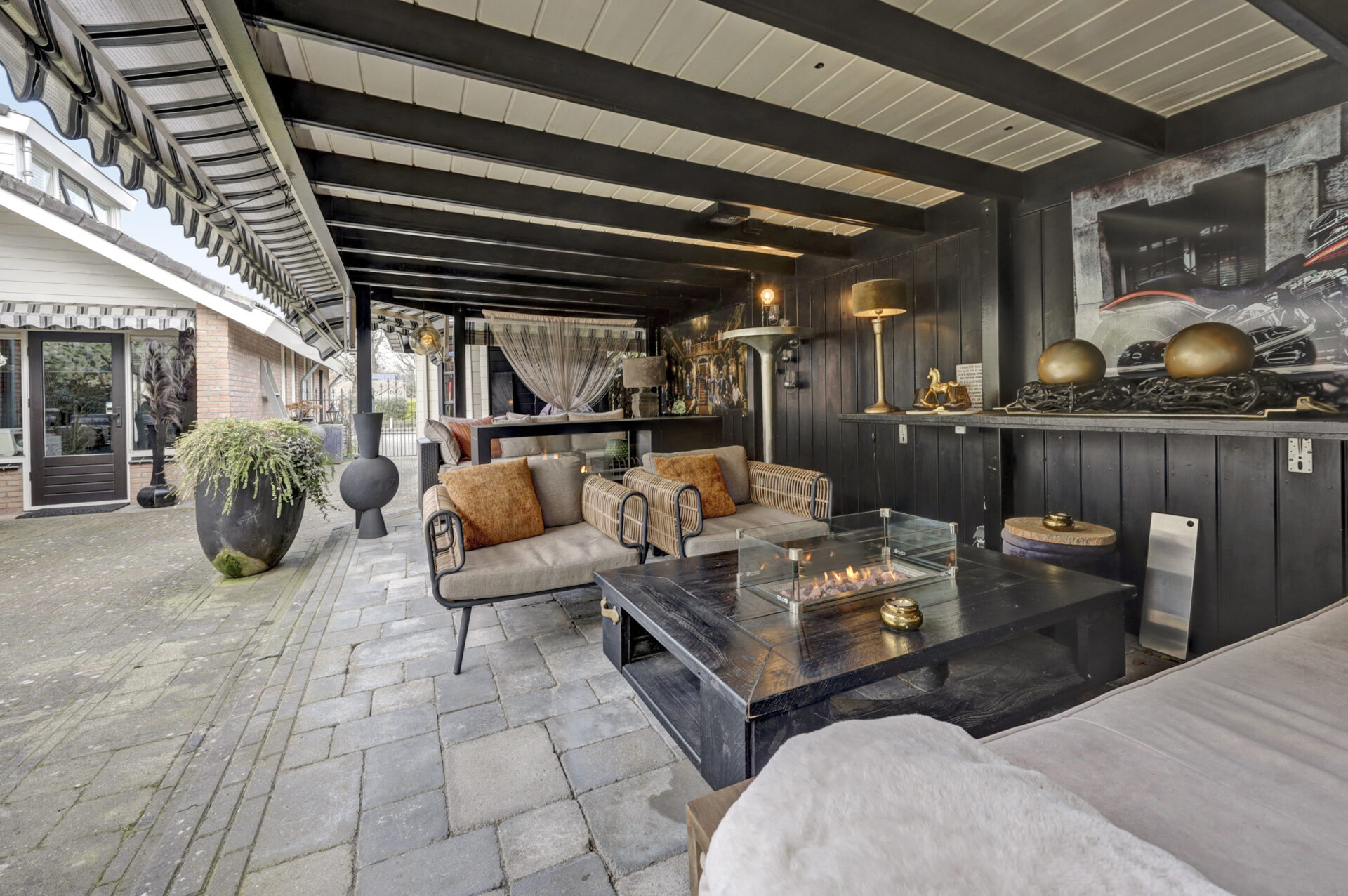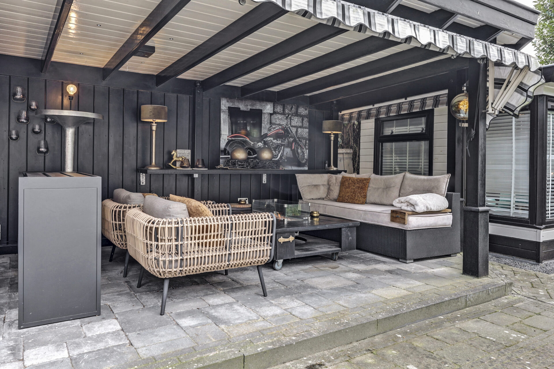 De onderhoudsvriendelijke achtertuin is fraai aangelegd en beschikt over een gezellig ingerichte terrasoverkapping — een heerlijke plek om te genieten van zwoele zomeravonden of knusse momenten rond de vuurtafel in het najaar en de winter. Verder zijn er twee vrijstaande houten bergingen, waarvan één momenteel in gebruik is als beautysalon.