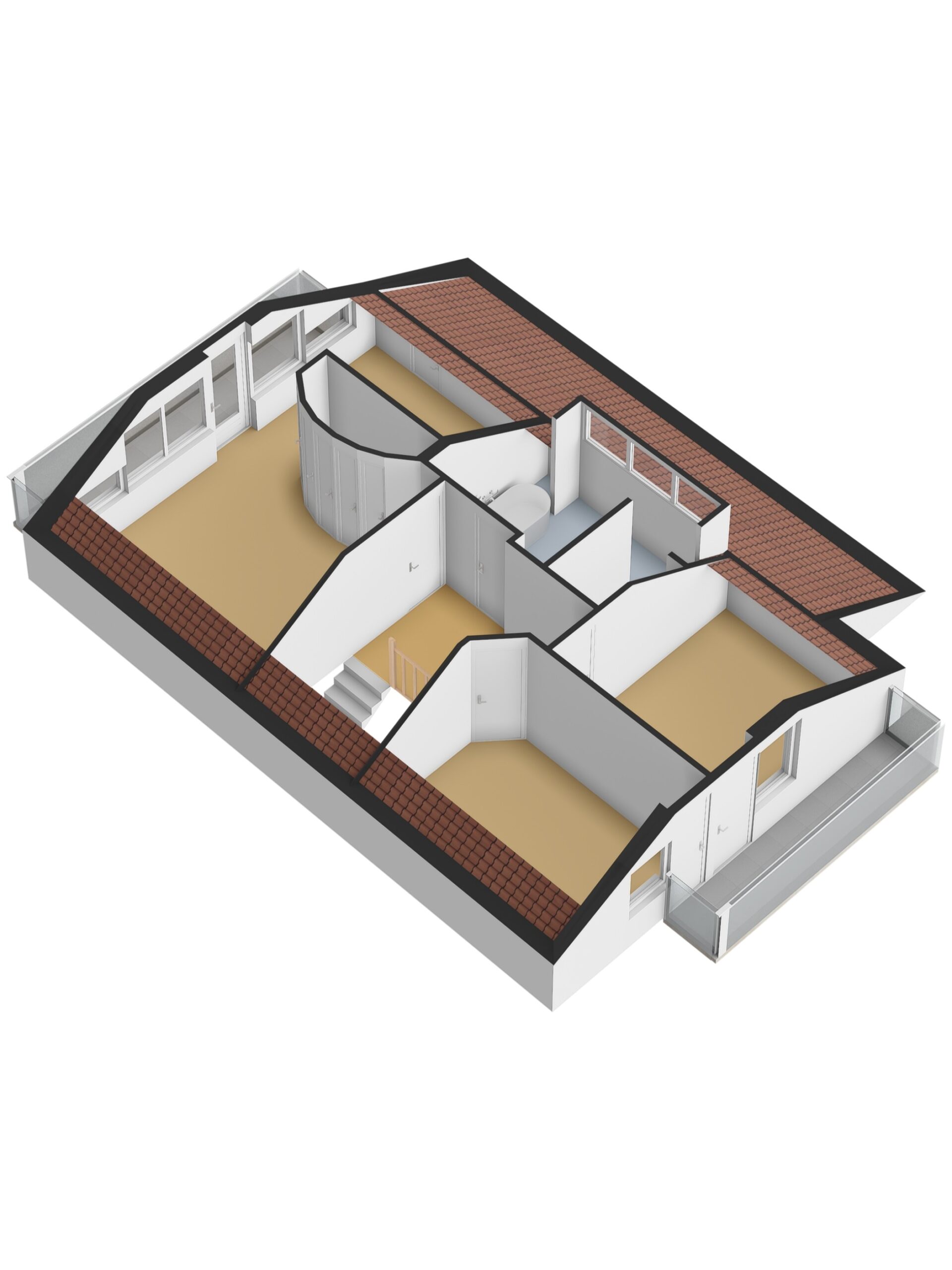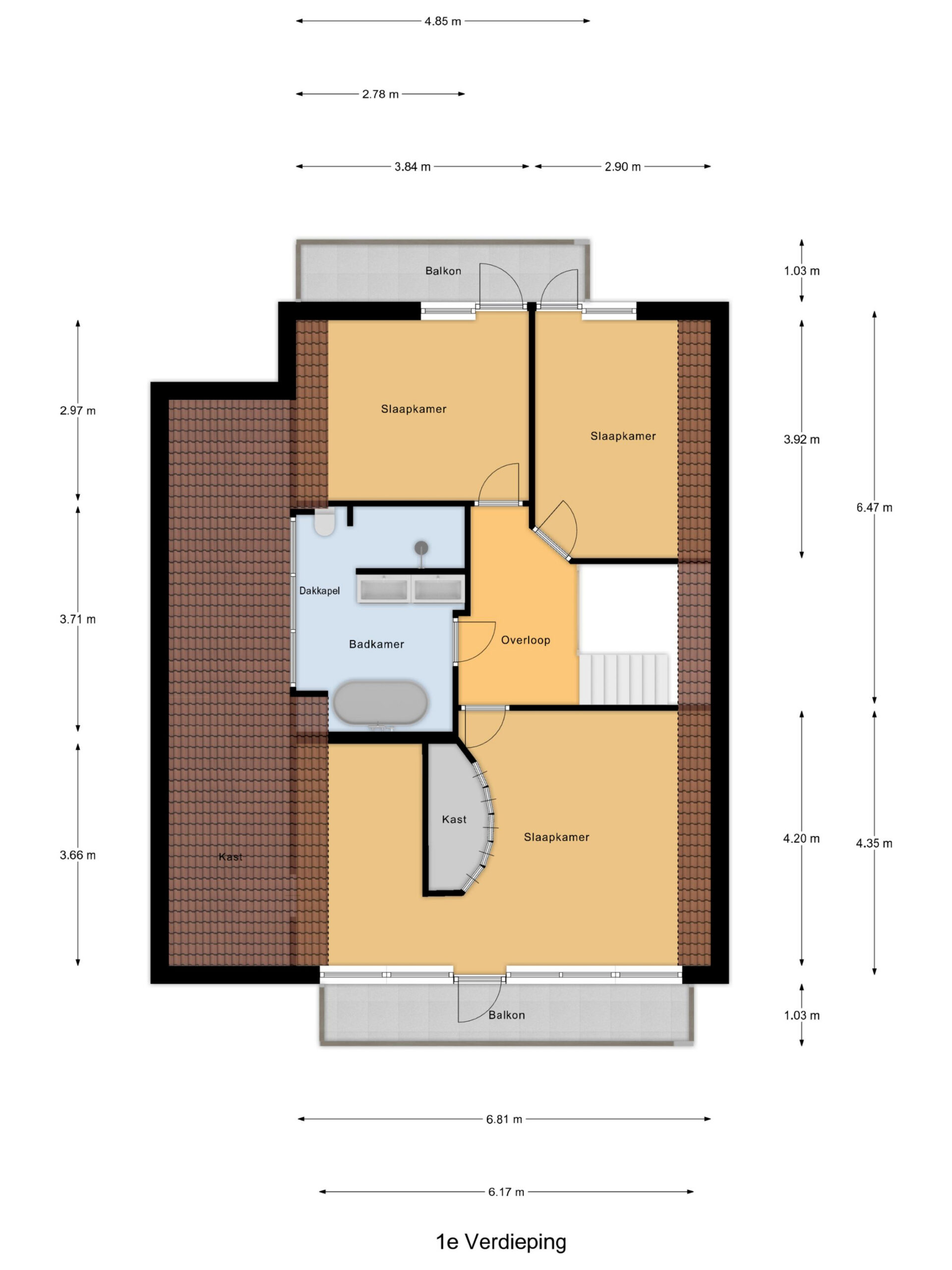 Op de eerste verdieping bevindt zich aan de voorzijde een royale master-bedroom met kleedruimte, grote vaste kast en een balkon over de volledige breedte. Aan de achterzijde zijn twee slaapkamers gesitueerd, beide met toegang tot het balkon.