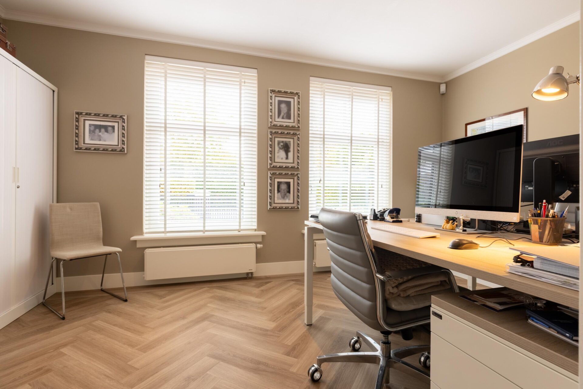 Aan de voorzijde van de woning bevindt zich een mooie kantoorruimte, waar u ongestoord kunt studeren of werken met uitzicht op de tuin en de oprit. De garage is inpandig te bereiken en voorzien van een keukenblok met warm en koud water. Op de gehele begane grond ligt vloerverwarming, de overige ruimtes hebben strakke radiatoren.