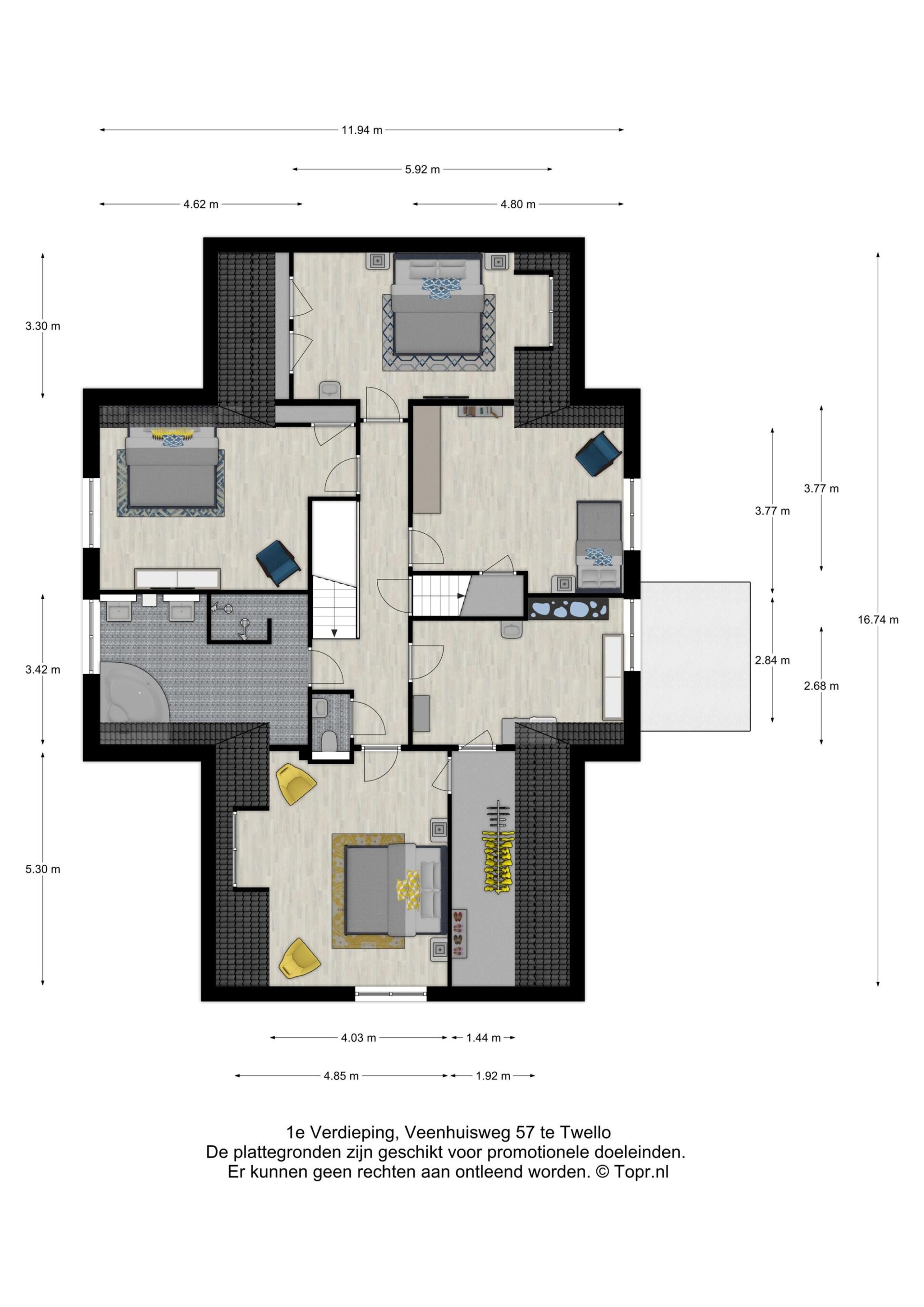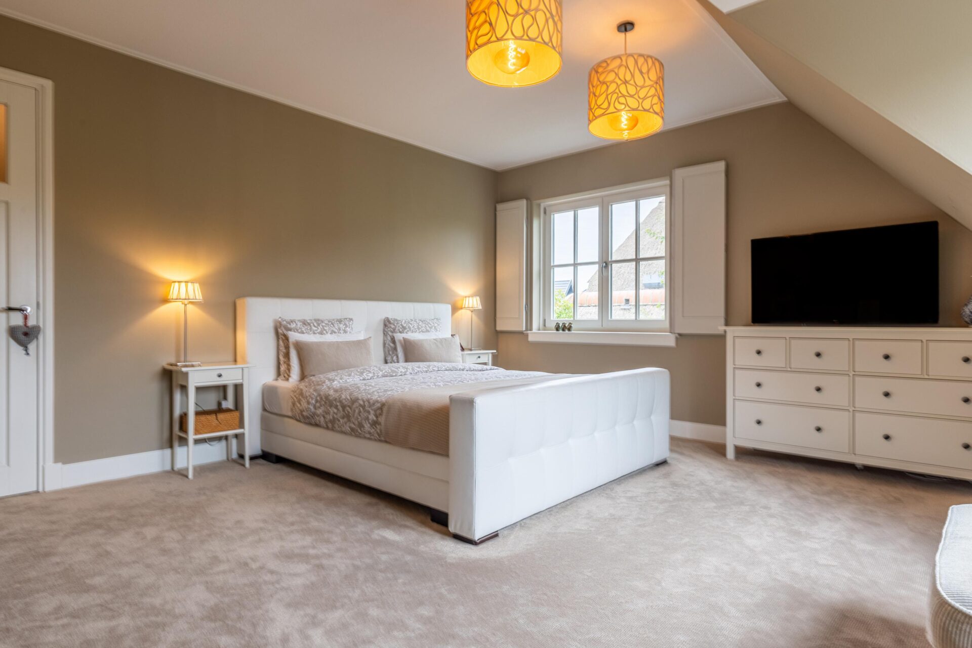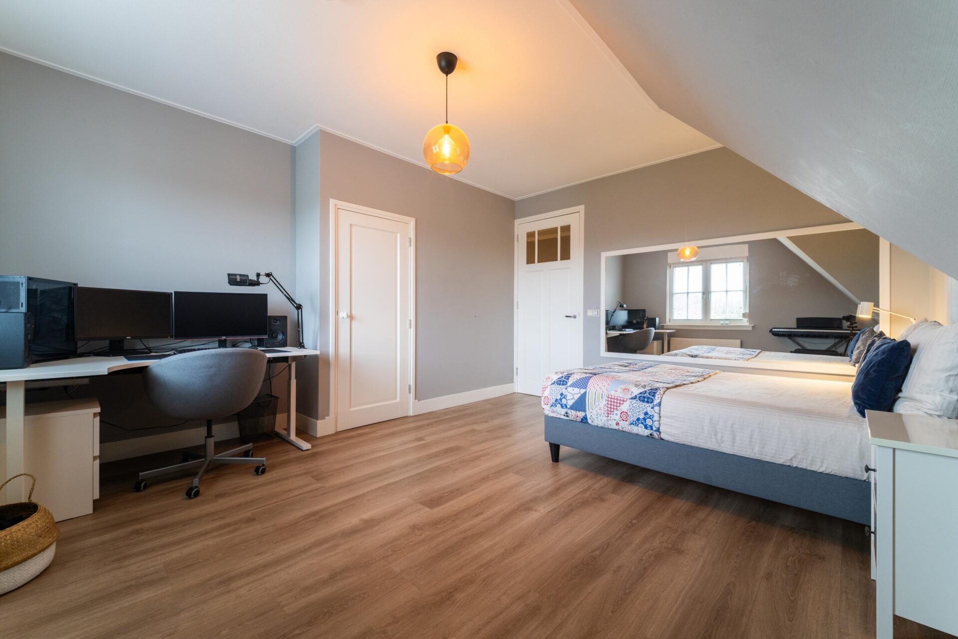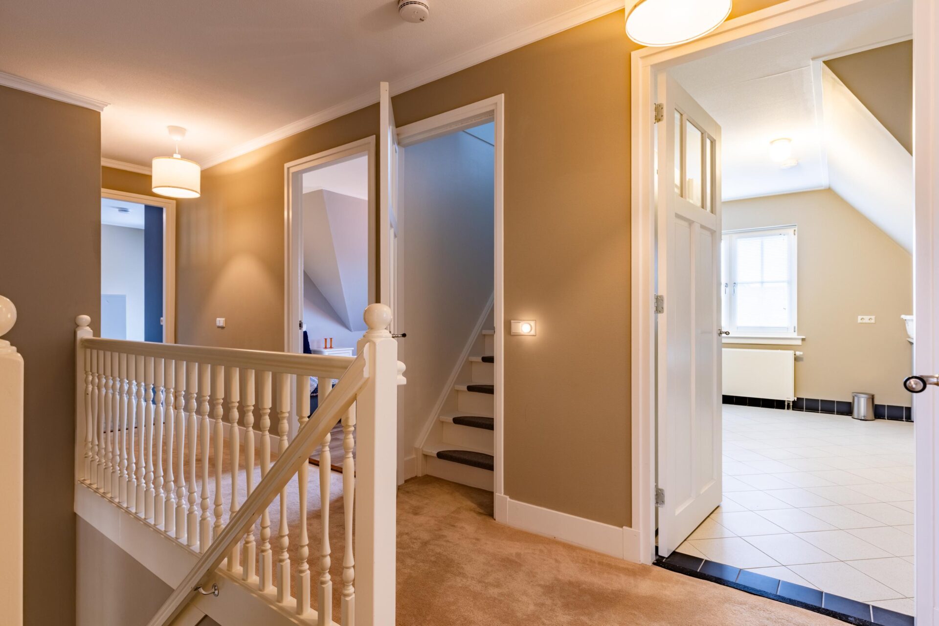 Eerste verdieping: De lange overloop op de eerste verdieping geeft toegang tot vier ruime slaapkamers, de badkamer en een aparte wasruimte. De slaapkamers beschikken alle over praktische inbouwkasten, deels schuine wanden, gezellige dakkapellen, een vaste internetaansluiting en geïntegreerde rolluiken of op maat gemaakte luiken voorzien van voorzethorren. De ouderslaapkamer is voorzien van een luxe inloopkast, die handig bereikbaar is via de slaapkamer en direct via de wasruimte. De badkamer is heerlijk ruim en fraai afgewerkt met een groot tweepersoons ligbad met whirlpool, een dubbele wastafel, grote spiegels en een ruime tweepersoons inloopdouche. Op de overloop bevindt zich een separaat toilet. De wasruimte is erg ruim en voorzien van een wastafel en vouwtafel.
