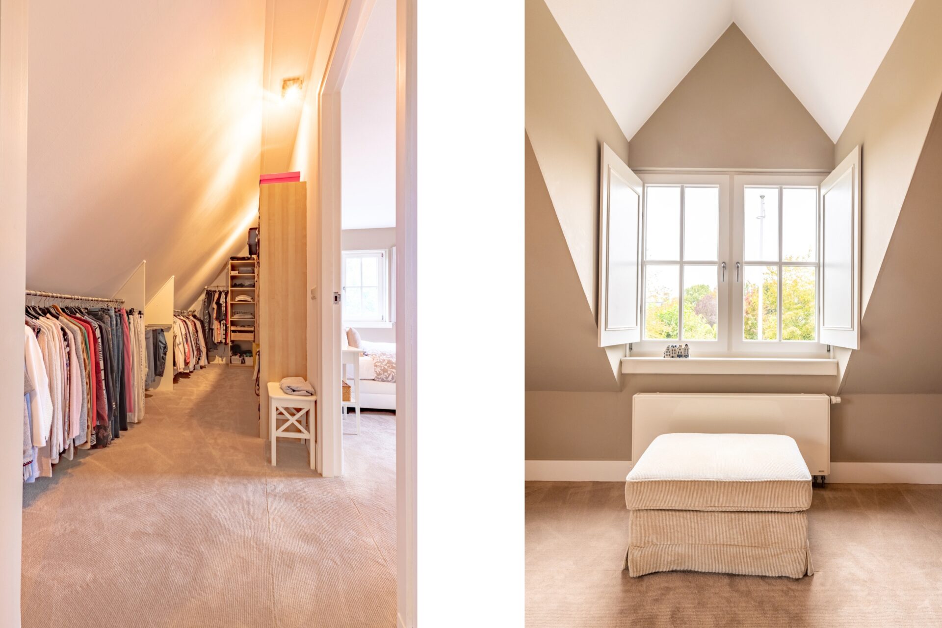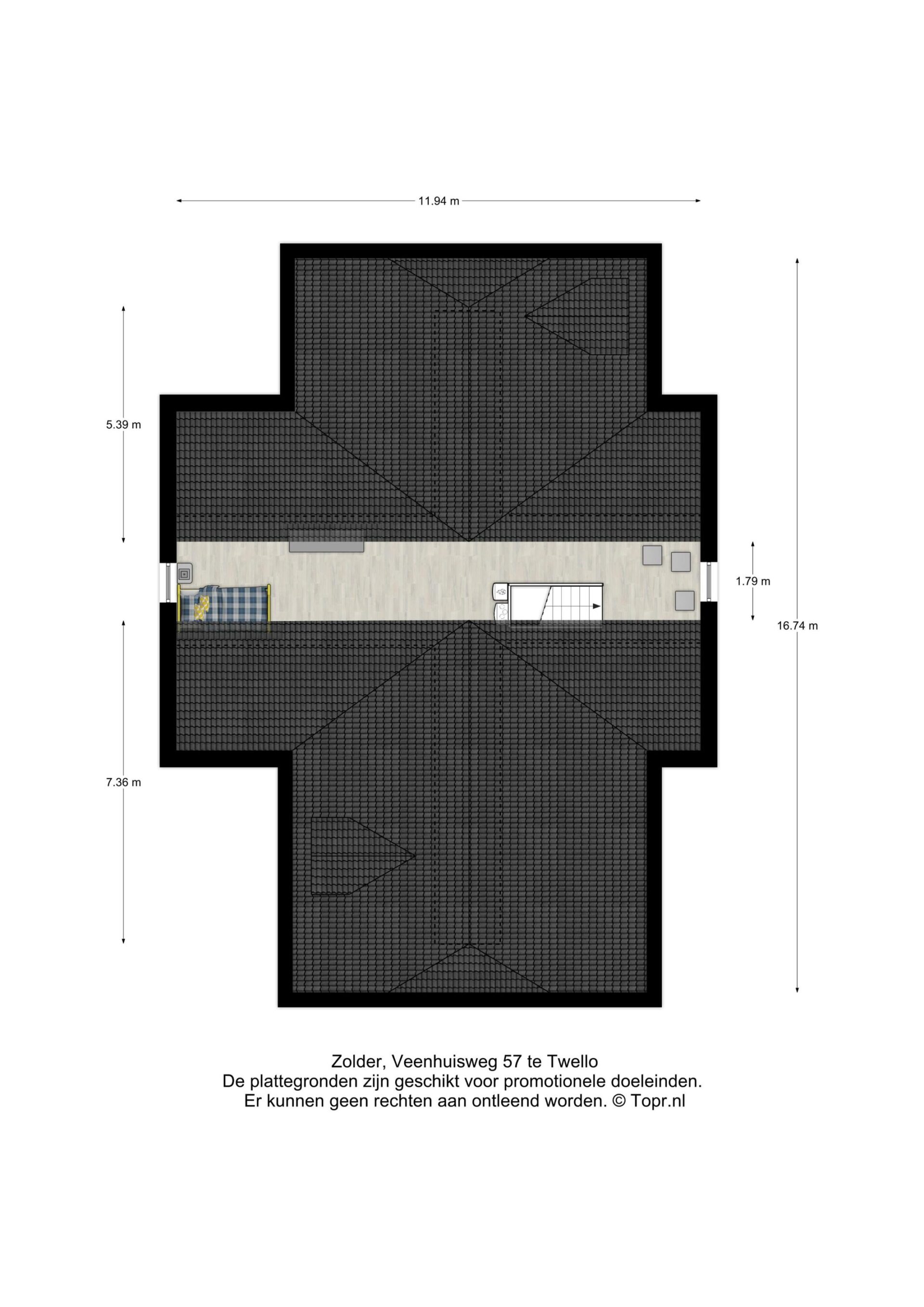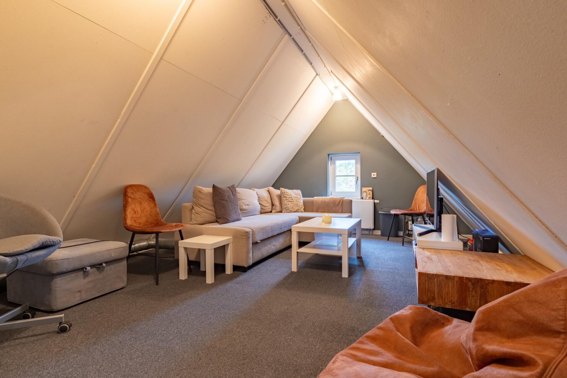 Tweede verdieping: Op de tweede verdieping bevindt zich een ruime zolder, waarvan het middelste deel op stahoogte en geschikt voor gebruik als logeer- of hobbyruimte. De beide zijvleugels lenen zich uitstekend voor bergruimte. Tevens bevinden zich hier de cv-installatie en de mv-box (beide 2021). De zolder is bereikbaar middels een vaste trap.