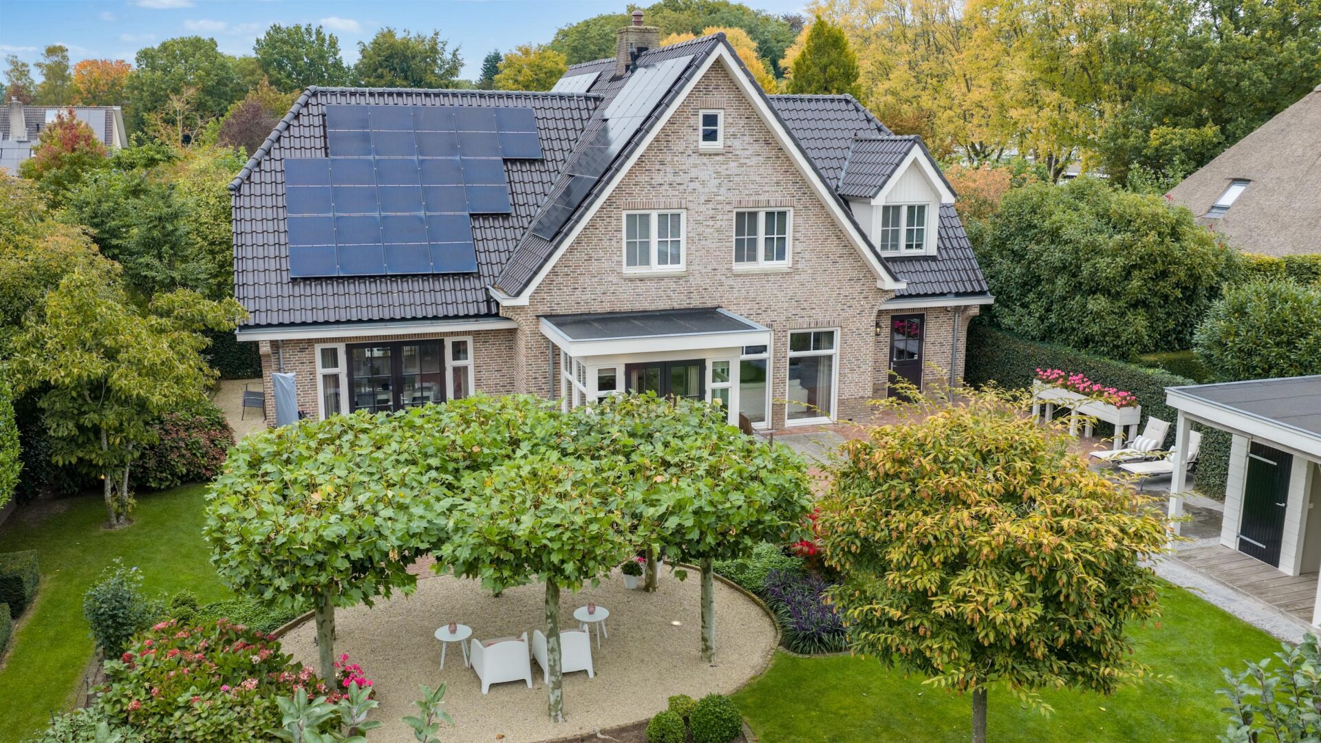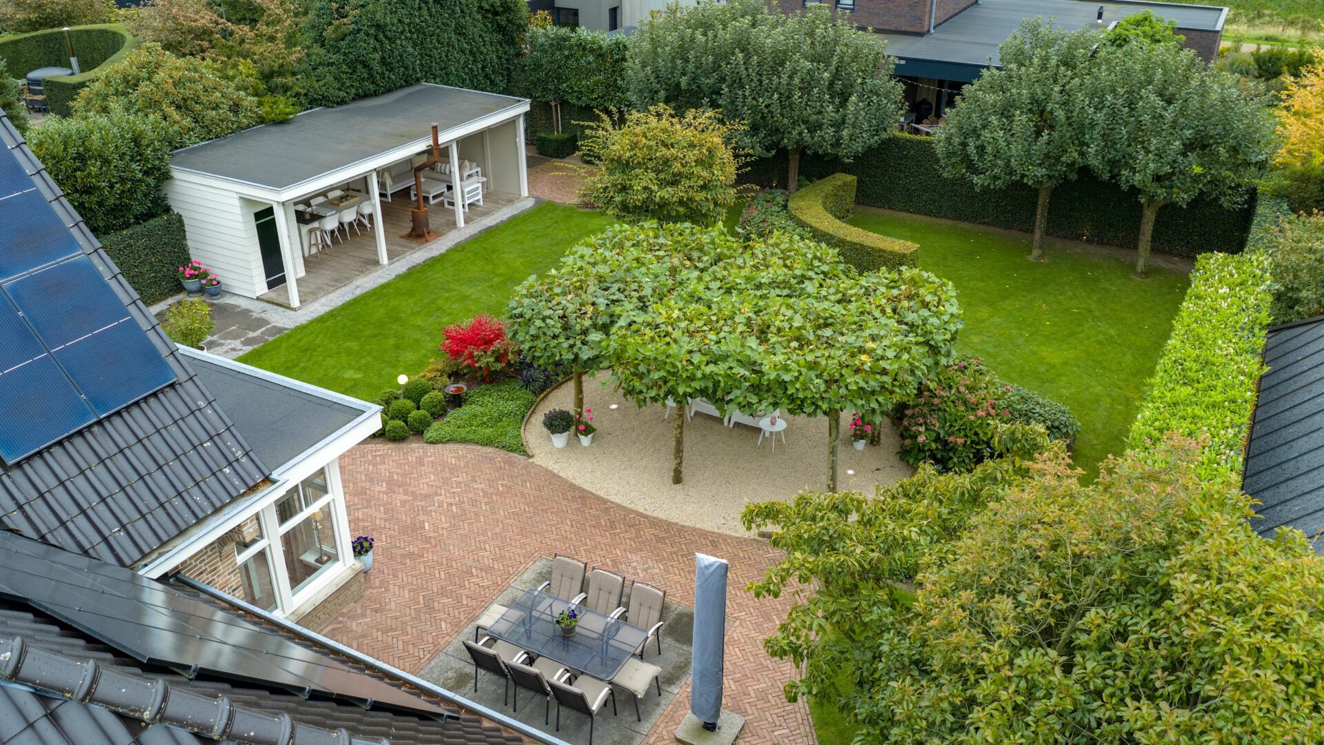 Buiten: De villa is gesitueerd op een groot perceel met aan de voorzijde een elektrisch toegangshek (2021), oprit met laadpaal (2023) en parkeerruimte voor drie tot vier auto’s en aan de achterzijde een op het zuiden gerichte, prachtige tuin. De tuin is waanzinnig aangelegd met verschillende terrassen met zon en schaduw, siergazon en diverse planten. De prachtige veranda van circa 9 meter breed en 4 meter diep is voorzien van een van een bar met bergruimte, meerdere lichtpunten (inbouwspots met dimmer), stopcontacten, houthaard en ingebouwde heaters, zodat u het hele jaar van de mooie tuin kunt genieten. In de garage bevindt zich een puntstuk waarmee grondwater wordt opgepompt om de tuin te sproeien met het aangelegde beregeningssysteem. Het grasveld wordt onderhouden door een robotmaaier, waardoor u hier geen omkijken naar heeft. Daarnaast is er een fijne schuur voor het tuingereedschap en het opbergen van kussens in de winter.