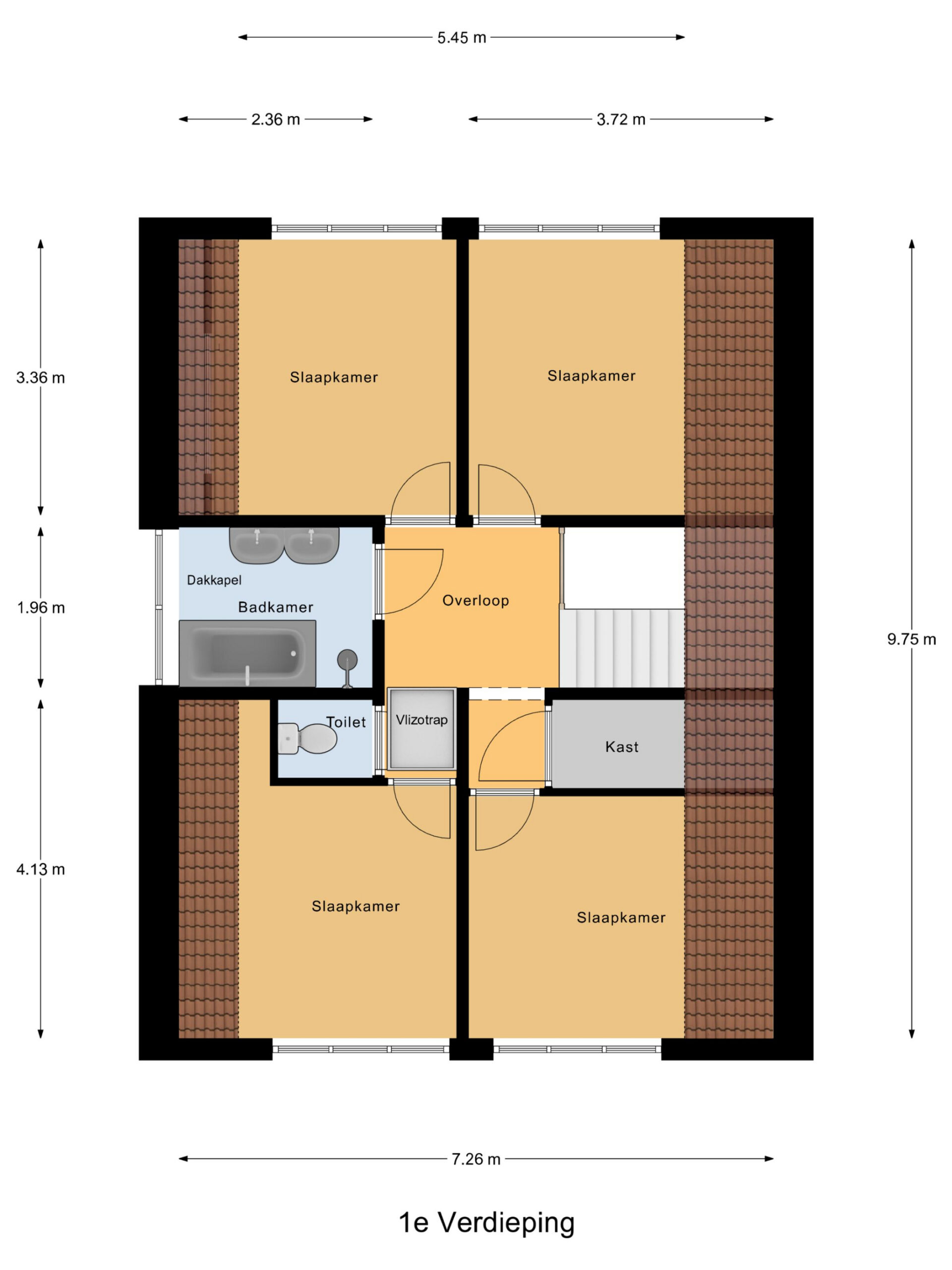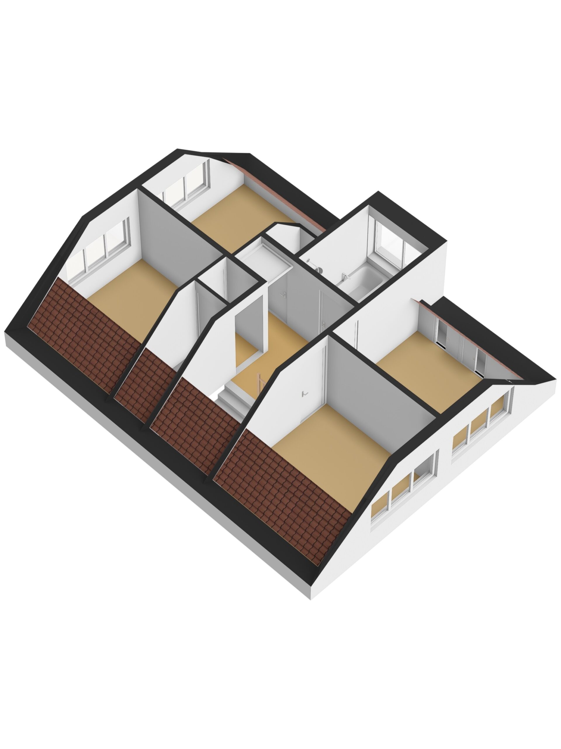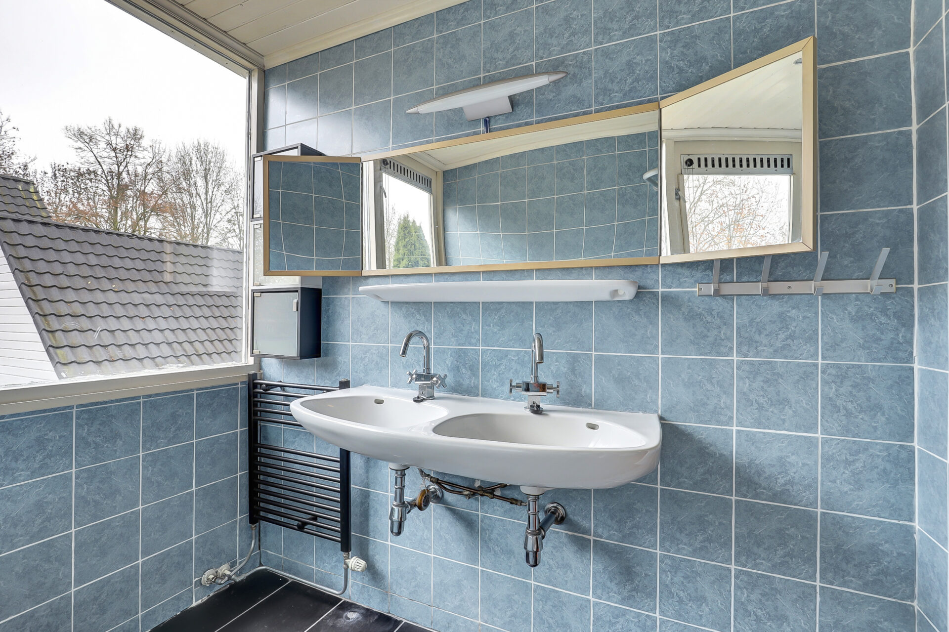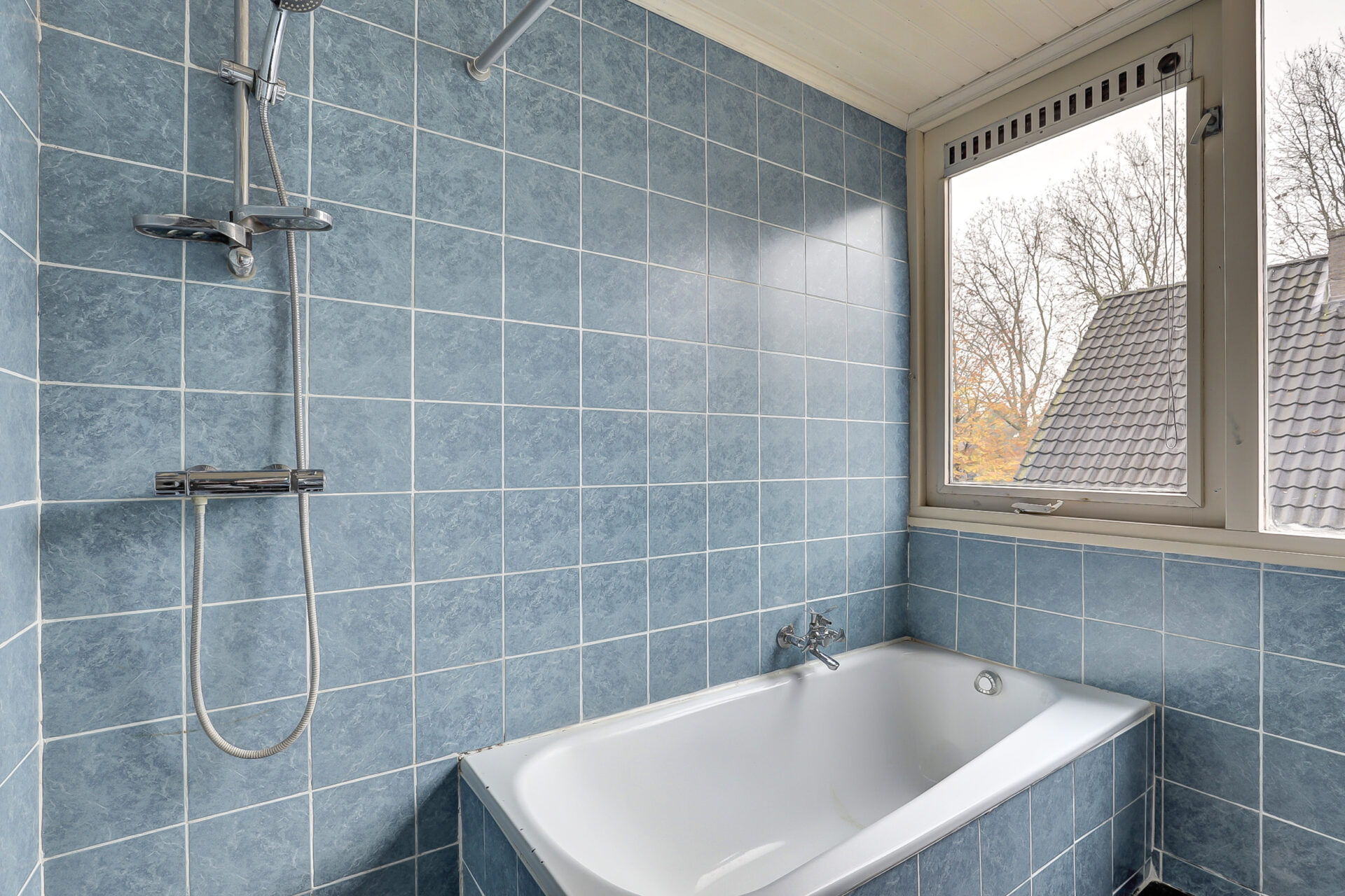 1e Verdieping: Overloop met aparte toiletruimte en inloopkast (berging), 4 prima slaapkamers en geheel betegelde badkamer met dakkapel voorzien van een ligbad, separate douche en dubbele wastafel.