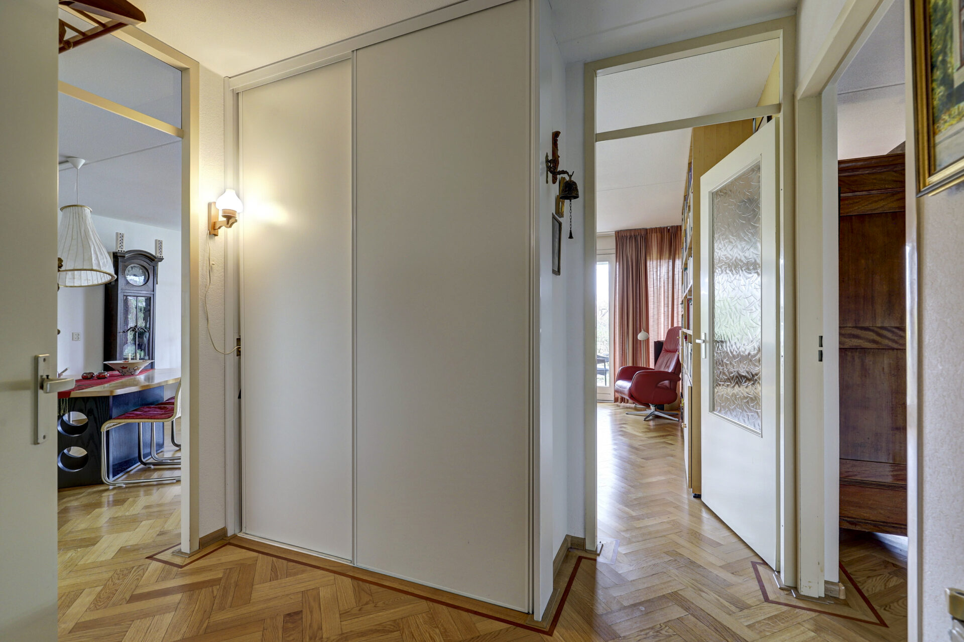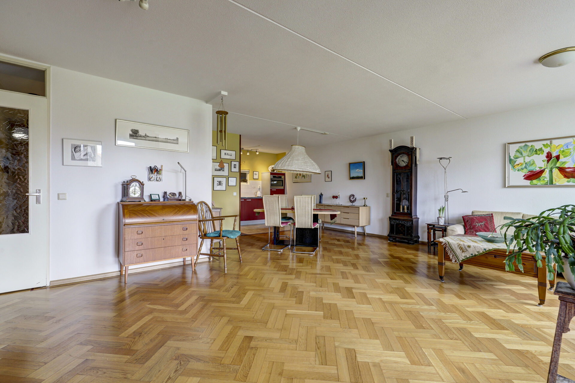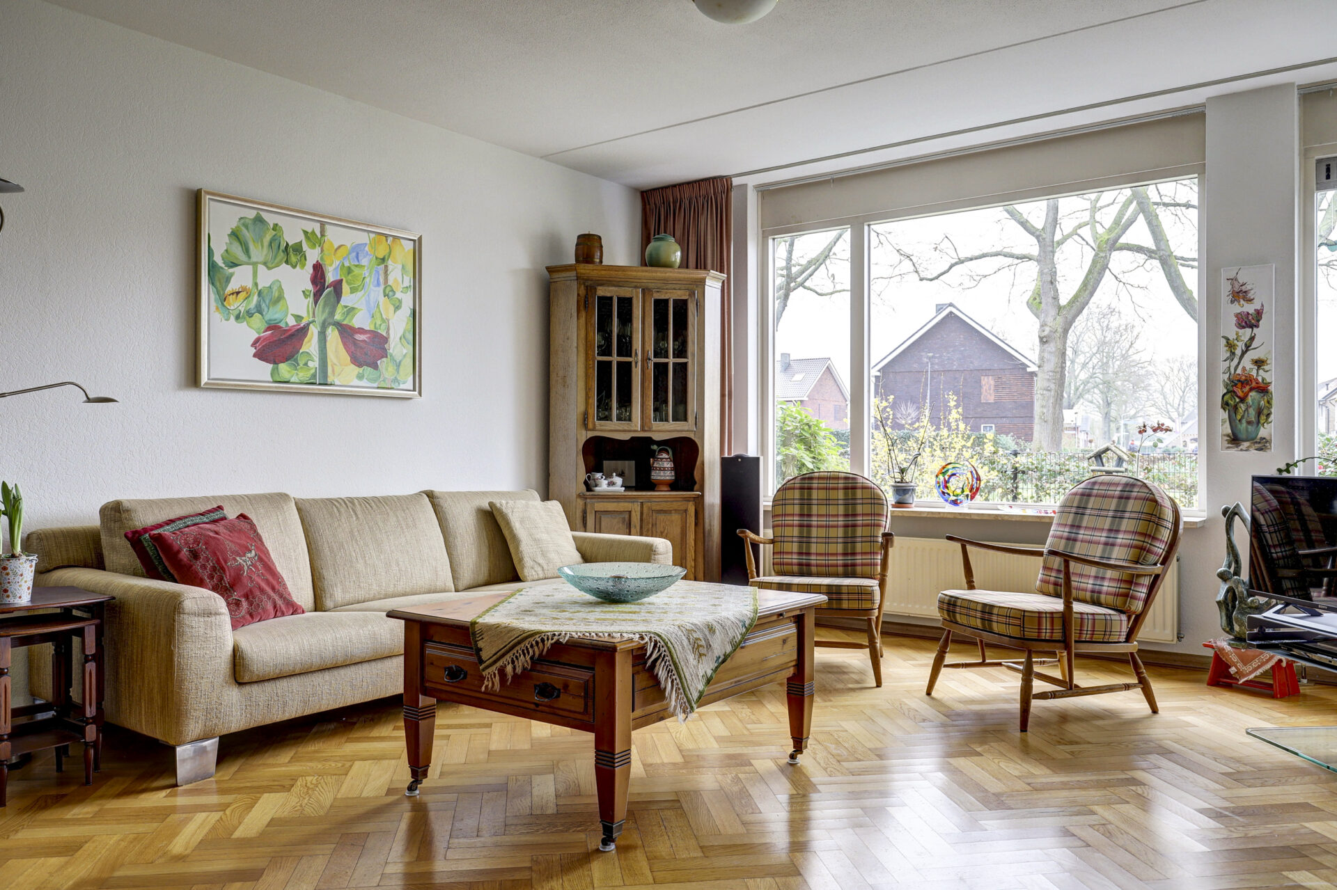 Hal, toiletruimte, praktische inpandige berging met opstelplaats wasmachine en droger en in de hal verder nog een garderobekast. Ruime lichte woonkamer met klassieke visgraat parketvloer met bies. De grote raampartijen zorgen voor prettig lichtinval en mooi zicht over de tuin, plantsoen en een paar markante Eikenbomen. Een ruime zithoek, gezellige leeshoek of even je administratie bijwerken aan de secretaire, voor elke moment een apart plekje beschikbaar.