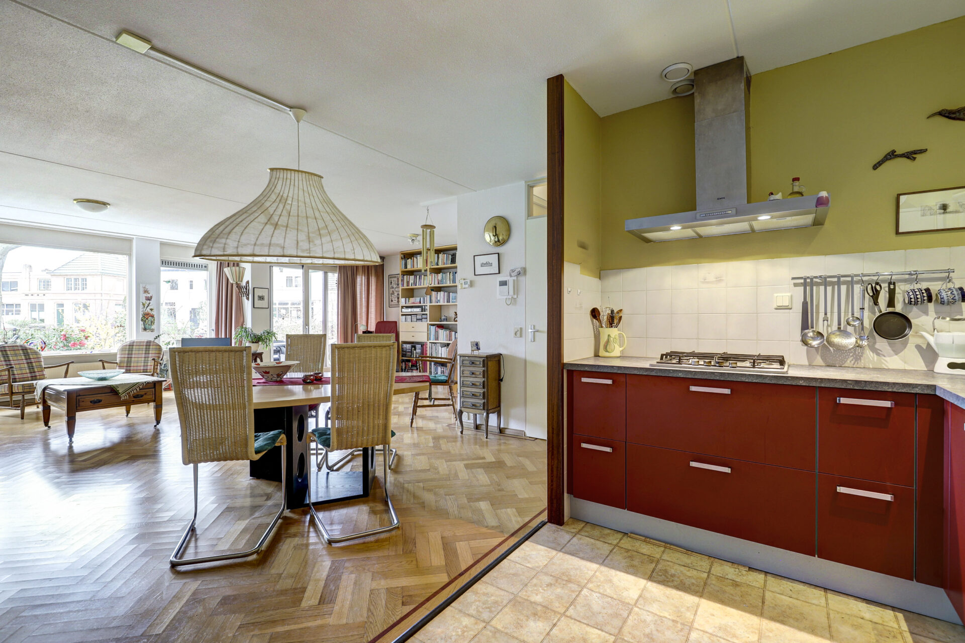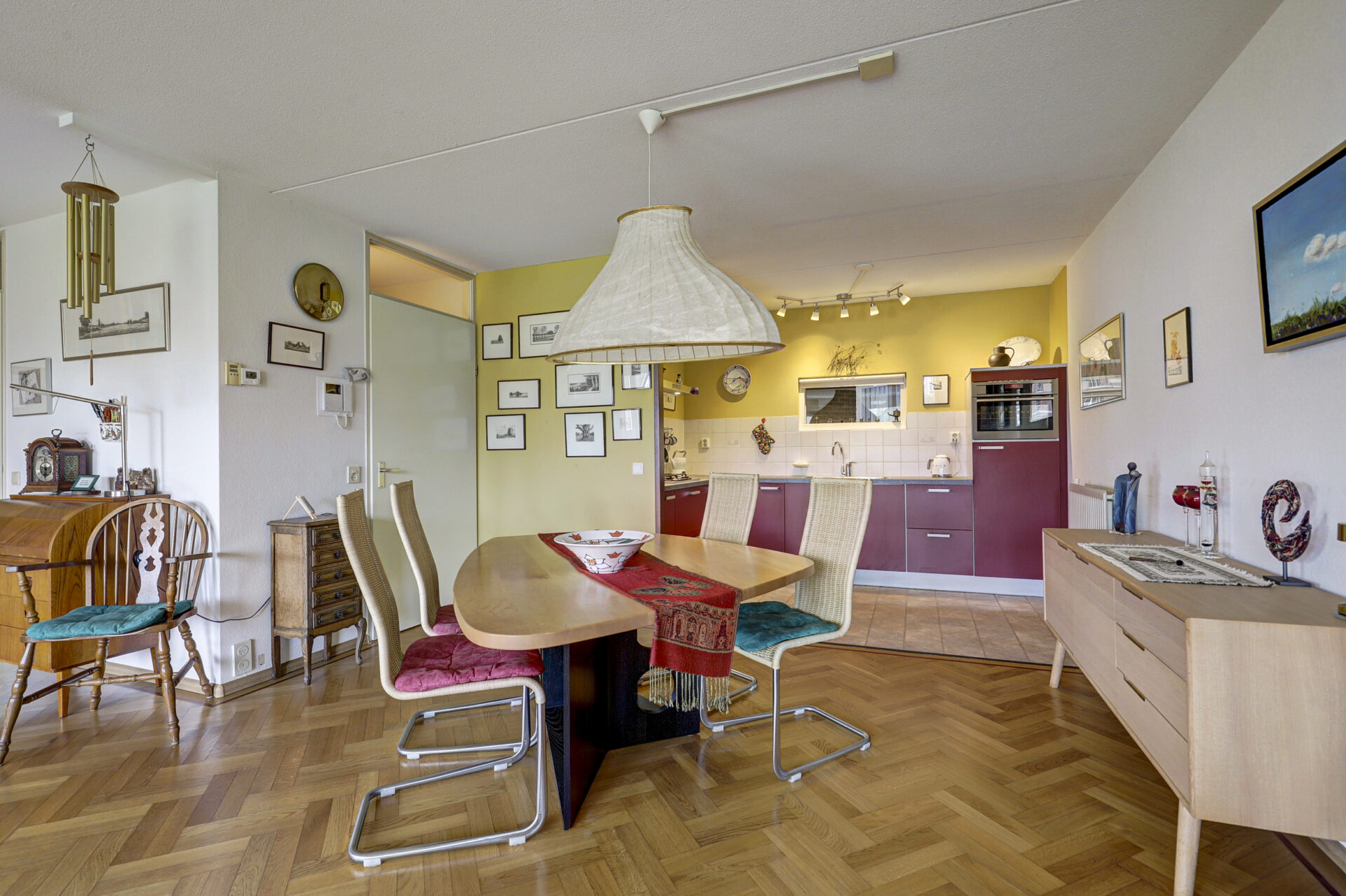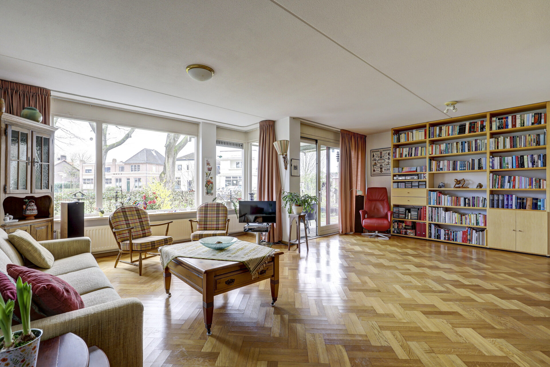 Hal, toiletruimte, praktische inpandige berging met opstelplaats wasmachine en droger en in de hal verder nog een garderobekast. Ruime lichte woonkamer met klassieke visgraat parketvloer met bies. De grote raampartijen zorgen voor prettig lichtinval en mooi zicht over de tuin, plantsoen en een paar markante Eikenbomen. Een ruime zithoek, gezellige leeshoek of even je administratie bijwerken aan de secretaire, voor elke moment een apart plekje beschikbaar.
