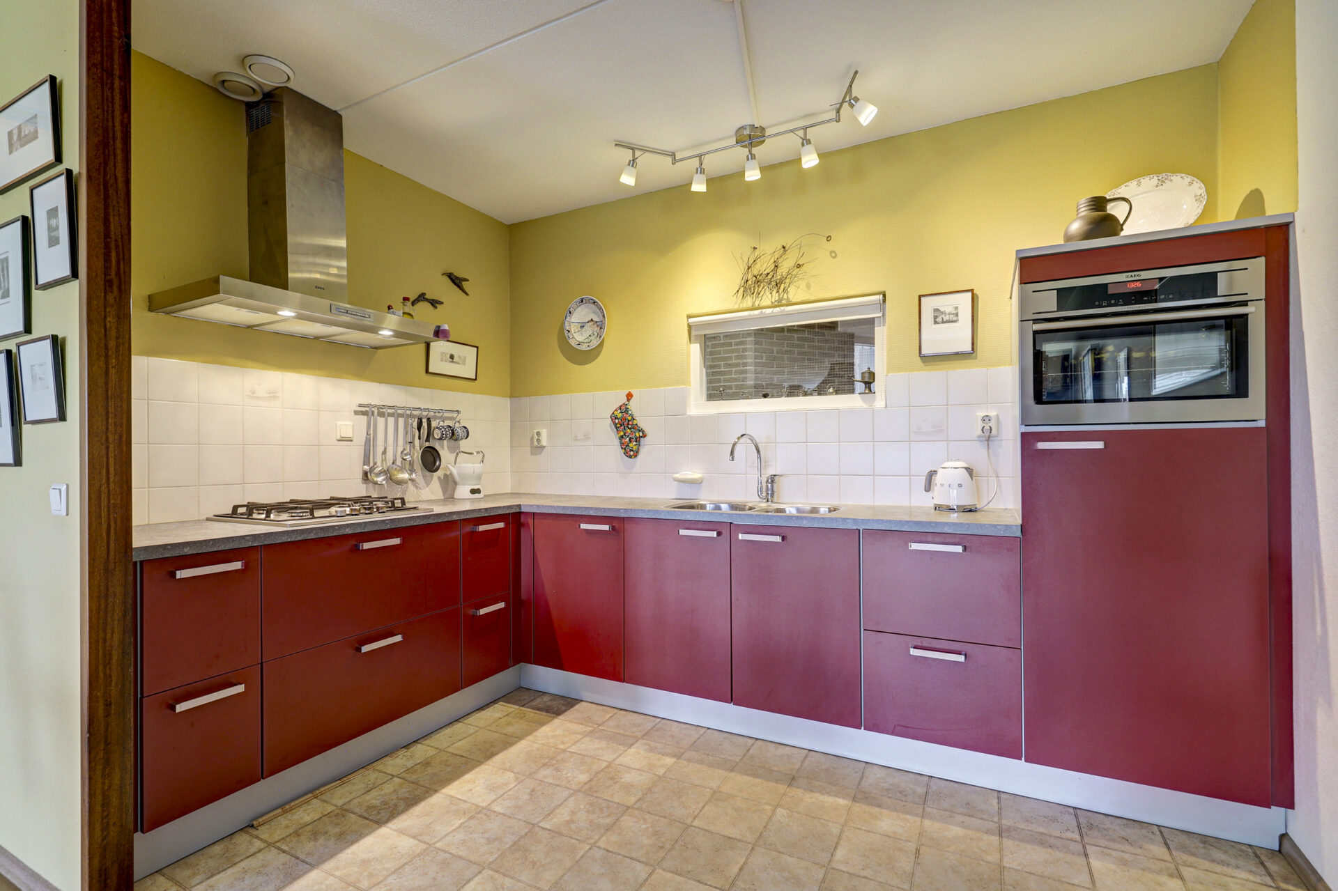 Open keuken met nette inrichting en voorzien van diverse inbouwapparatuur. Schuifpui naar overdekt terras en de ruime tuin op het zuidoosten.