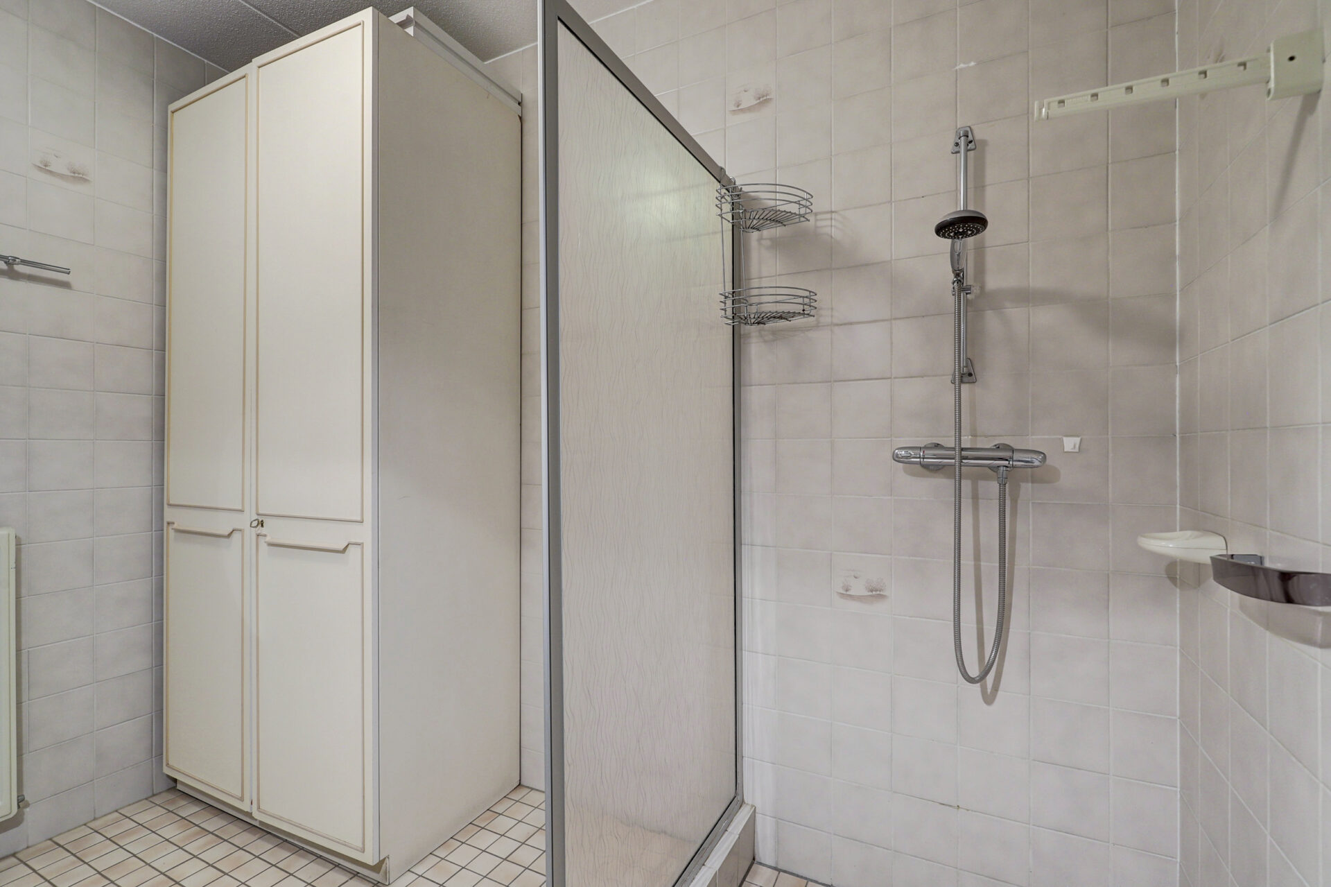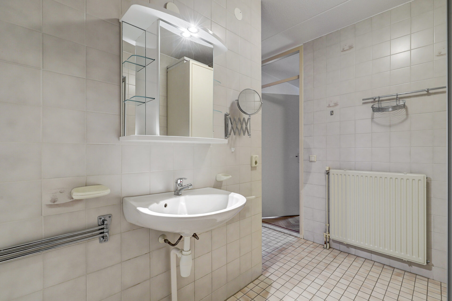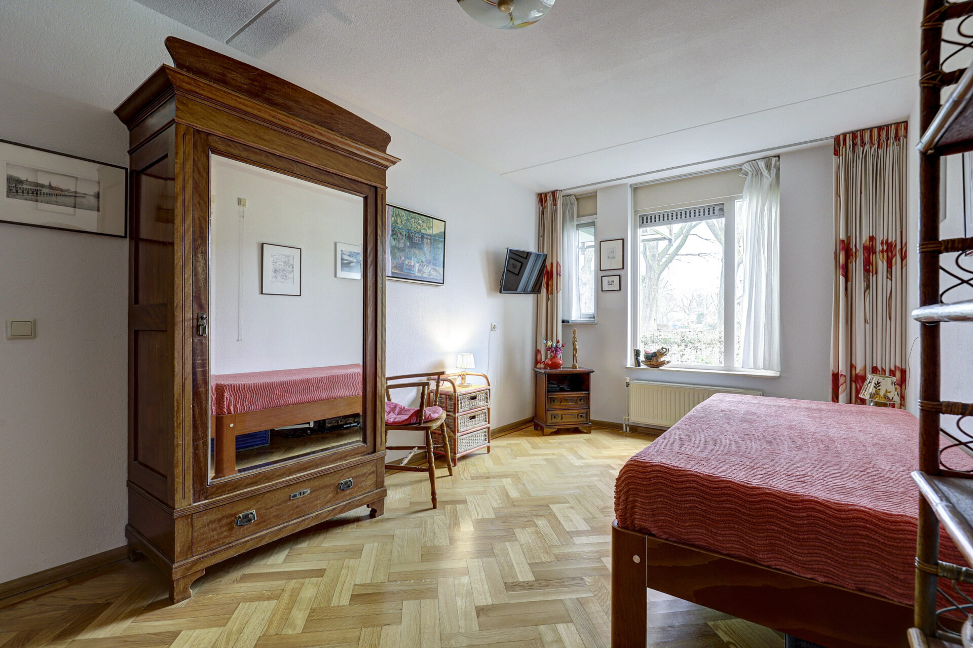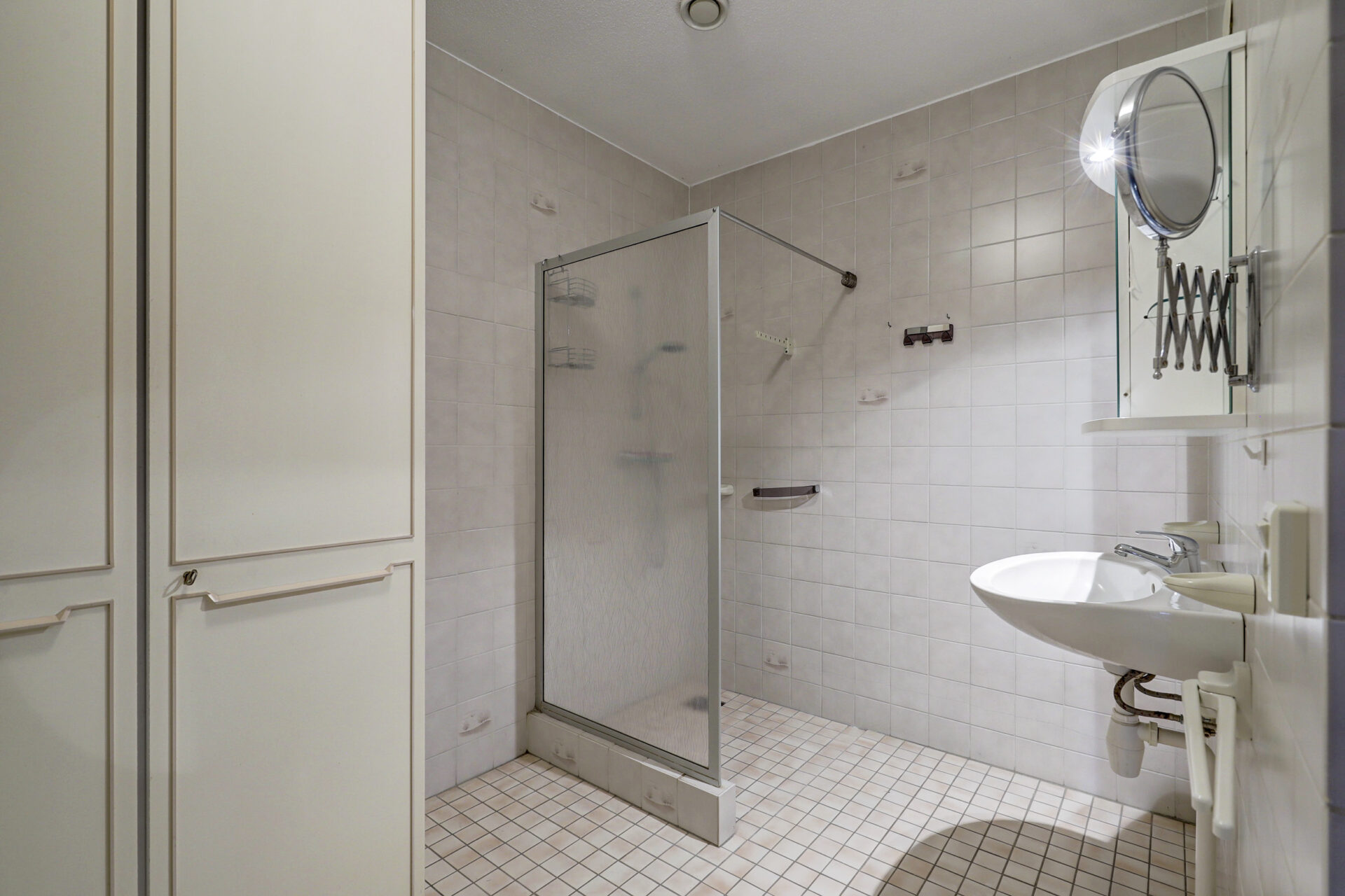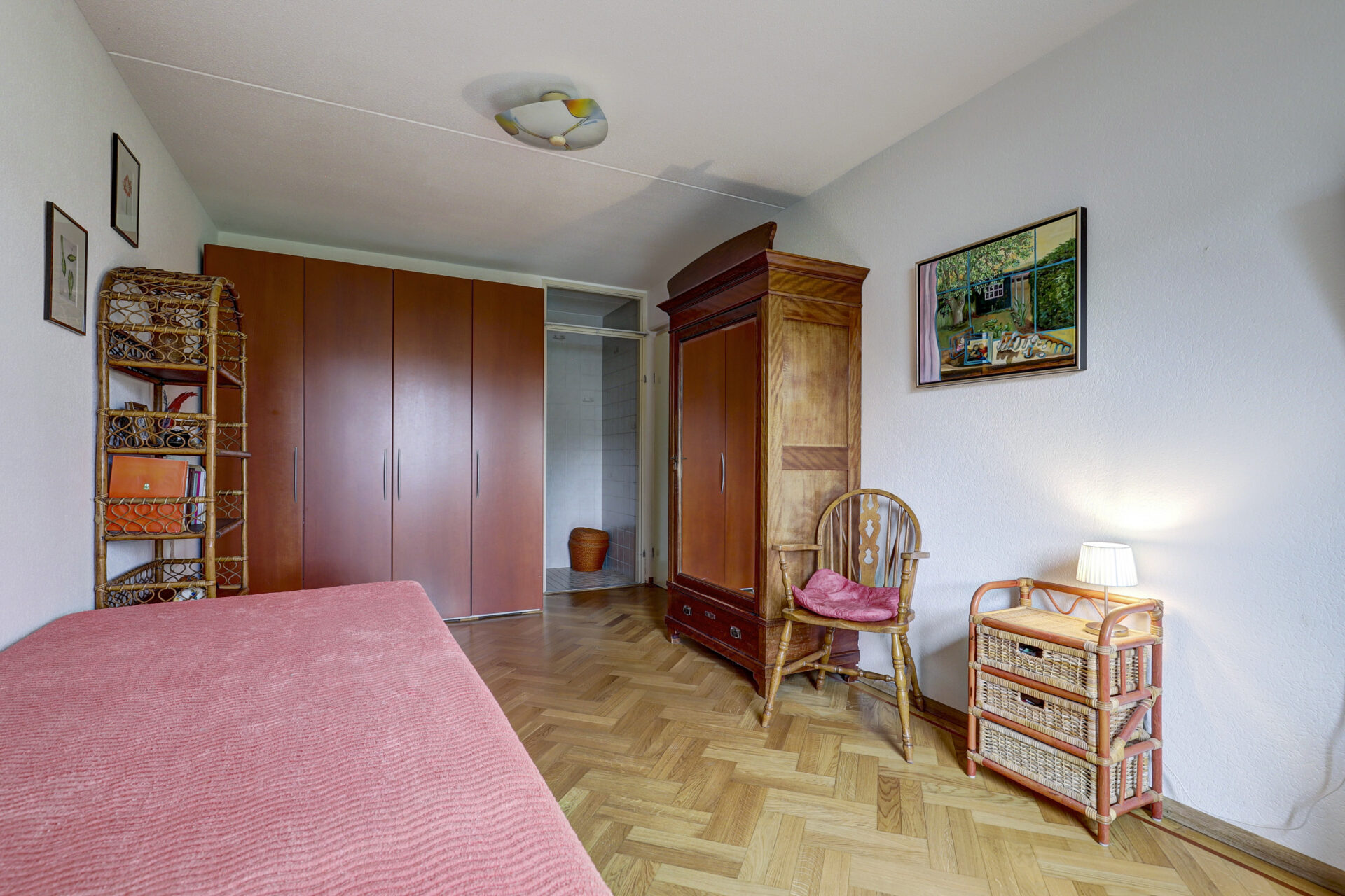 Royale slaapkamer grenzend aan de tuinzijde. Geheel betegelde nette maar eenvoudige badkamer met doucheruimte voorzien van een douchewand, wastafel en spiegelkastje.