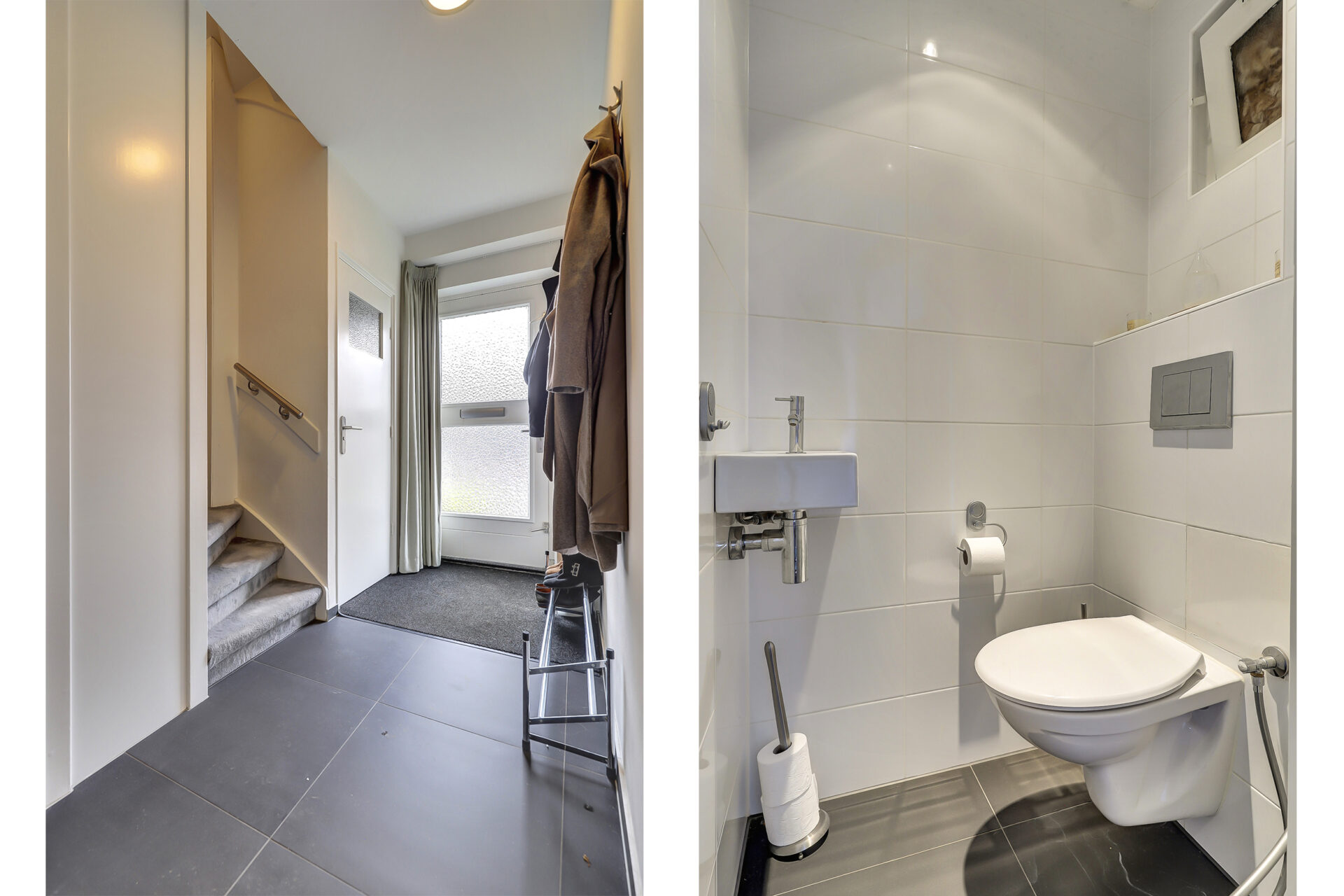 Begane grond: Entree/hal, toilet (wand-closet met verwarmd bidet), trapopgang, praktische kelderkast waar ook de moderne meterkast is gesitueerd.
