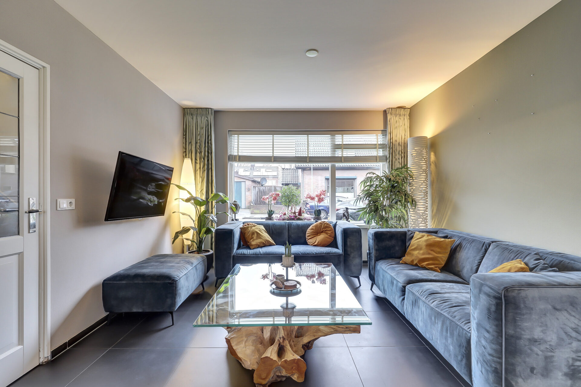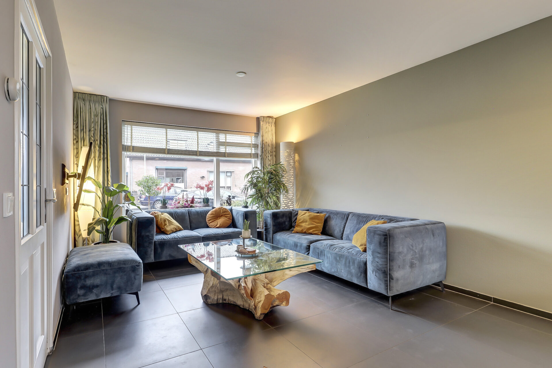 De begane grond is volledig voorzien van een moderne natuurstenenvloer met vloerverwarming.