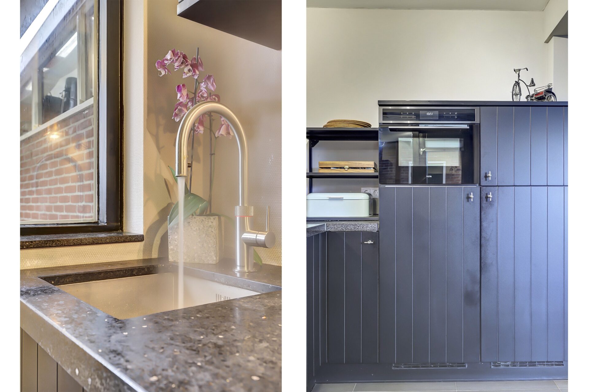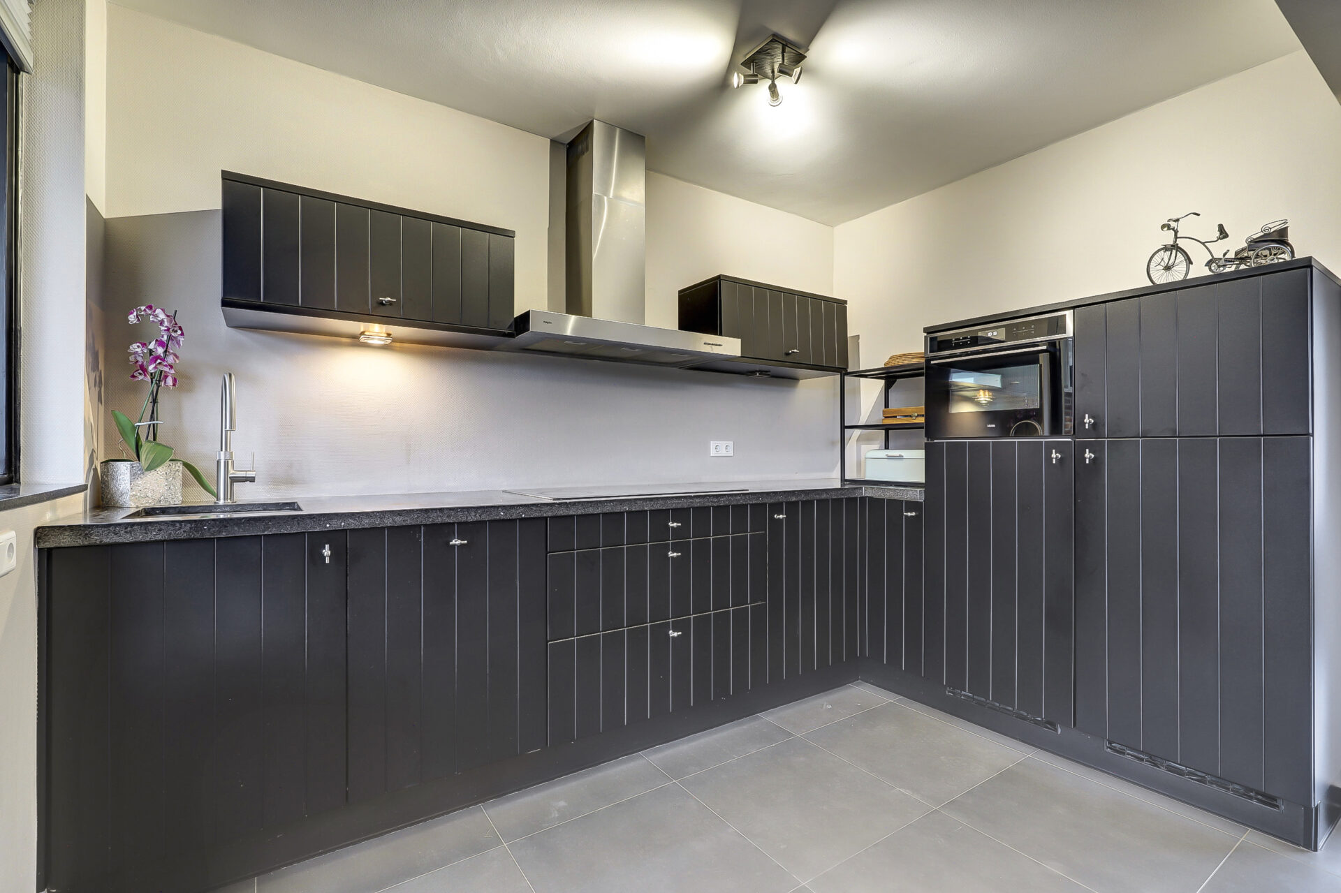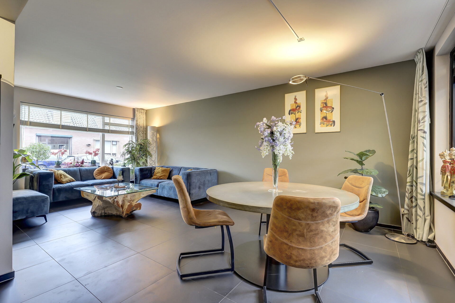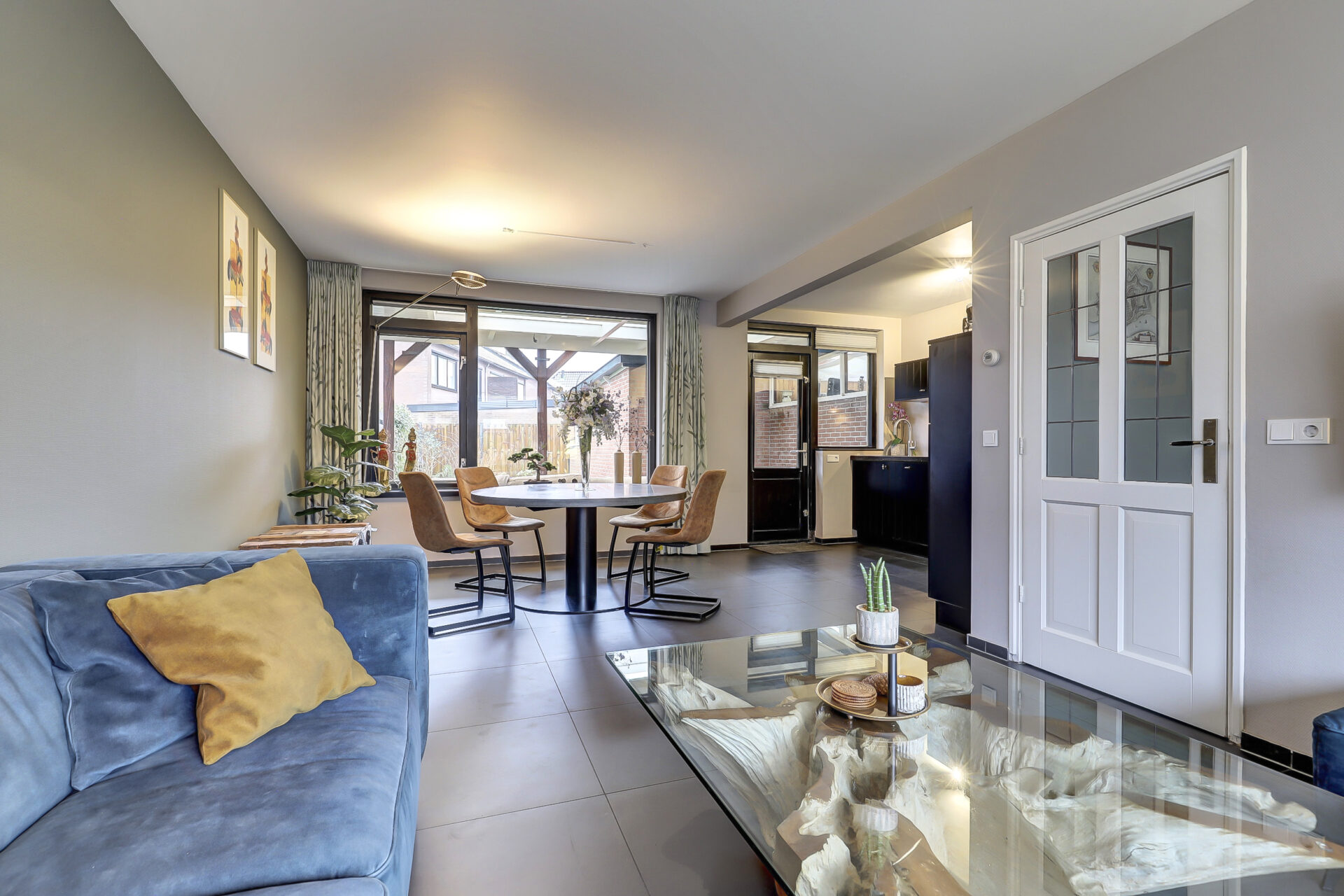 Lichte doorzon woonkamer met de zithoek aan de voorkant en het eetgedeelte aan de achterkant. In zwart uitgevoerde open keuken in L-opstelling voorzien van diverse inbouwapparatuur (Combi-oven, vriezer, koelkast, vaatwasser, 5-pits keramische kookplaat en afzuigkap) Quooker kraan en een Terrazzo aanrechtblad. Vanuit de keuken stap je heerlijk overdekt het terras op