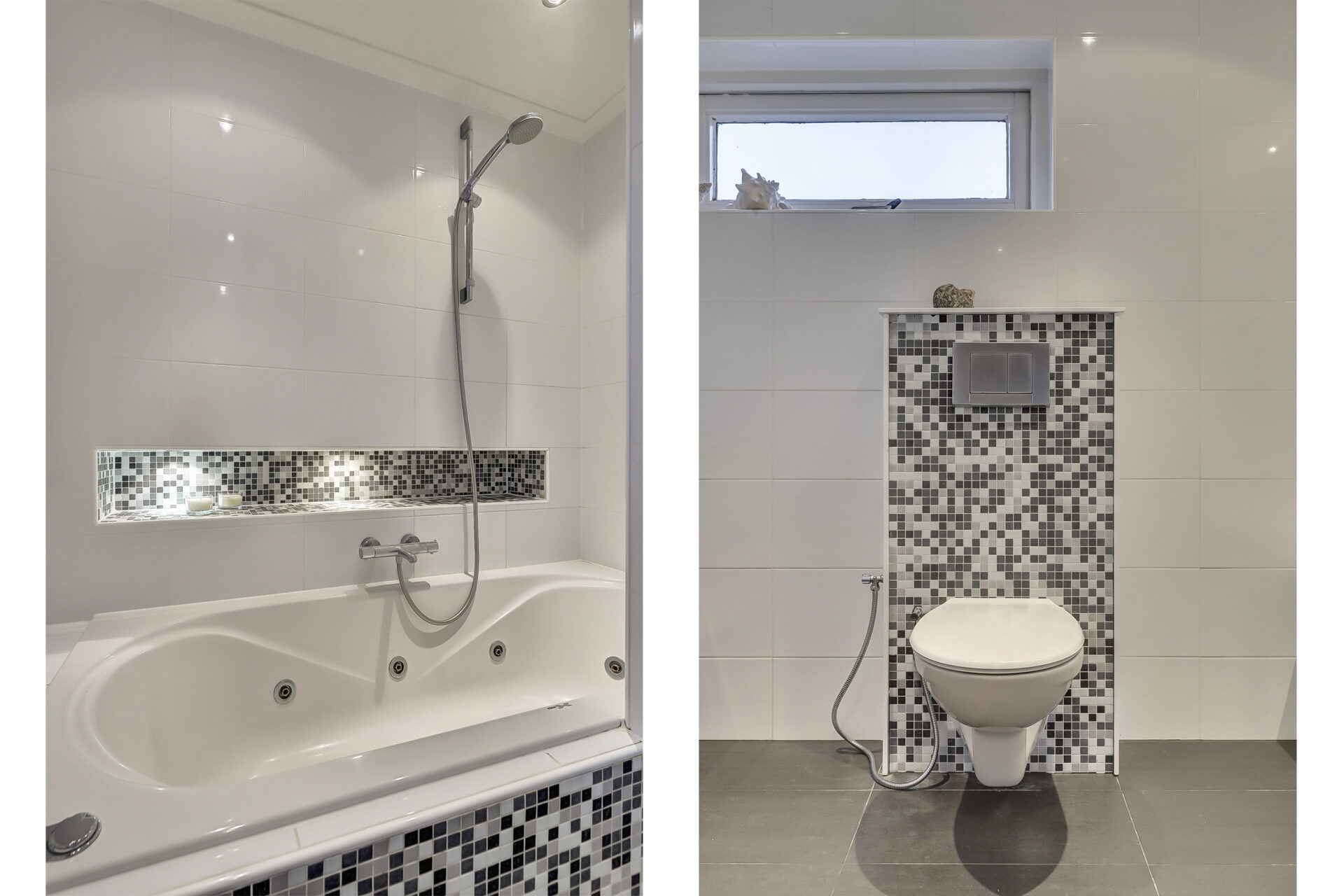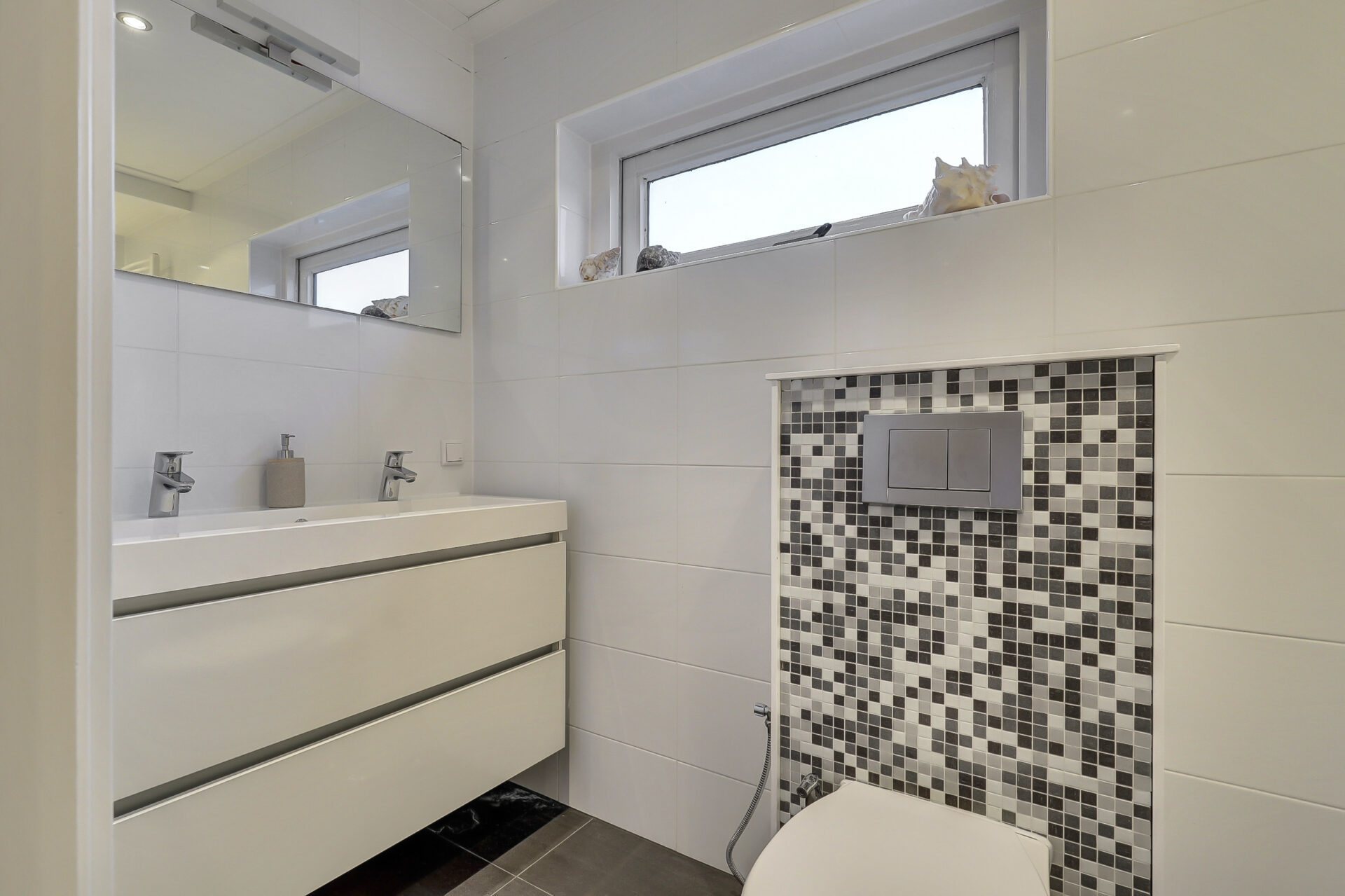 badkamer met een dubbele wastafel, een toilet (hangcloset met verwarmd bidet), een stijlvolle designradiator en een comfortabel ligbad- / douchecombinatie met Hydrojet.