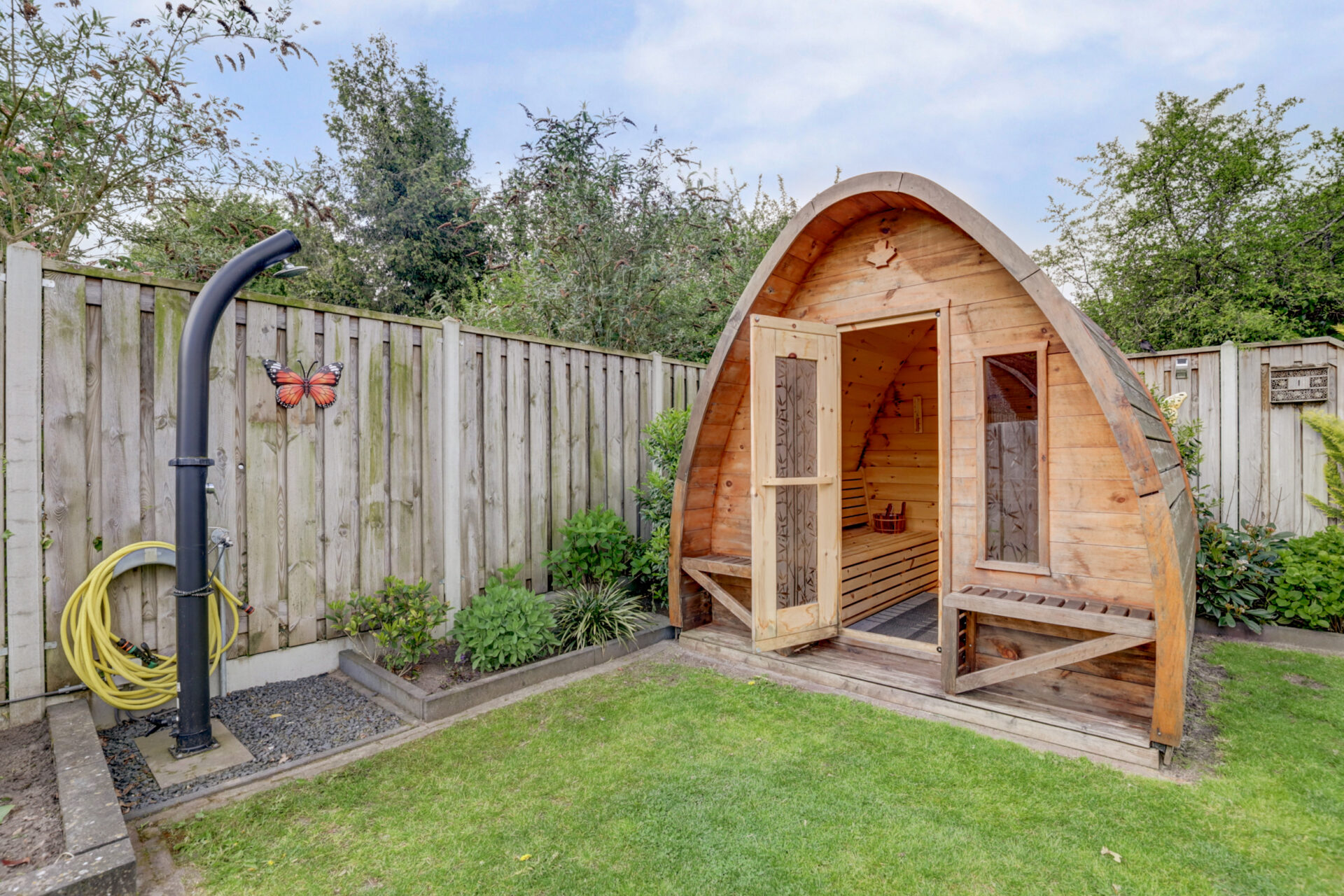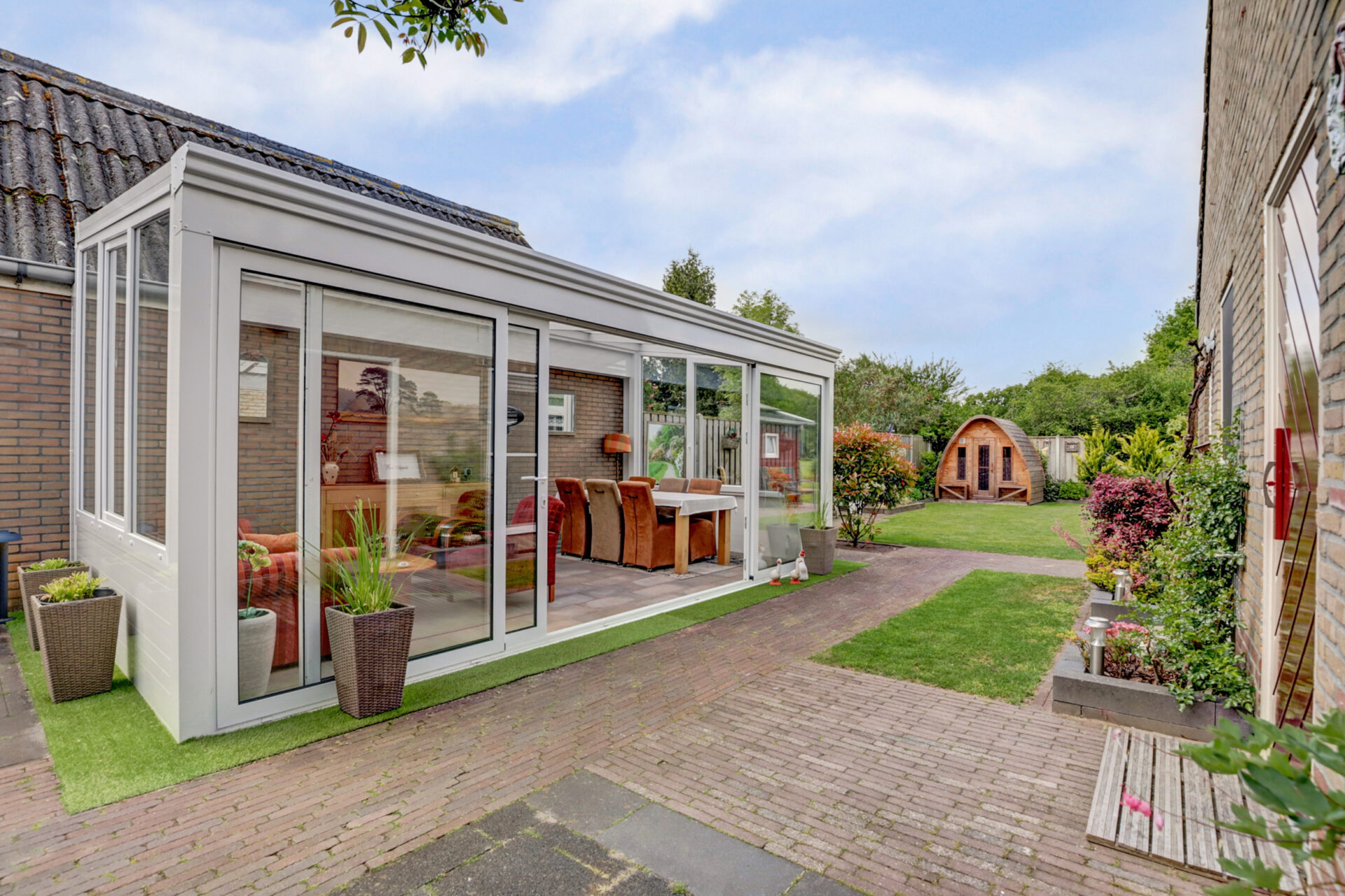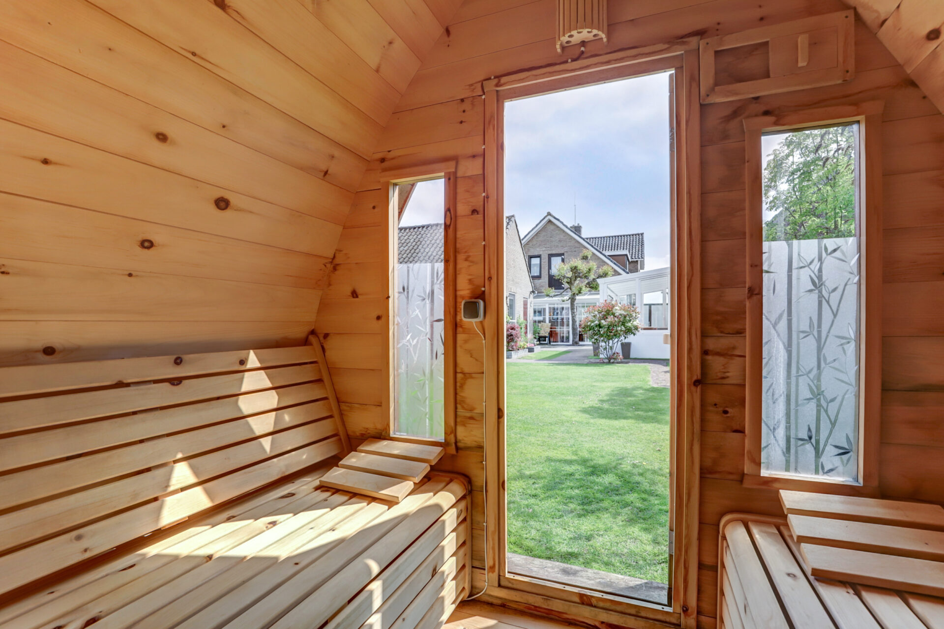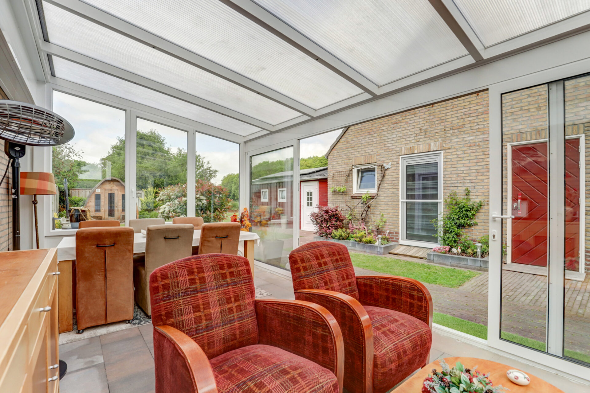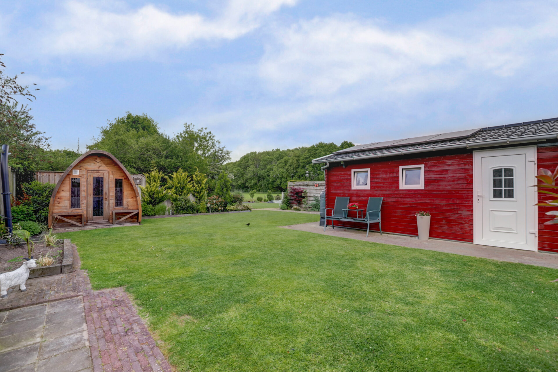 De gezellige woonkamer met pelletkachel vormt het hart van het huis – een fijne plek om samen te komen en te ontspannen. De afgesloten keuken, is in 2018 vernieuwd en voorzien van een moderne inrichting en gebruikelijke inbouwapparatuur. Vanuit de keuken is er direct toegang tot de tuinkamer (serre). Vanuit hier kijkt u prachtig uit over de diepe, fraai aangelegde tuinen en besloten terras. Aparte terrasoverkapping die geheel af te sluiten is in de koele maanden of open te zetten als het zonnetje schijn. De tuin is grotendeels een gazon met borders. De Sauna is een welkome aanvulling om lekker te ontspannen. Een deel van de achtertuin is ingericht met een 20-tal zonnepanelen.